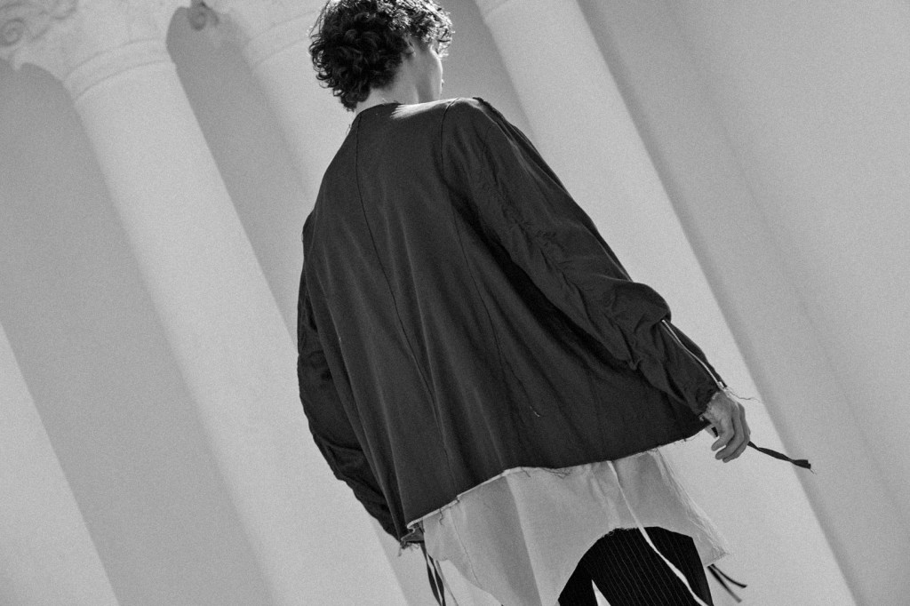 今シーズンはカーテンのように軽やかでそれこそ着ていることを忘れる様な素材に着目していました。強さというよりは品の良い柔和さや脱力感。つまるところ素材のイメージ先行で今までとは少し違うプロセスを踏んでみたわけです。ASKYYもASKYYの範囲内でゆるいバランスを展開していますが、そのムードやテンションは必然的に素材の選定にも影響を与えるに至りました。