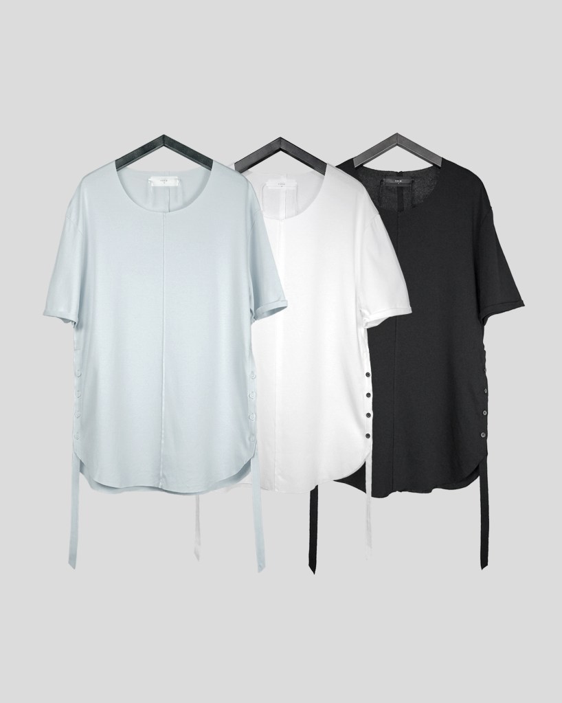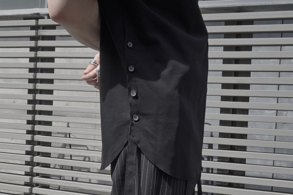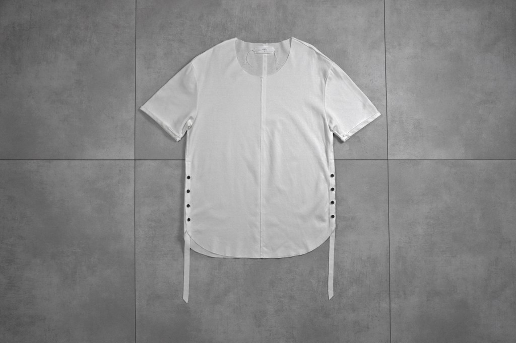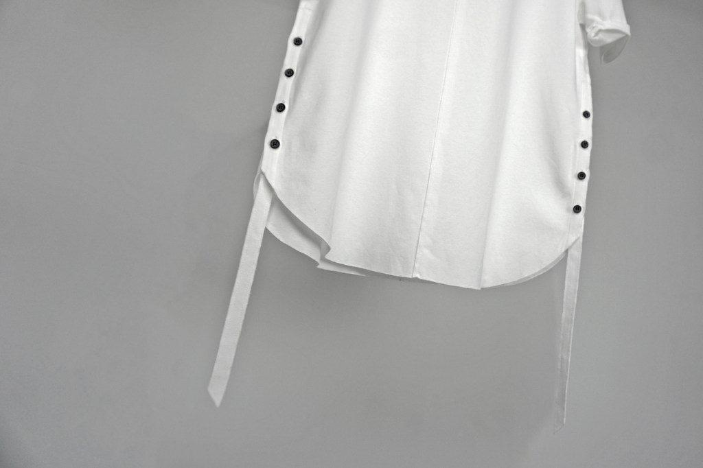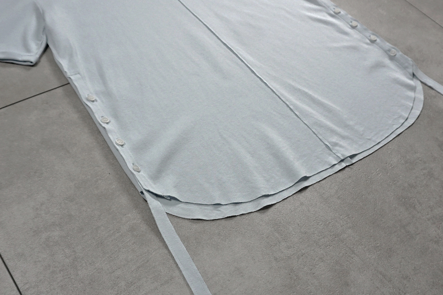 サイドボタンと垂れたコード部分が他のカットソーとの差別化を図る箇所。
