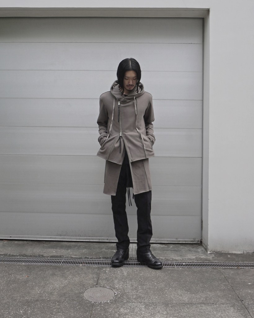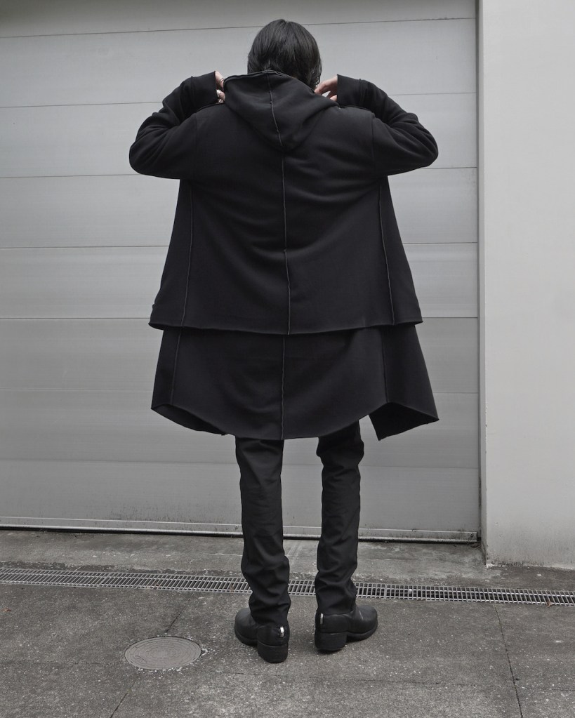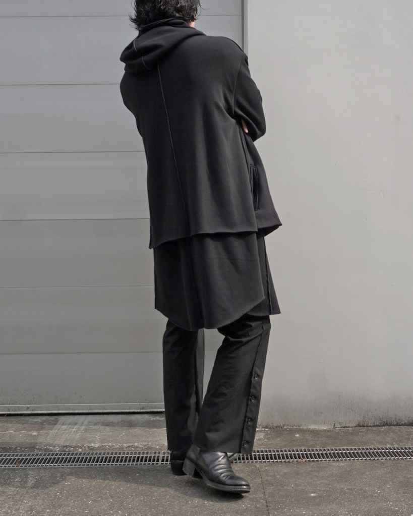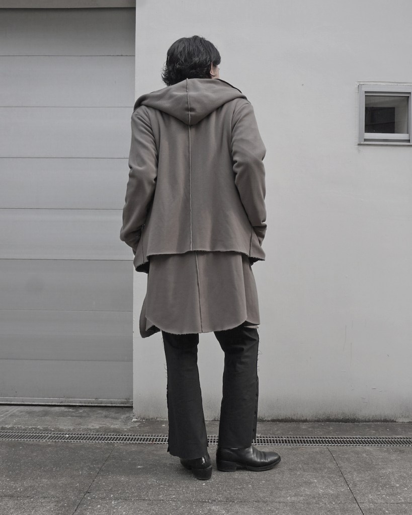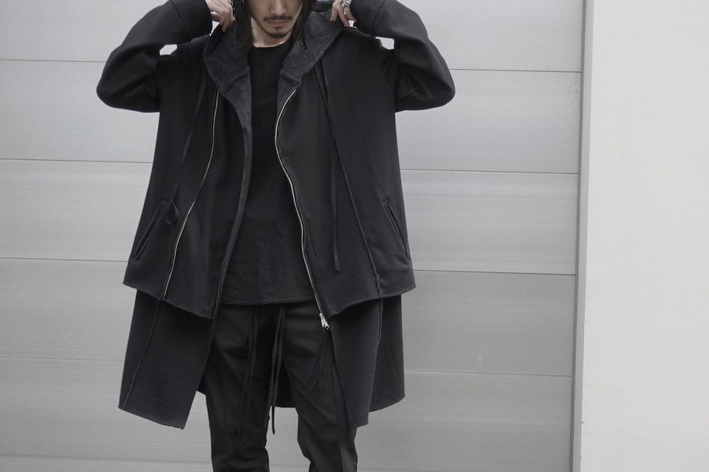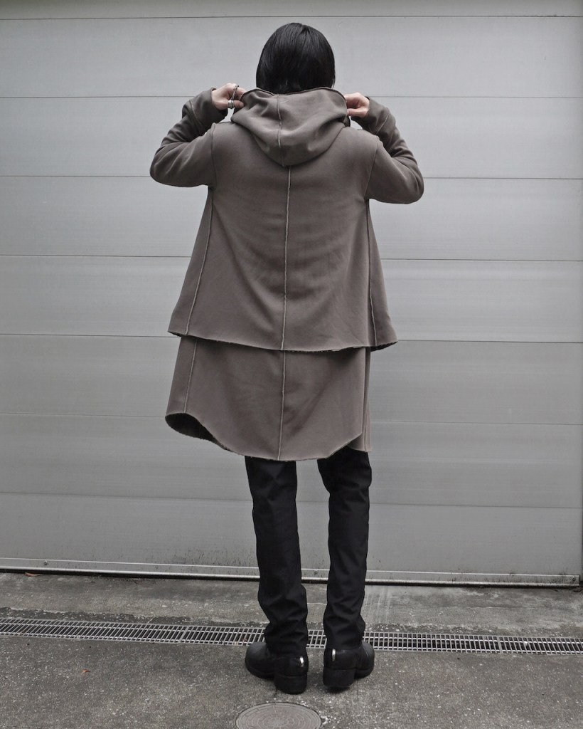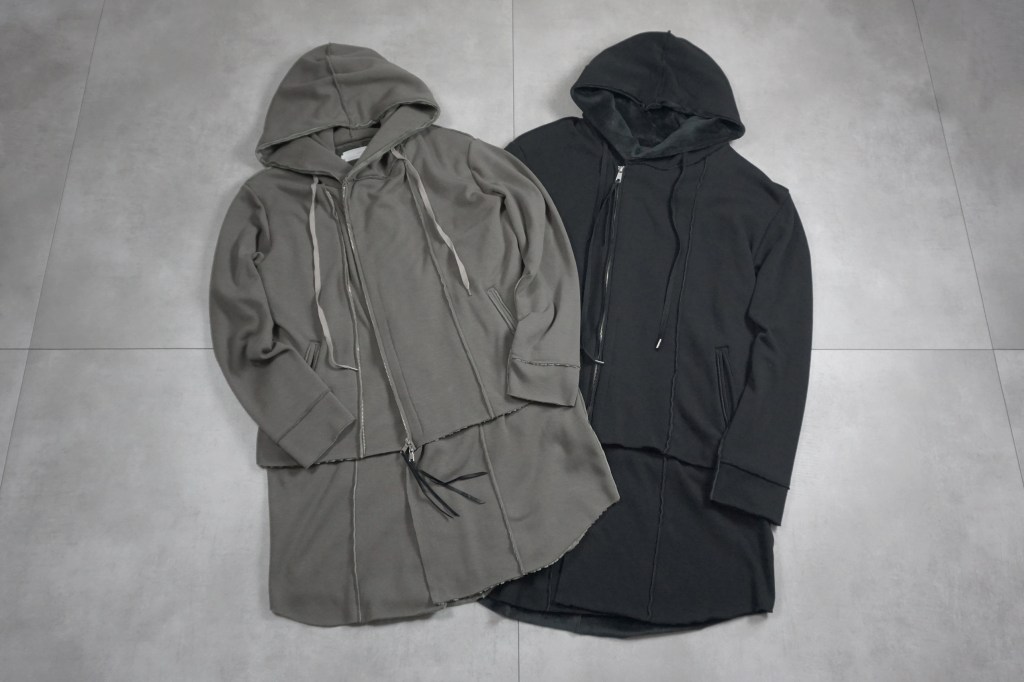 その後軽めのアウター素材で制作し(「LAYERED HOODIE COAT」)、