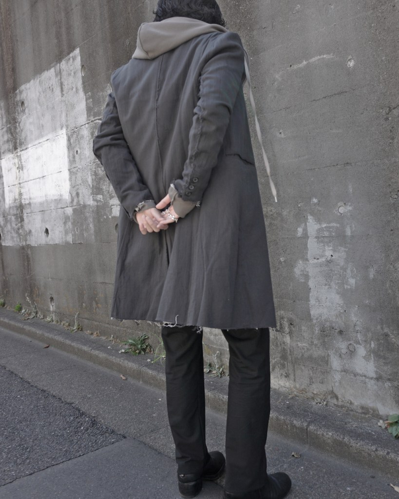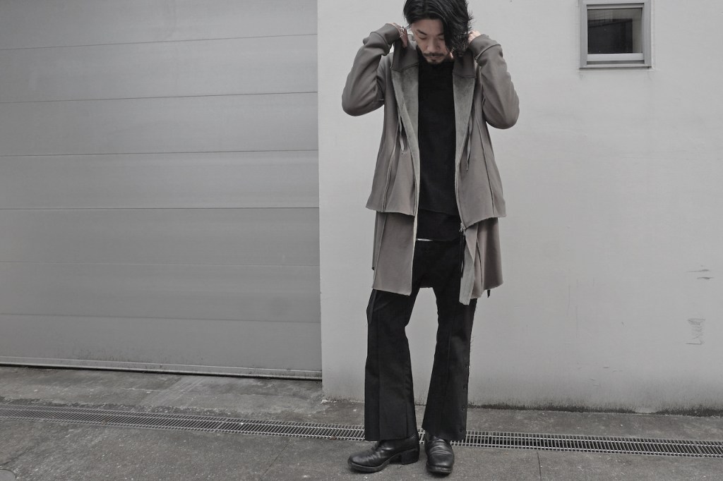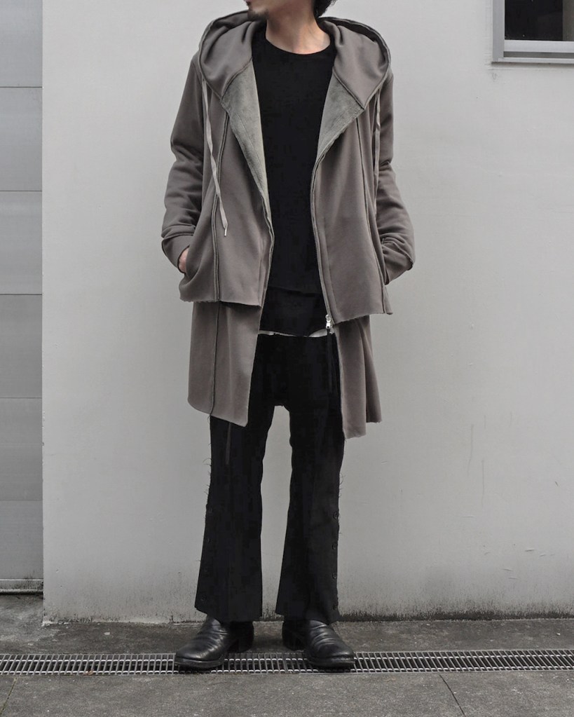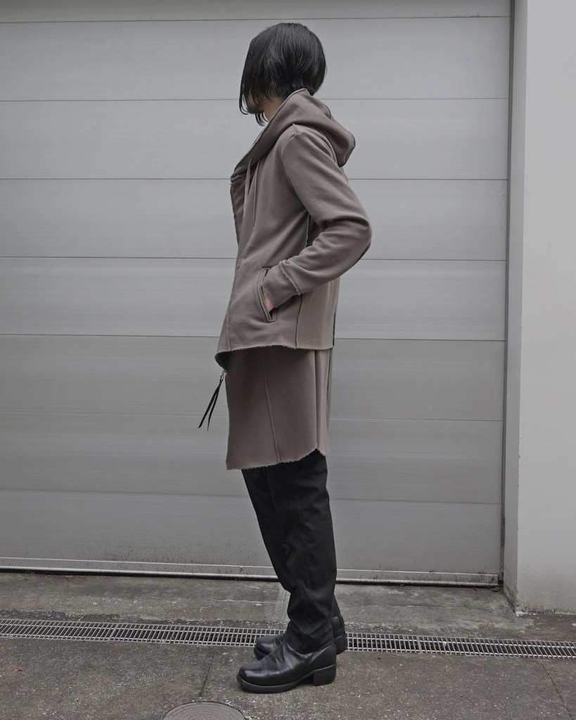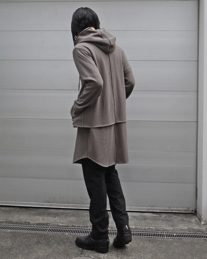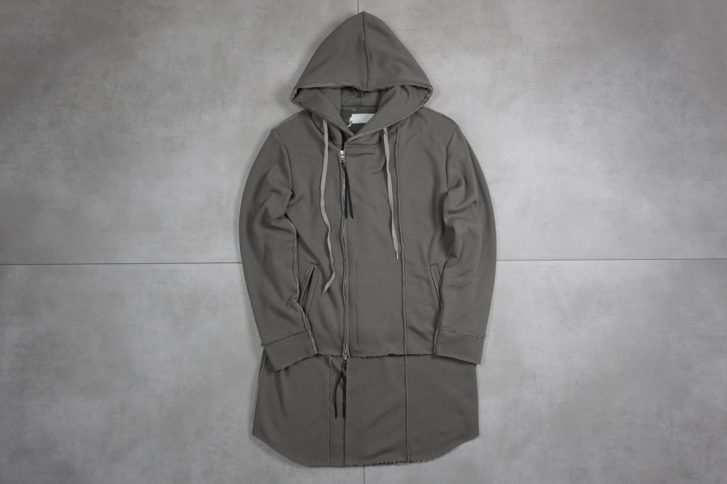 その後軽めのアウター素材で制作し(「LAYERED HOODIE COAT」)、