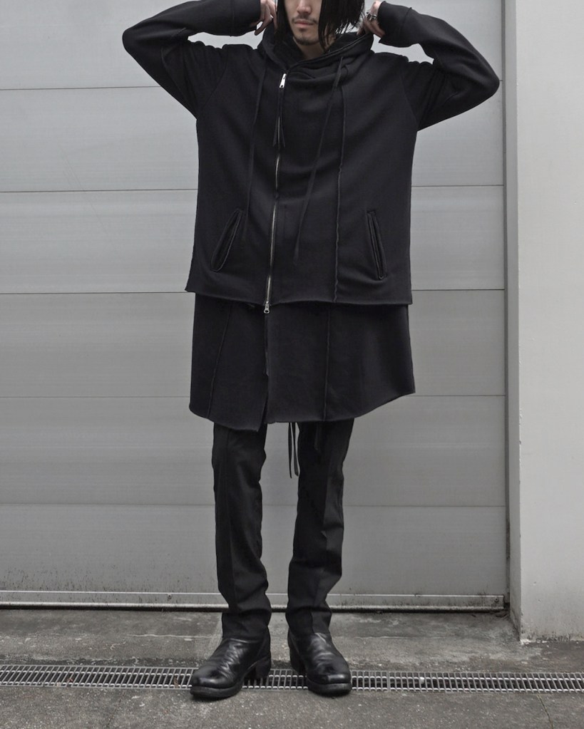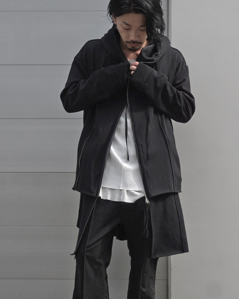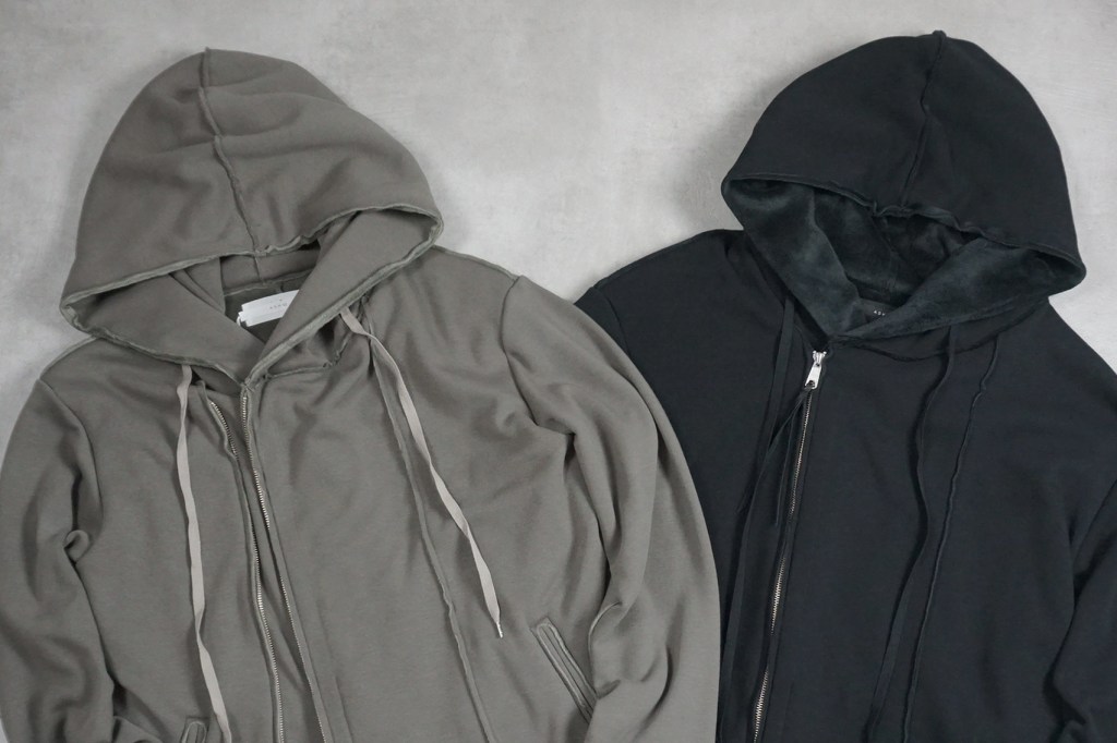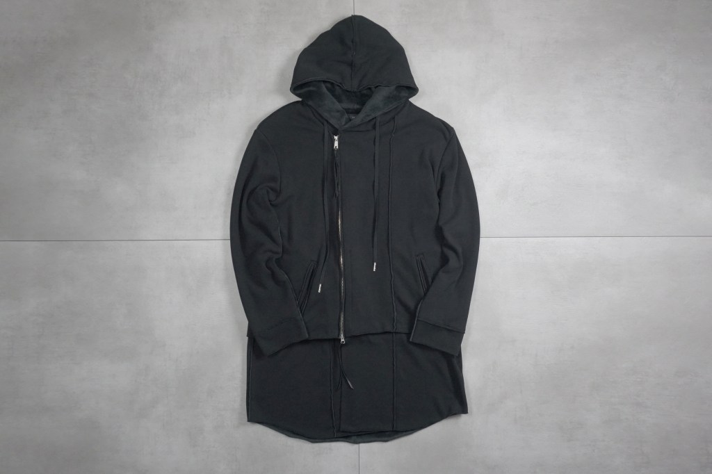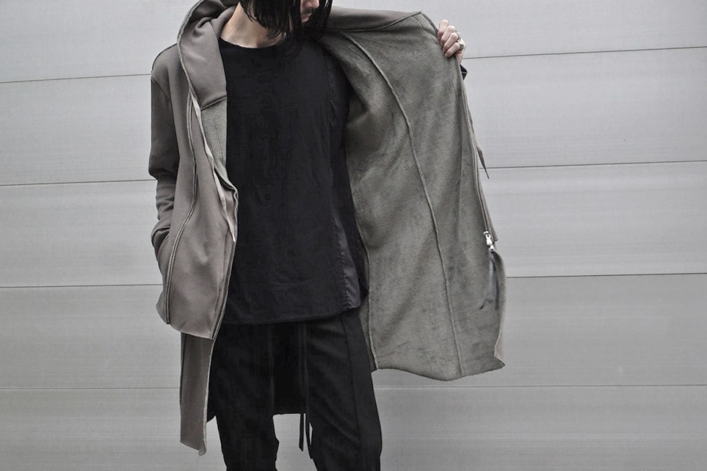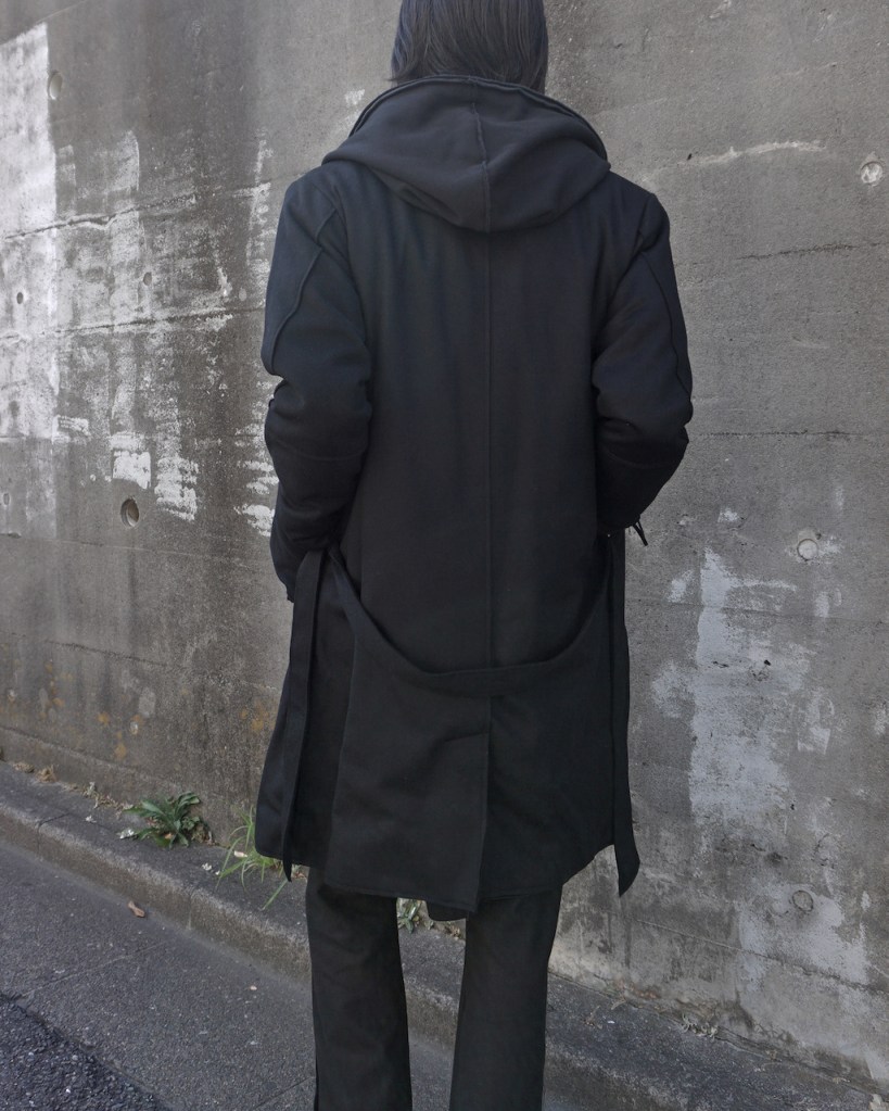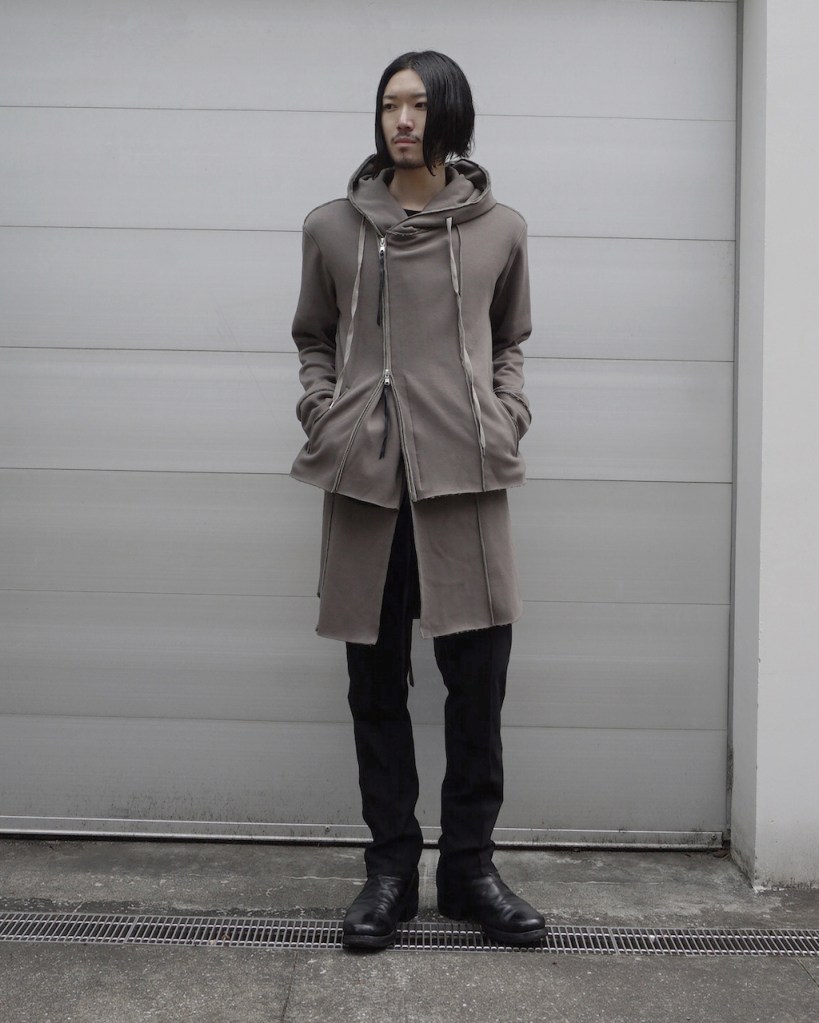 その後軽めのアウター素材で制作し(「LAYERED HOODIE COAT」)、