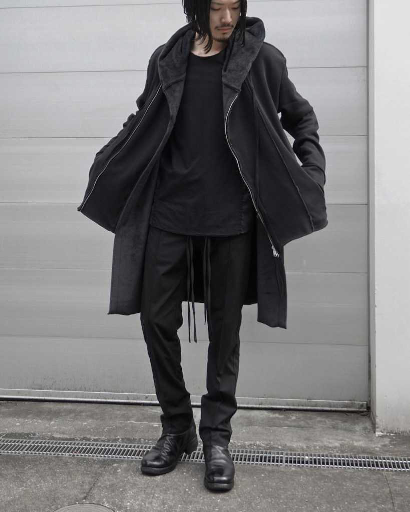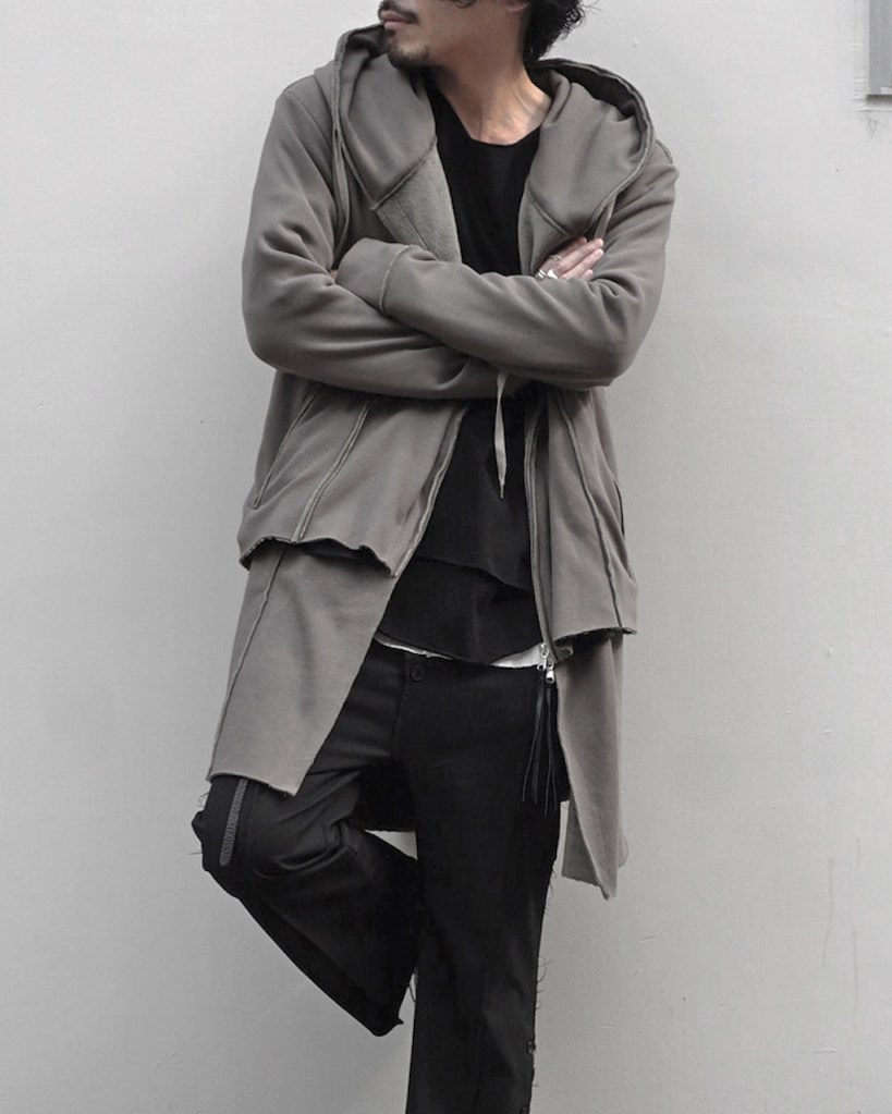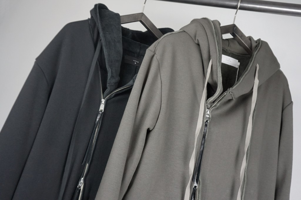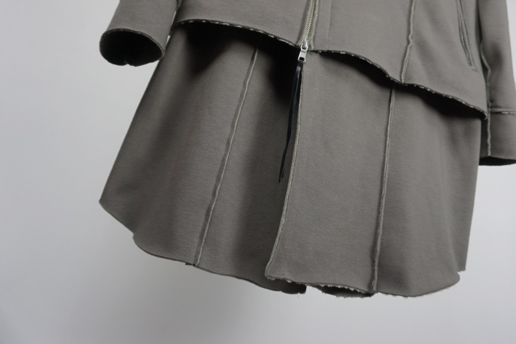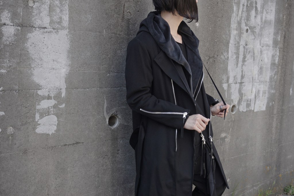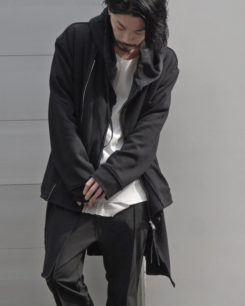 その後軽めのアウター素材で制作し(「LAYERED HOODIE COAT」)、