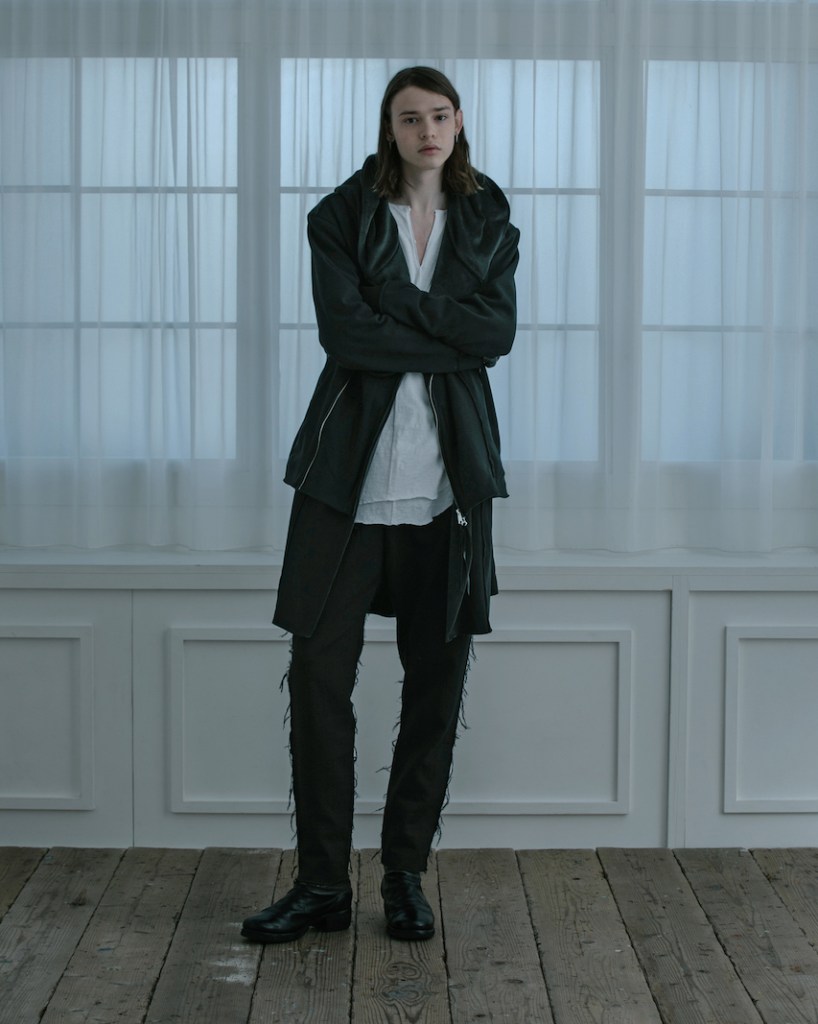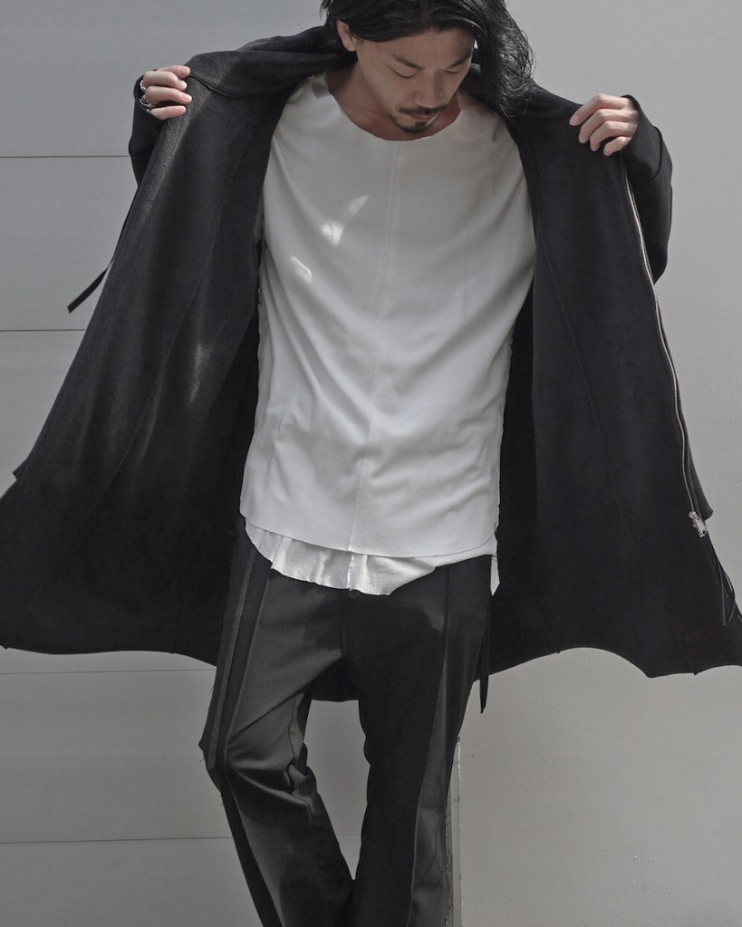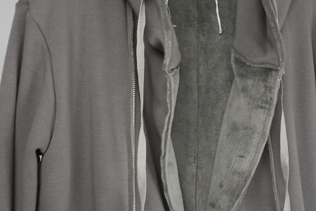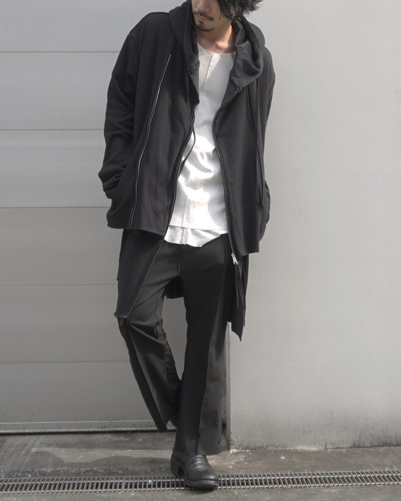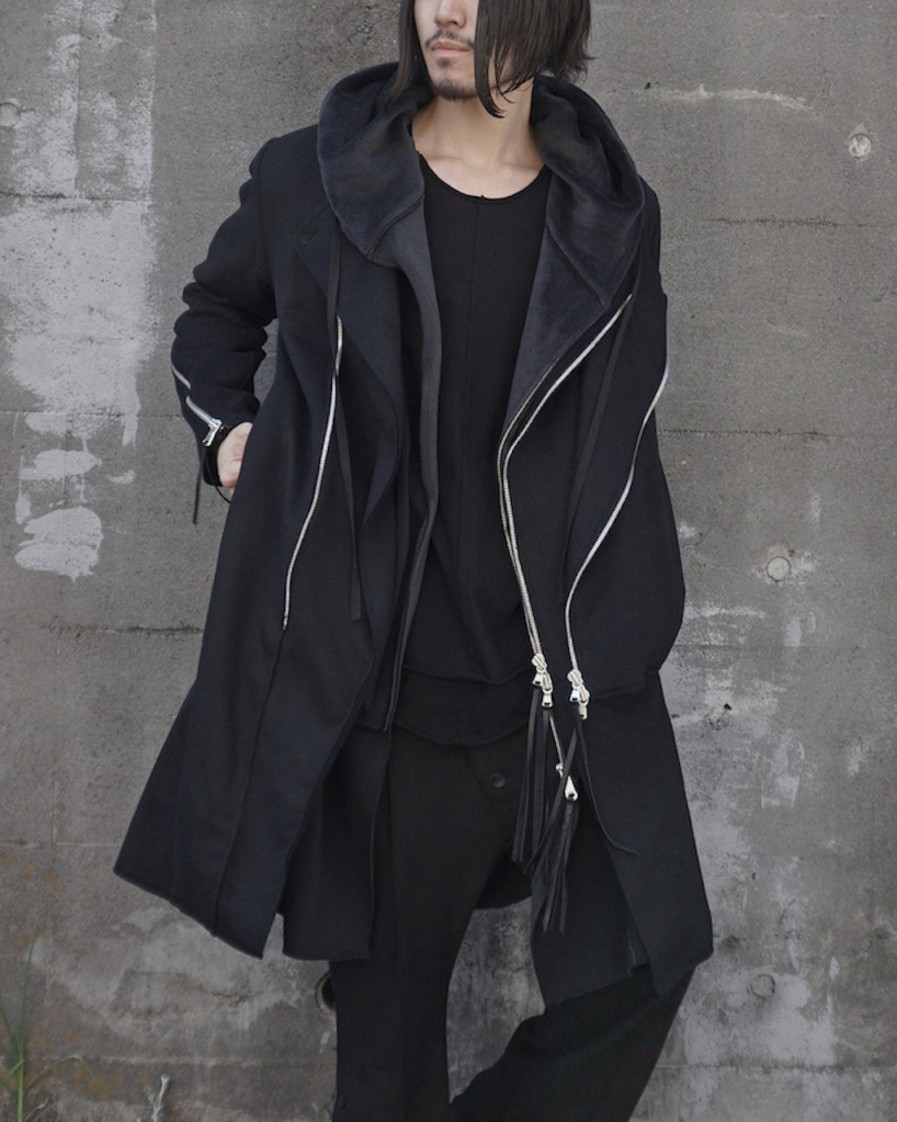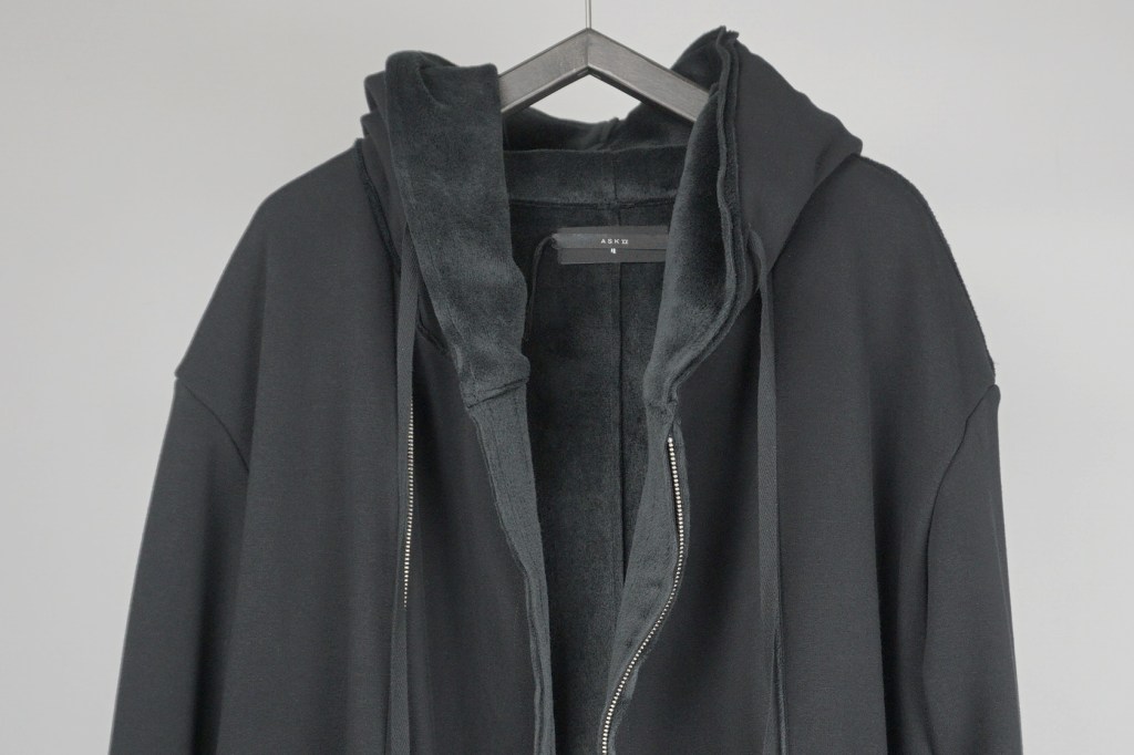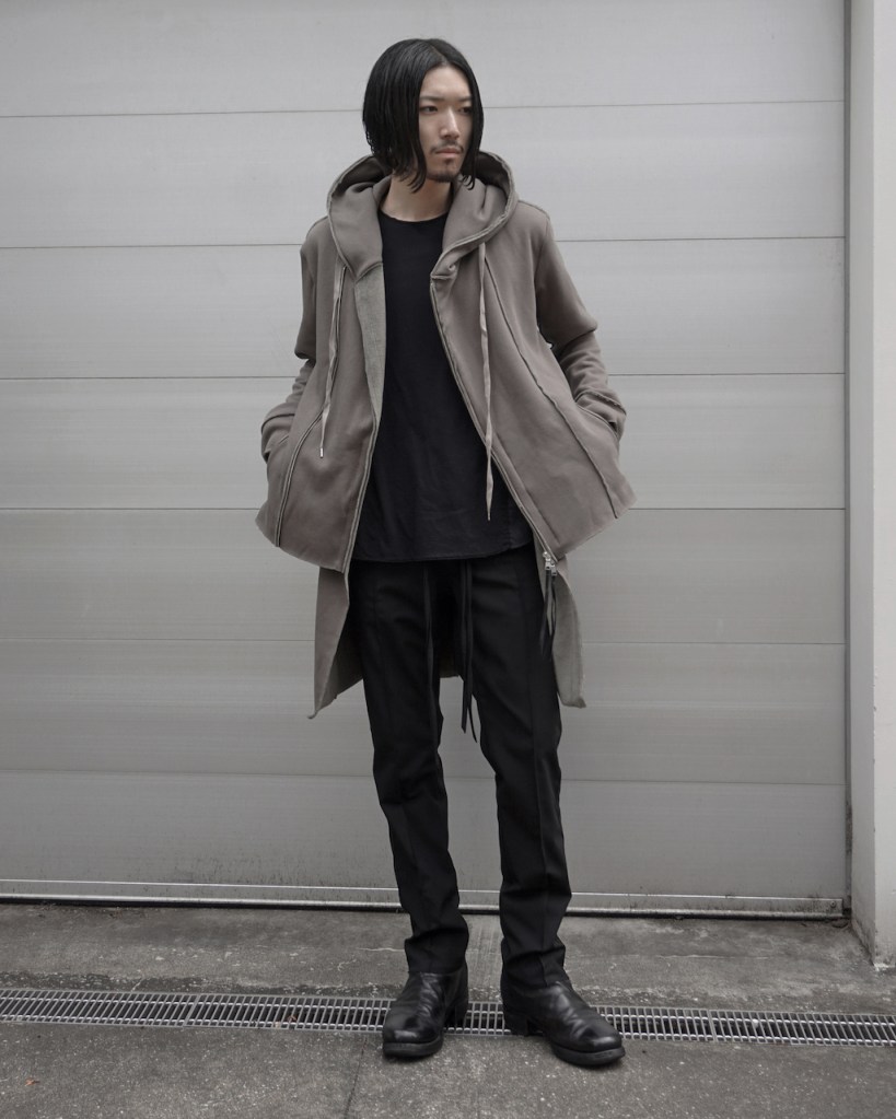 その後軽めのアウター素材で制作し(「LAYERED HOODIE COAT」)、