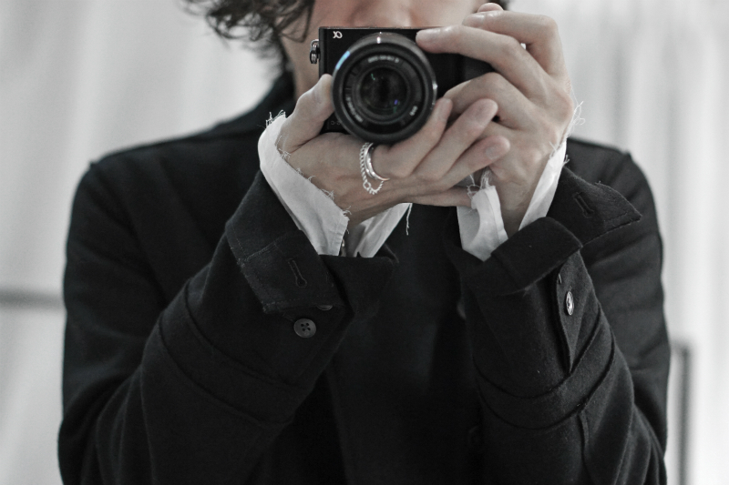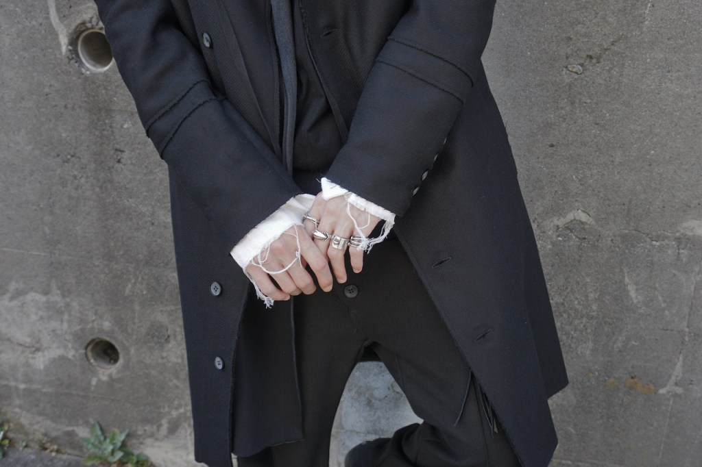 無数のボタン、かしこまる印象を排除したグランジな顔、袖の裏地による退廃性。