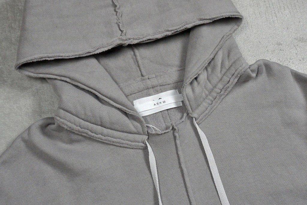世の中の9割のパーカーは普通に縫い合わせてあると思いますが、そこはASKYYのASKYYが表出。リメイクされた様なグランジ路線のクラフト感。首元の詰まりもなく、そこはベースがクルーだからこそのものです。