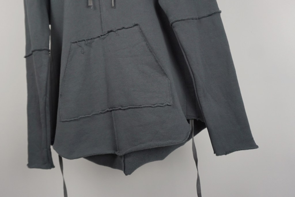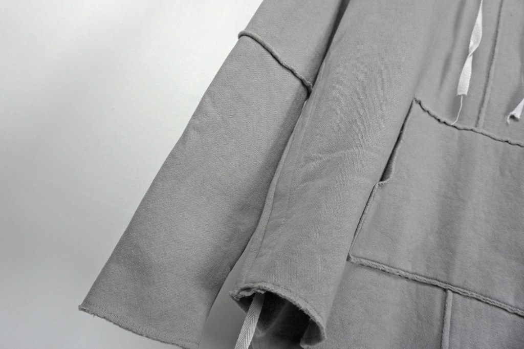 カットオフや裁ち切りのみではなくそれぞれの部分での緩急とパーカー王道であるカンガルーポケットの採用。