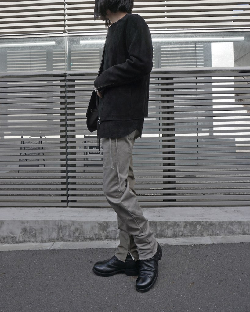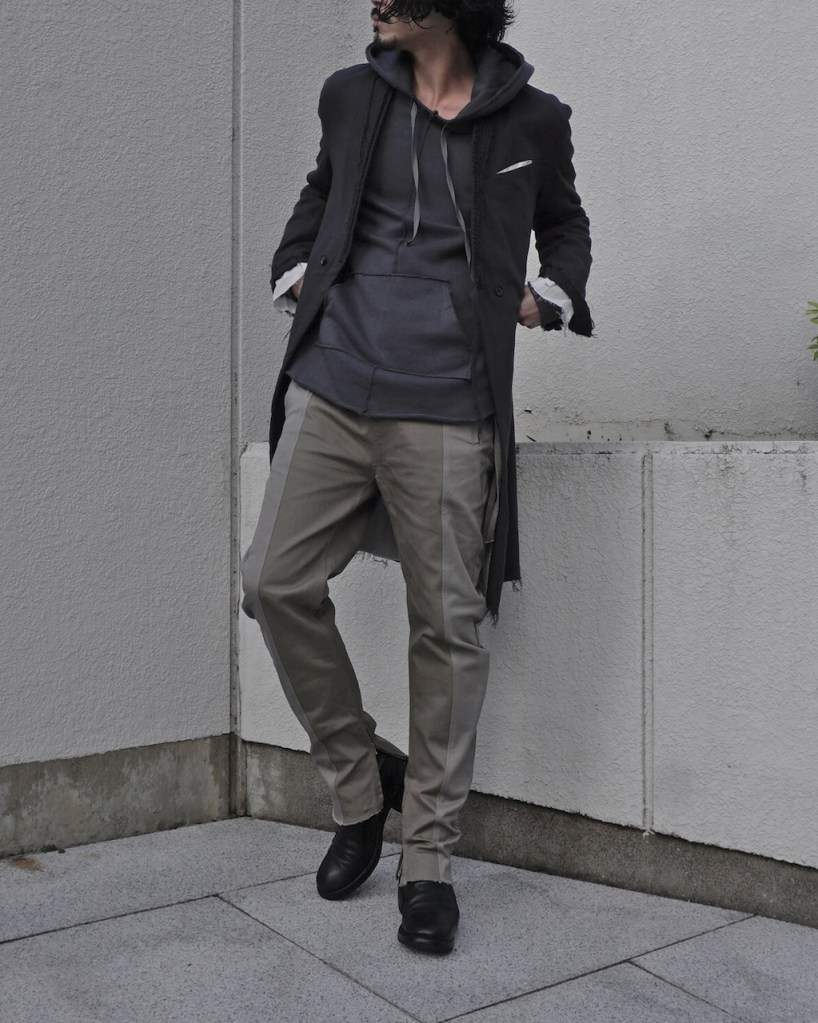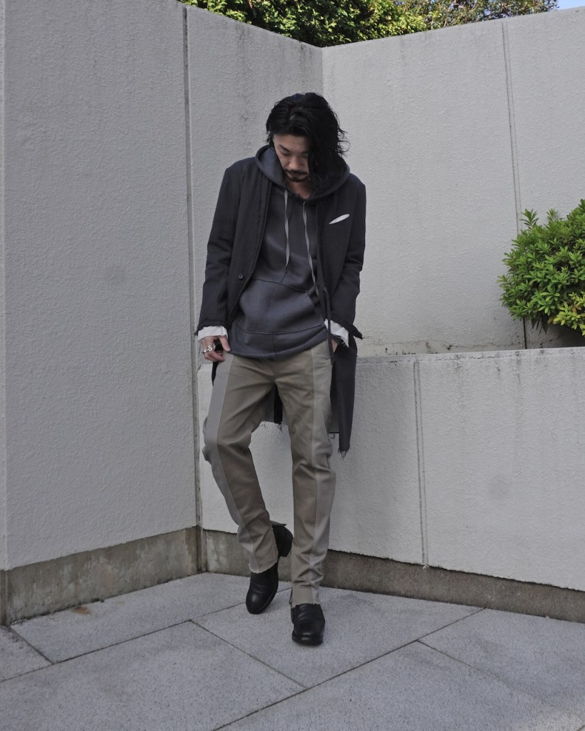 ニュアンスカラー同士のグレーで組み合わせているので、スタイリング的にはそこまで浮かずに馴染んでくれることと思います。ASKYYがリリースしたパンツの中で、ある意味最もカジュアルに見えるパンツではないでしょうか?