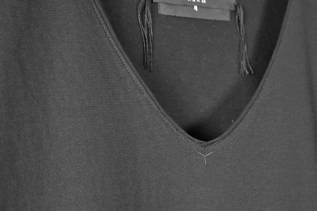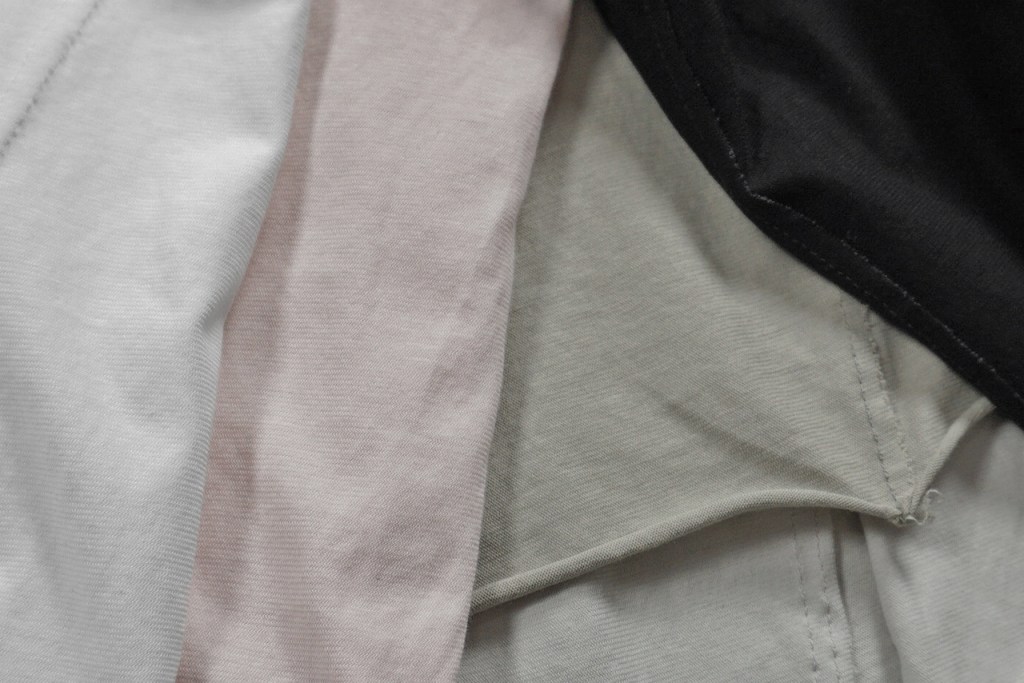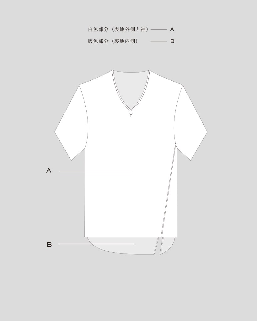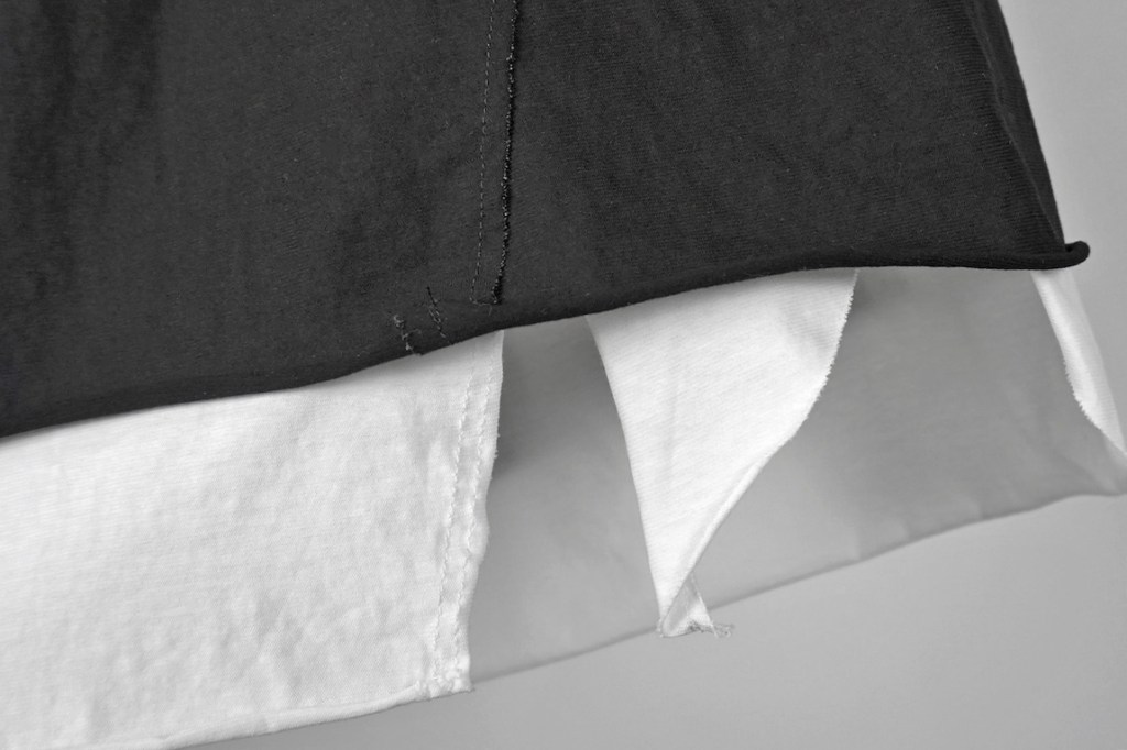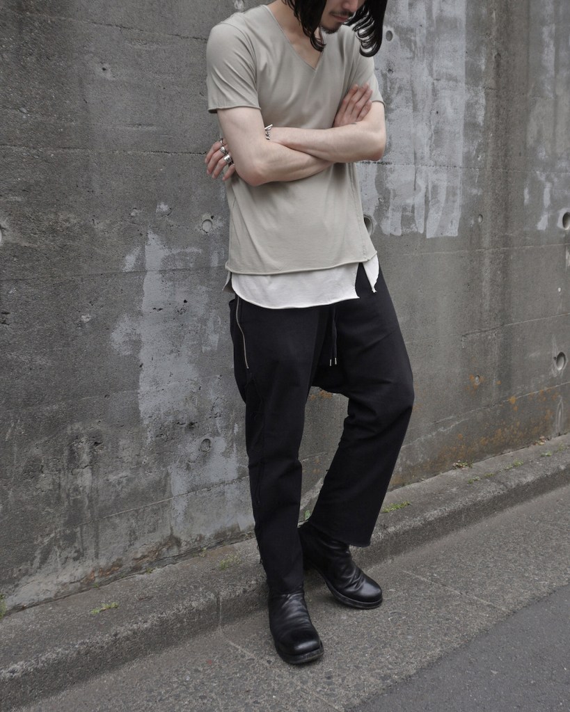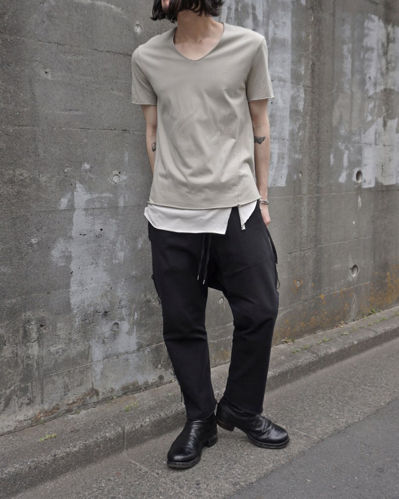 そして透け感を抑制する合理的なレイヤーとスリット。脇から中央に向けて斜めの方向に縫い目が走っており、「洗いをかけてヨレが生じる」という自然偶発的なものをベースの時点で再現。その先にスリットを設けアクセントにしています。