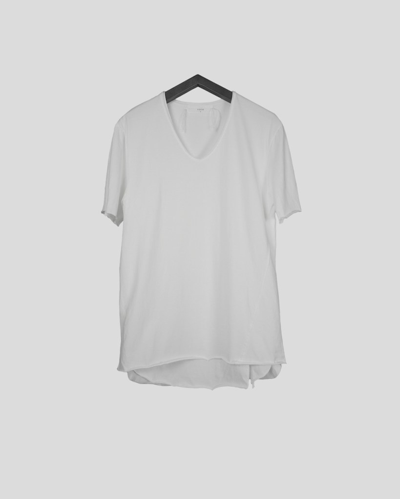 程よいリラックス感があるネック。洗いでくるっとなる特性を利用し、フチ部分にあらかじめ裁ち切りにして縫い合わせたパネルを付与。内側・外側ともこの仕様にしているため手間暇かけています。ただの裁ち切りではなくなった分、強度も増しました。