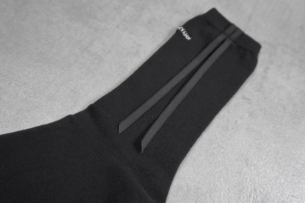 いわゆる「ASKYYのたれる紐」を加算。これの何がいいって、ハイカットスニーカーやブーツの裾口から出してアクセントをもたらすことが出来るんですよね。こんな靴下なくないですか?レディースで蝶リボンとかは見たことありますけど、”靴にまで影響を及ぼす靴下”って僕が知る限りほぼ見たことありません。