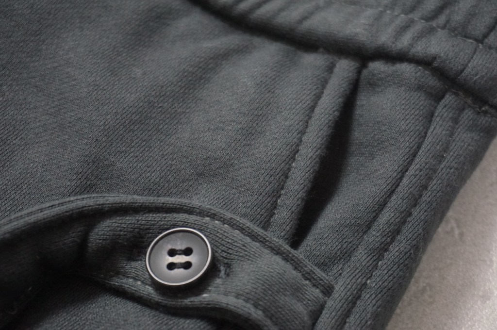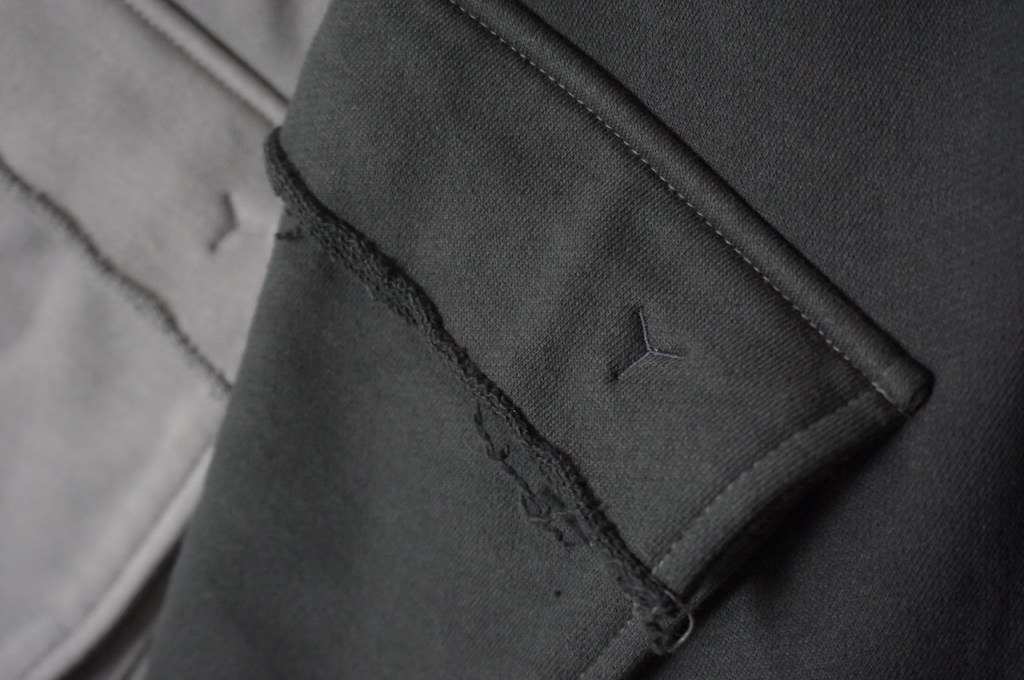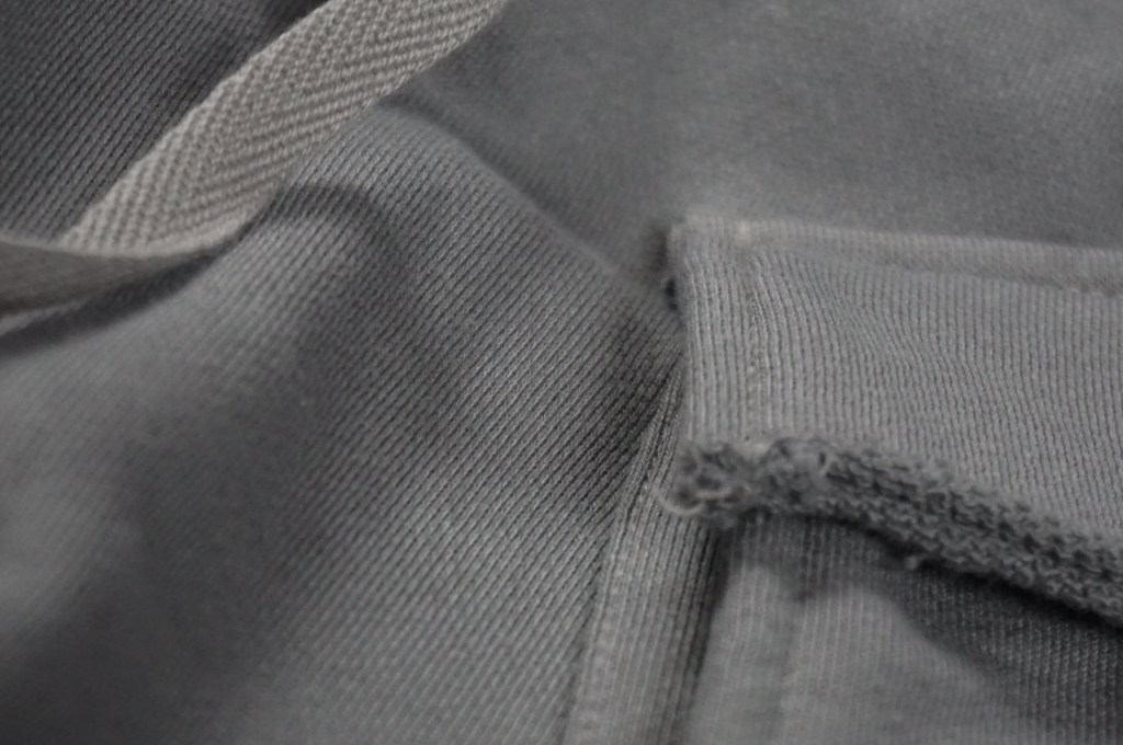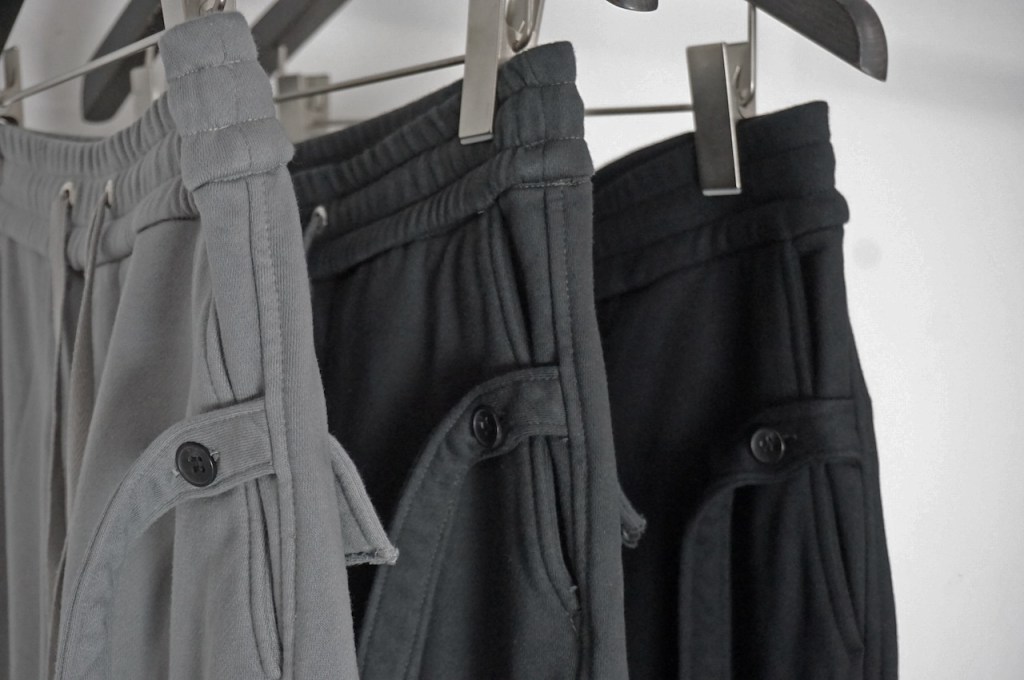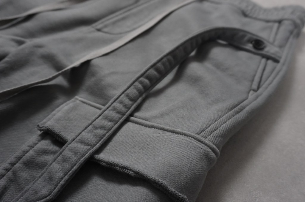とにかくしっかりタフな裏毛素材。ヘビージャージでカーゴパンツの漢気ある印象に適した素材。密度が高い分シルエットの立体感も綺麗でもちが良いです。先週のパーカーもそうですが、最近は「長くタフに使える素材」に力を向けていることもあり、もとがとれるような素材の選定をしています。膝も出にくく耐久性もあり。染め加工も施している分ガンガン履いて頂いたあとに現れる経年変化が楽しみな素材。