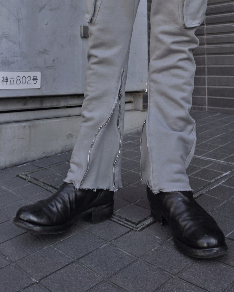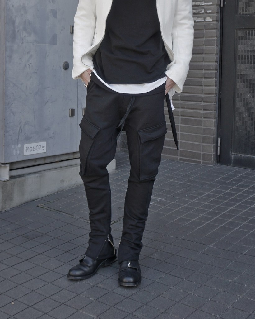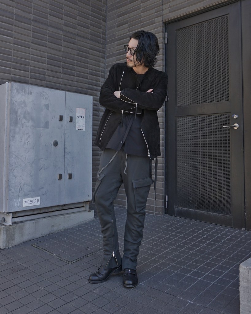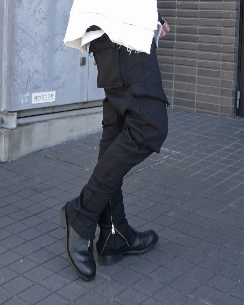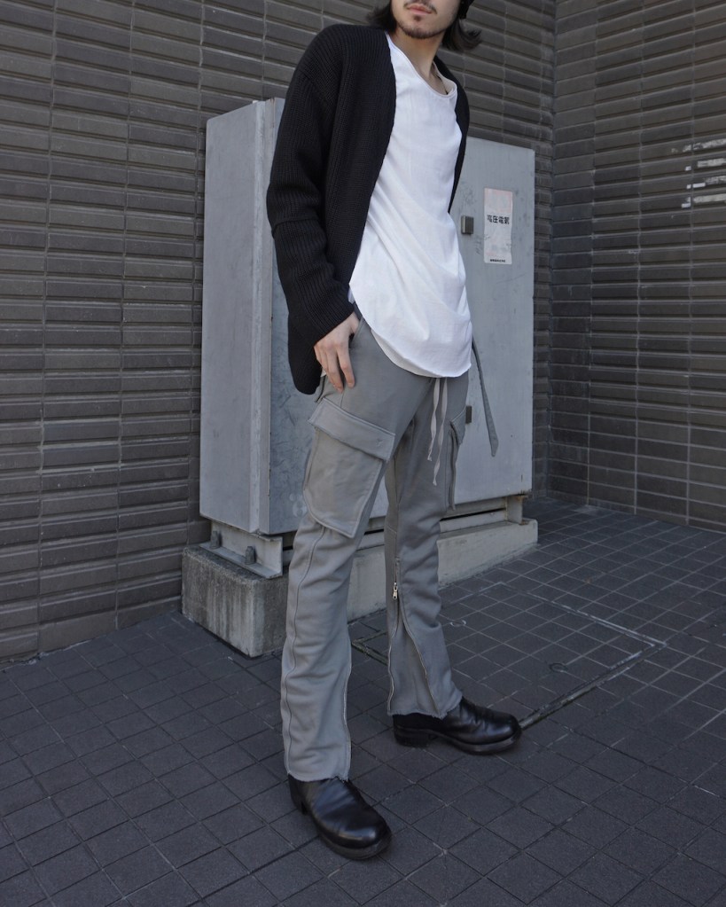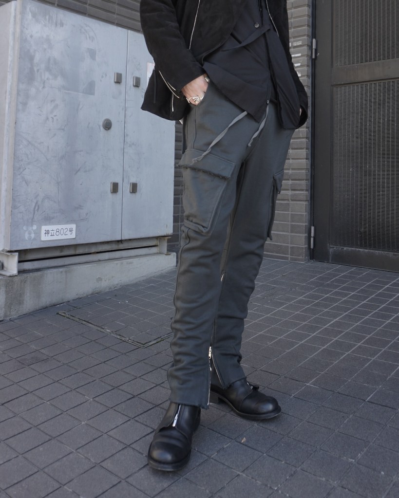 そのシルエットを変化させることが出来るポイント。時代的にも重心が足元に及ぶパンツがもはや主流になってきましたね。裾幅が太く、なんなら引きずるぐらい長いものもかなり増えましたが、うちはあくまでもASKYY。その流れをある程度汲み解釈しつつも、そのテンション感を調整できるというギミック。ももあたりから長めに設置したジップでお好みのシルエットをお作りください。ブーツ類との繋がりも優れています。