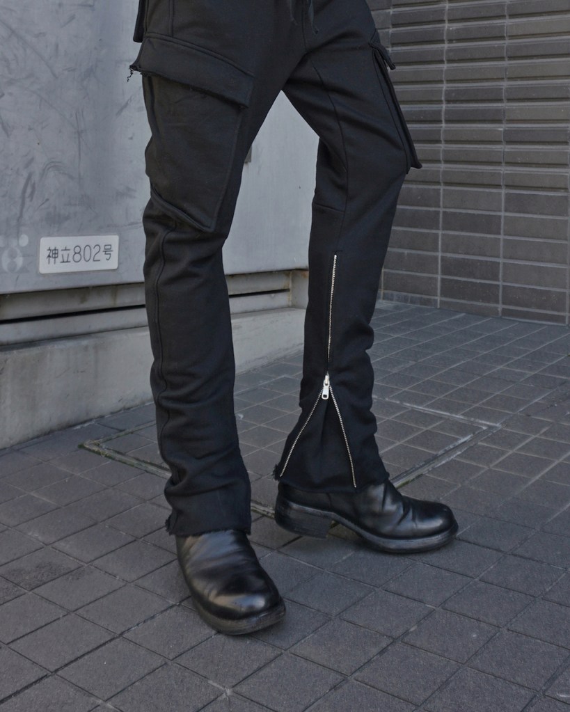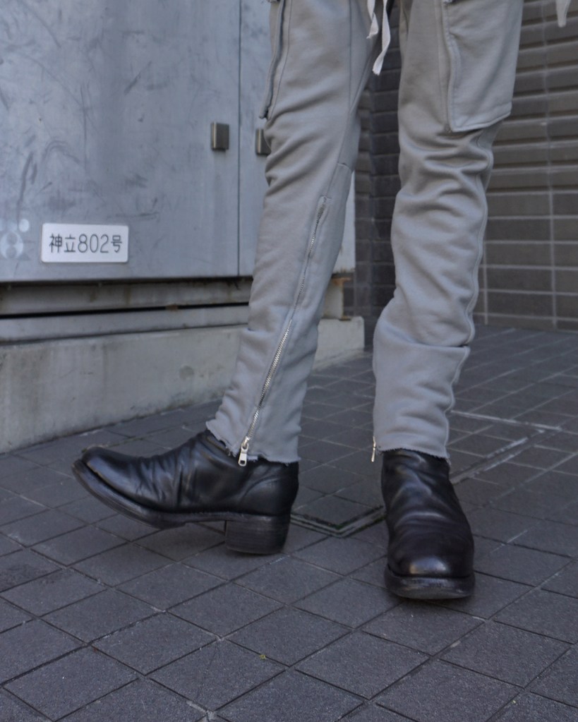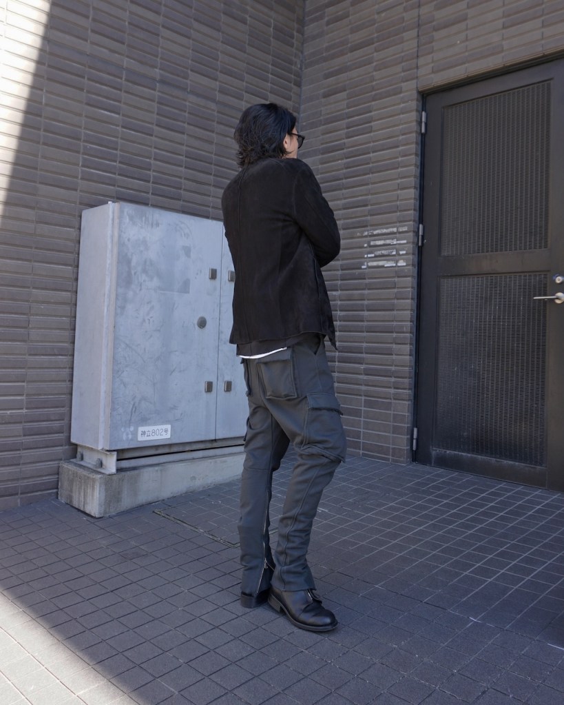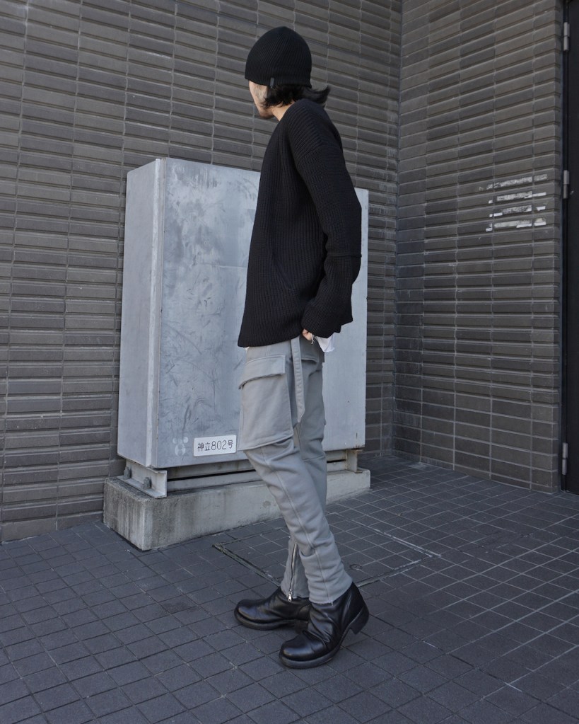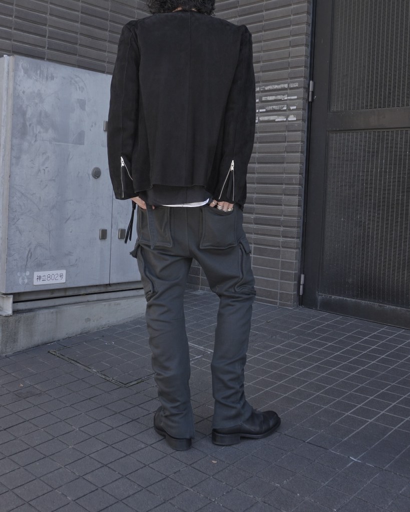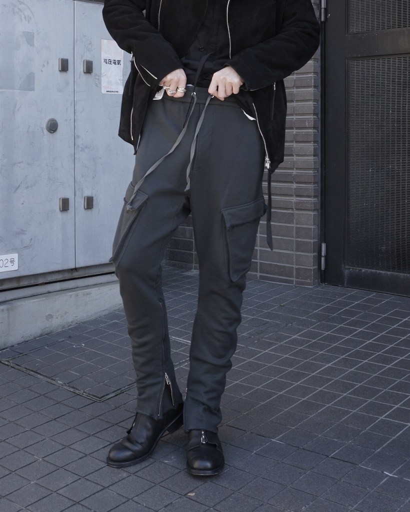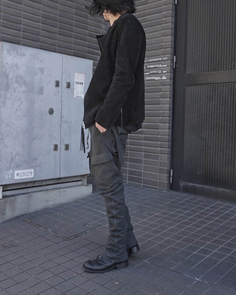 そのシルエットを変化させることが出来るポイント。時代的にも重心が足元に及ぶパンツがもはや主流になってきましたね。裾幅が太く、なんなら引きずるぐらい長いものもかなり増えましたが、うちはあくまでもASKYY。その流れをある程度汲み解釈しつつも、そのテンション感を調整できるというギミック。ももあたりから長めに設置したジップでお好みのシルエットをお作りください。ブーツ類との繋がりも優れています。