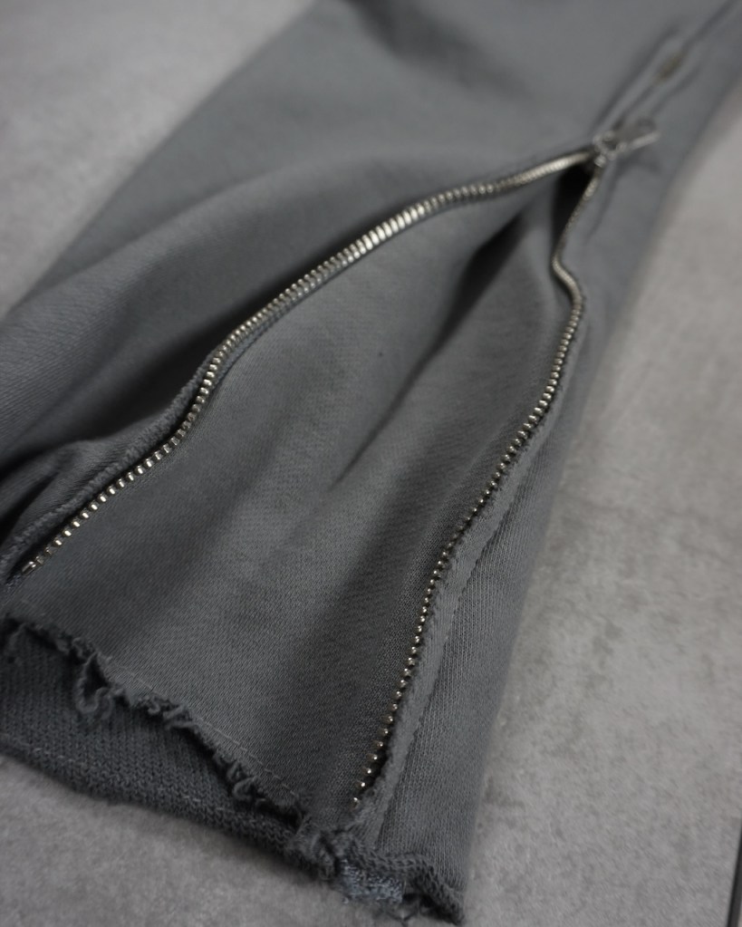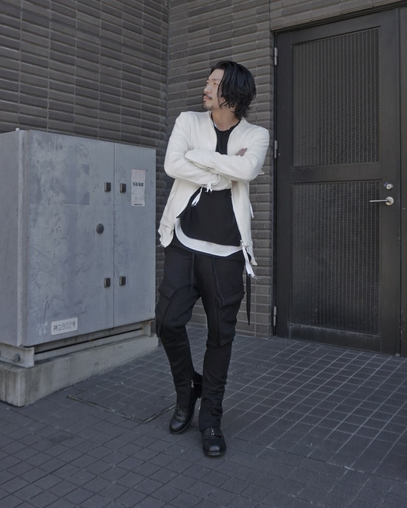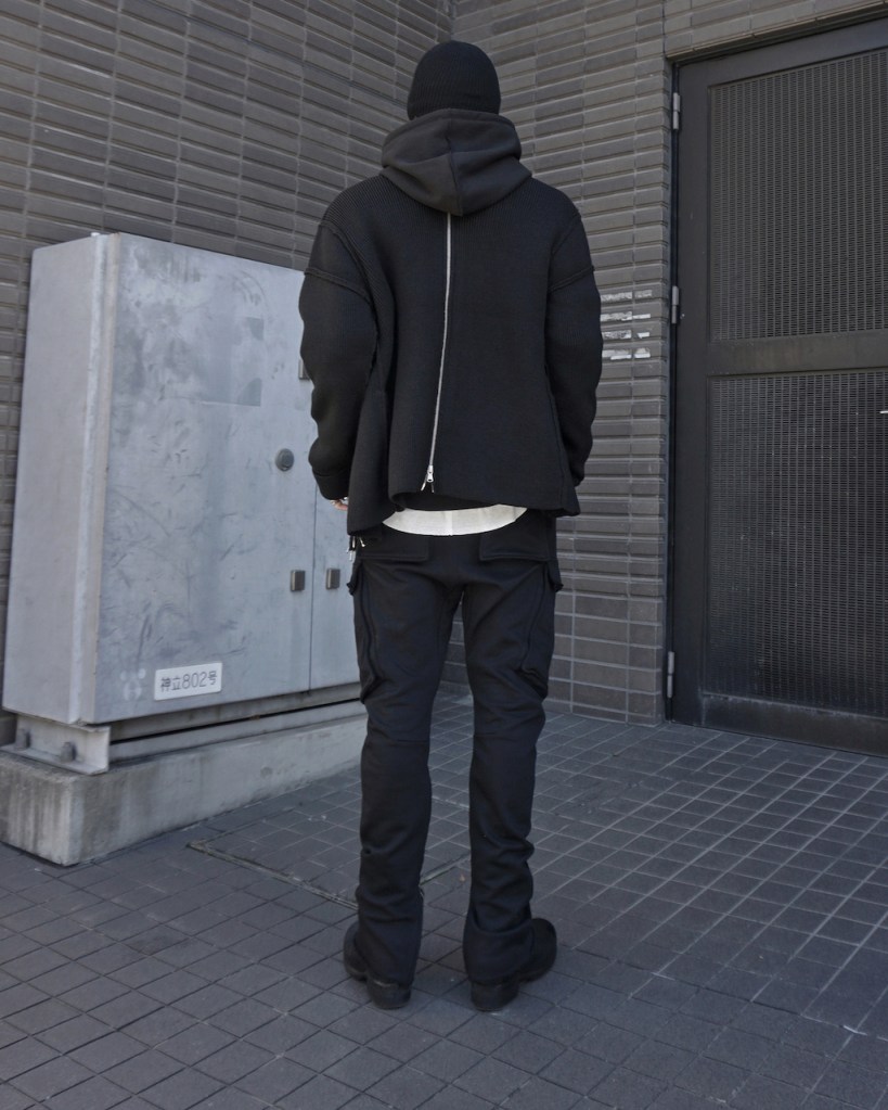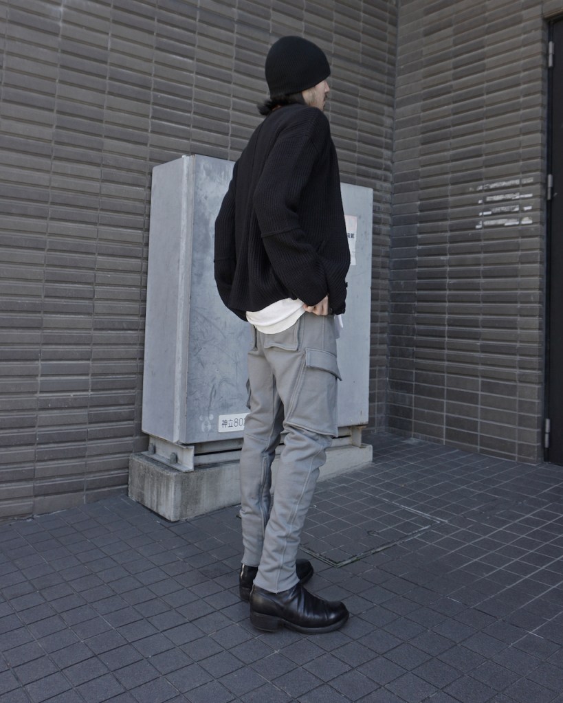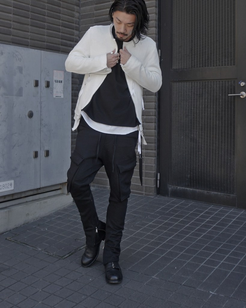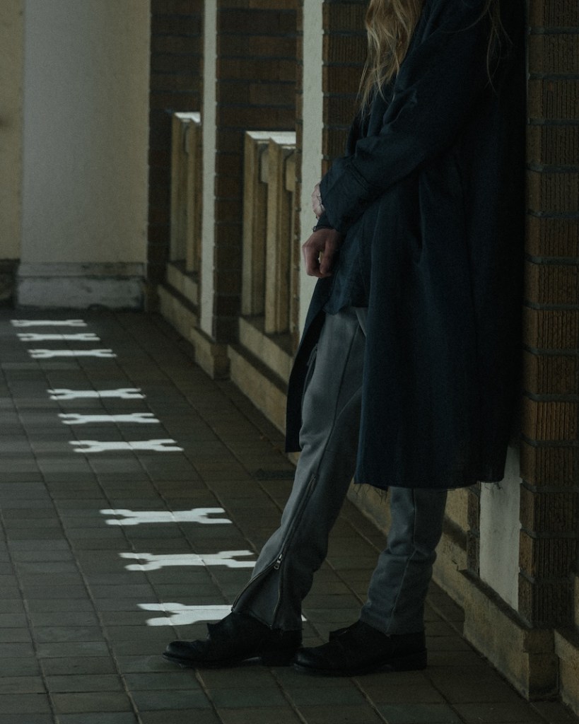 そのシルエットを変化させることが出来るポイント。時代的にも重心が足元に及ぶパンツがもはや主流になってきましたね。裾幅が太く、なんなら引きずるぐらい長いものもかなり増えましたが、うちはあくまでもASKYY。その流れをある程度汲み解釈しつつも、そのテンション感を調整できるというギミック。ももあたりから長めに設置したジップでお好みのシルエットをお作りください。ブーツ類との繋がりも優れています。
