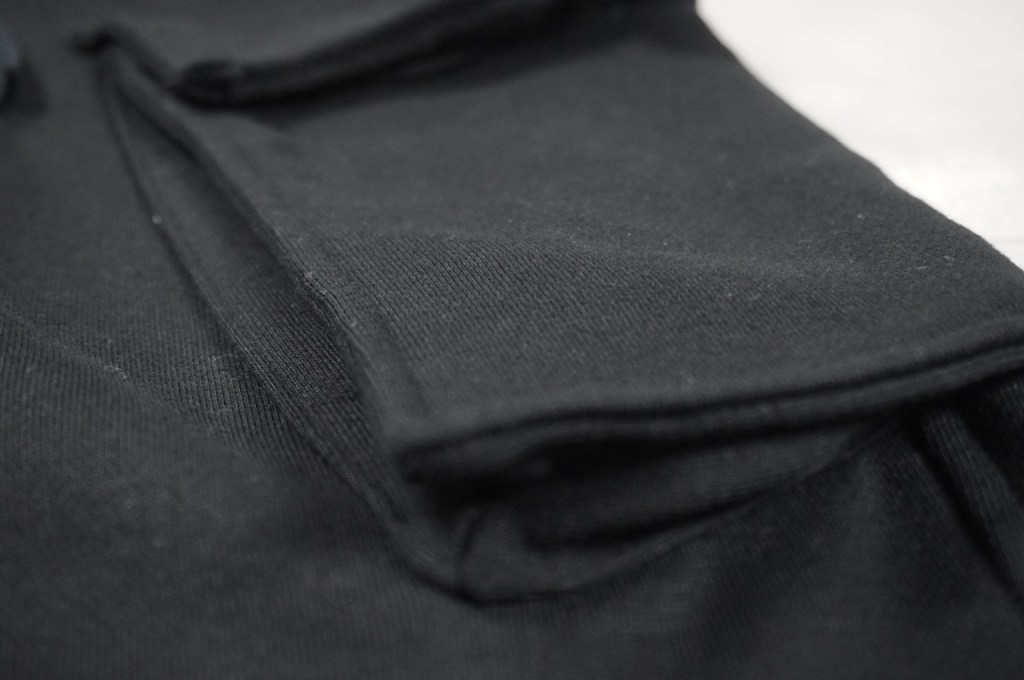 スウェットなので吸い付くようなフィット感。採寸表で見た場合やや細く感じられるかと思いますが、伸びも踏まえてご検討ください。ちなみにBLKは染め加工を施していないため縮率の関係で股下のみやや長く仕上がっております。