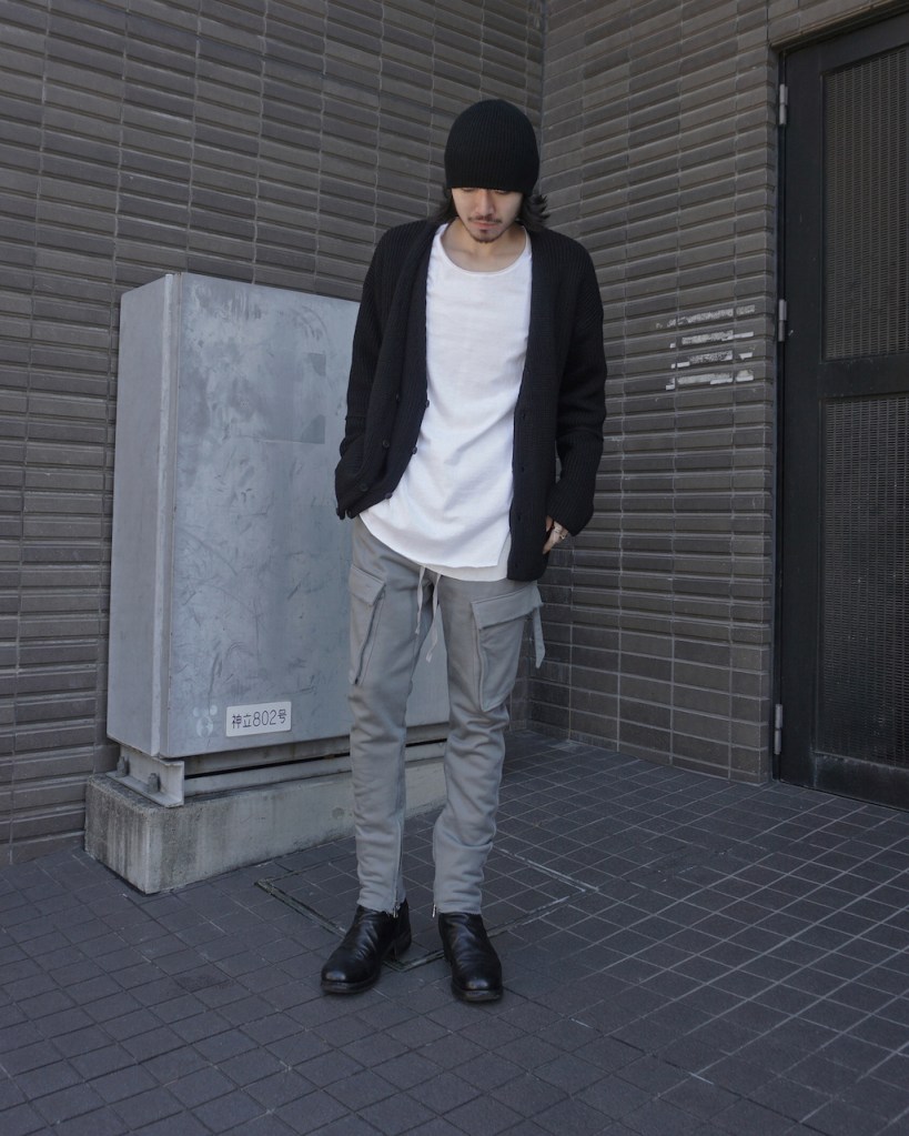 カーゴパンツといえばオリーブやカーキ系が王道であり巷でも多いと思いますが、大体色味が明るすぎたり彩度が強いものが多いと思います。いかにもミリタリーというか。そこでダークグレーになるべく近い緑寄りの色味に合わせる事でモノトーンとの組み合わせを容易にしました。冷たさもあるので土臭くなりすぎずしっかり繊細な雰囲気を保ちます。アメカジにも合わせやすい一品。