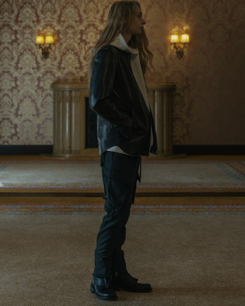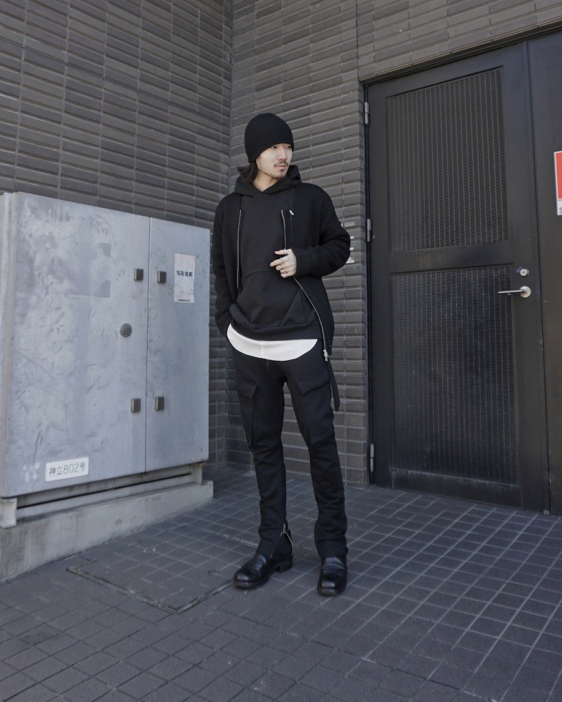 素材がスウェットなのでレザーなどハードなアイテムで緩急をつけて頂くと良さそうです。LOOKでもそうでしたね。