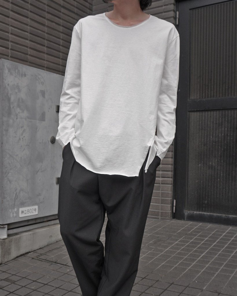 お客様によって感覚の差はあるかと思いますが、その辺のカットソーより生地しっかりしているので乳首凸も気にならずタンクかませなくても真夏も大丈夫かと。素材ほんといいんですよね、この表面のスラブ感?でダダ漏れているかと思いますが実際手に取っていただければご納得いただけるかと思います。まぁ乳首ぐらい立たせていきましょう?こんな時代ですし?