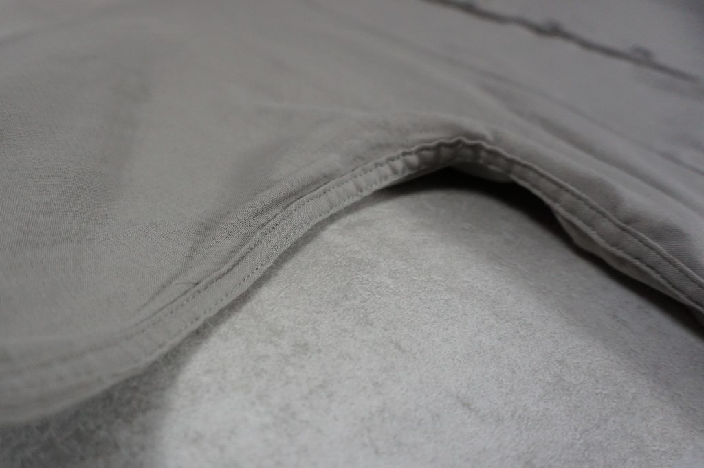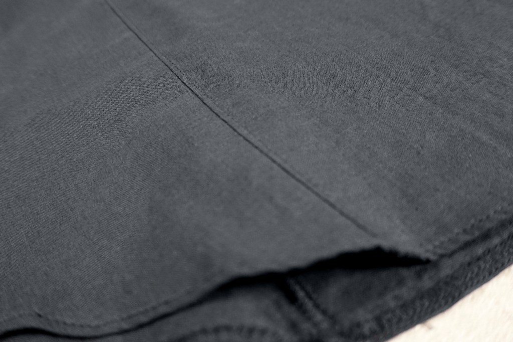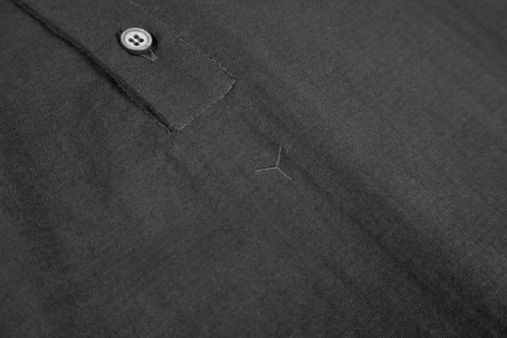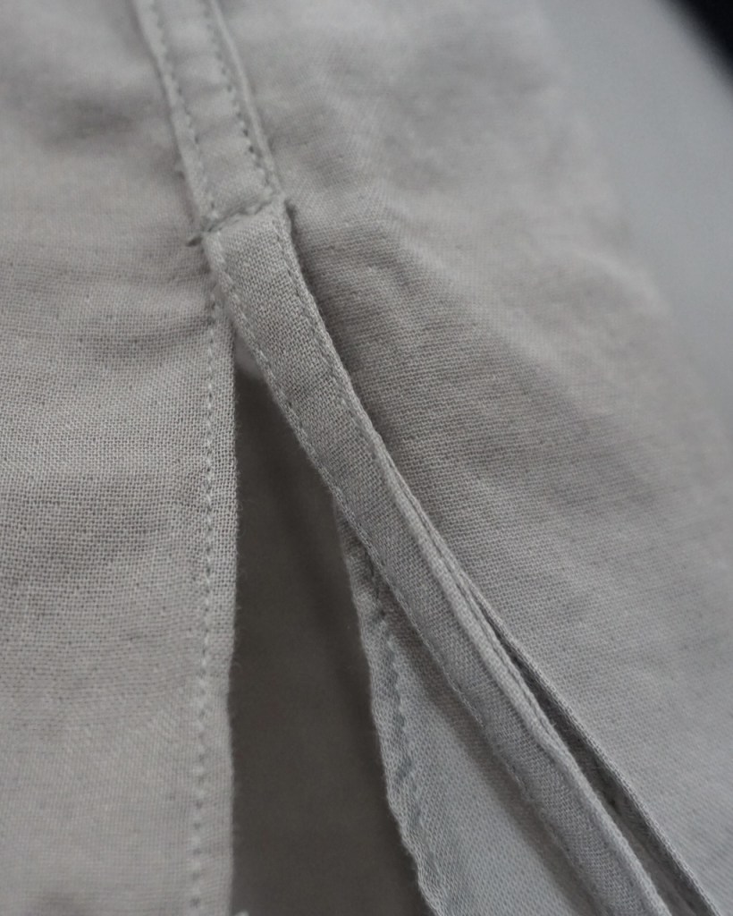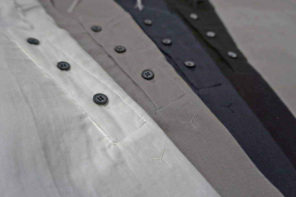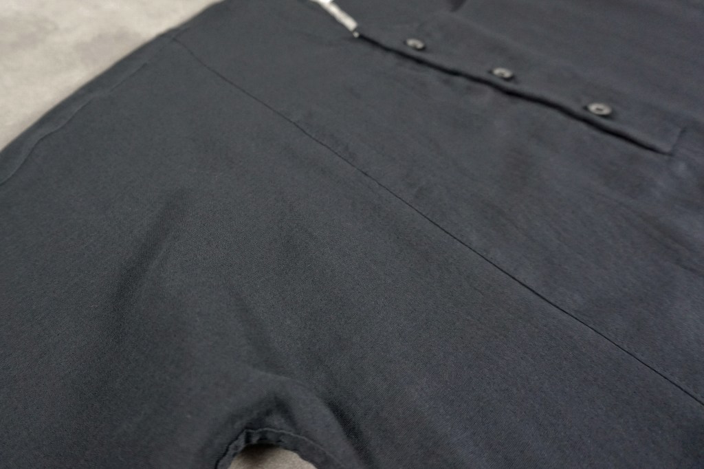 先シーズンより何度か書いておりますが、縫製仕様も徐々に変化させています。特にシャツに関してはガンガン洗うものですし、糸の吹き出しが進む事で縫い目が避けたりすることがありました。それもそれで味や特性と思って意図していましたが、物性の強度等を加味し、今作は通常の縫いを多くする事で「長持ち」するようにしています。