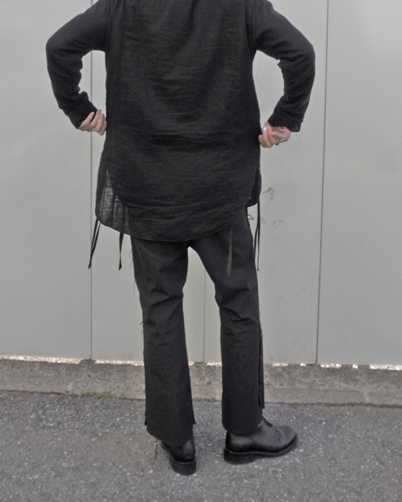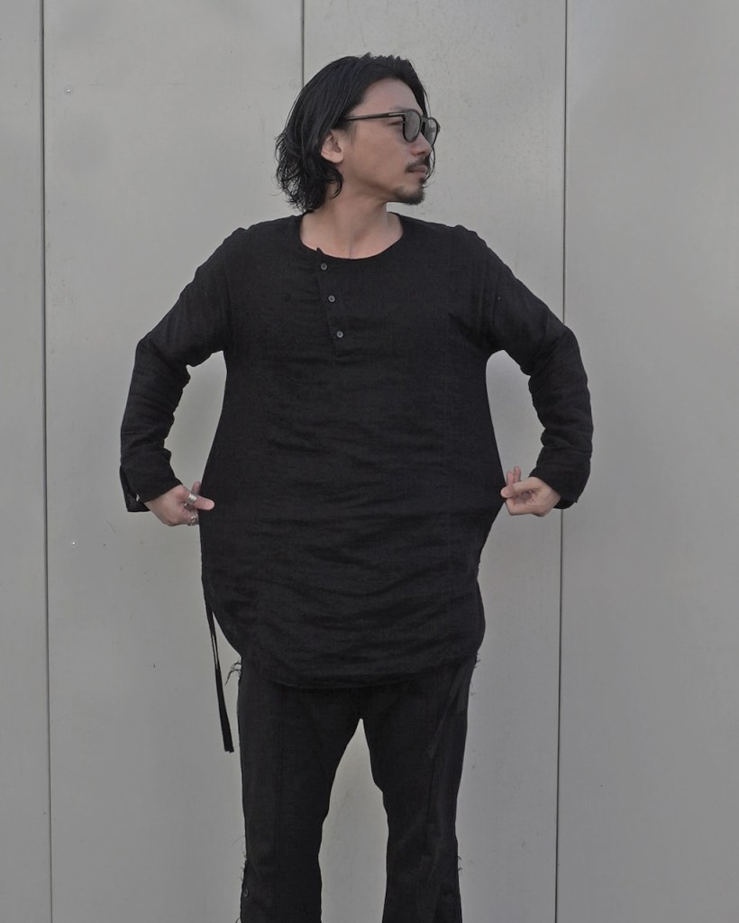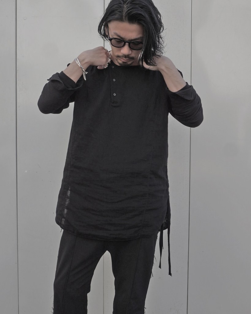 今までのチュニックは身幅も狭く前開きがない分、着づらさがありました。今作はそれを根本から改訂し左右にハギを追加。アームホールを排除。袖周りはドルマンスリーブにし可動域を広く、サイズに大きく干渉されないような作りで設計。ドロップショルダー(肩線が外側に落ちる感じ)が体型に合わないお客様もいらっしゃるかとおもいます。ラグランスリーブは急にカジュアル感増幅しますしね。