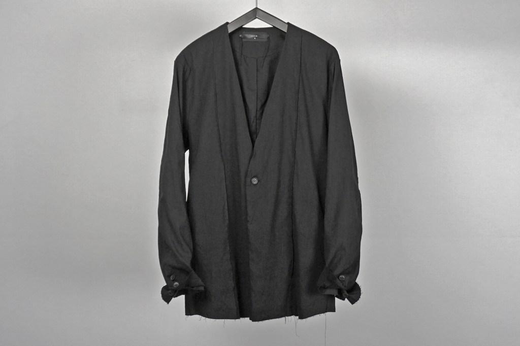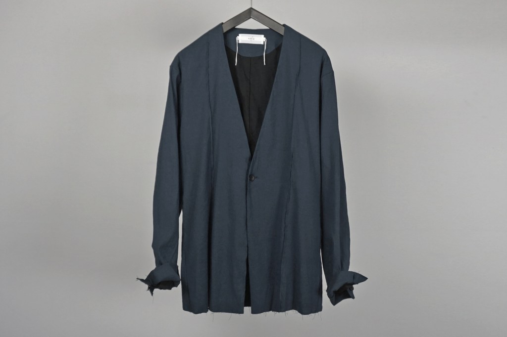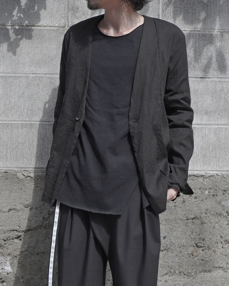襟元はノーカラー。テーラードジャケットなどの一般的な襟元と比べ、ラフにイージーに着用できるメリット。