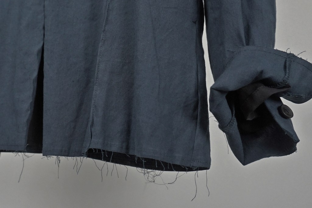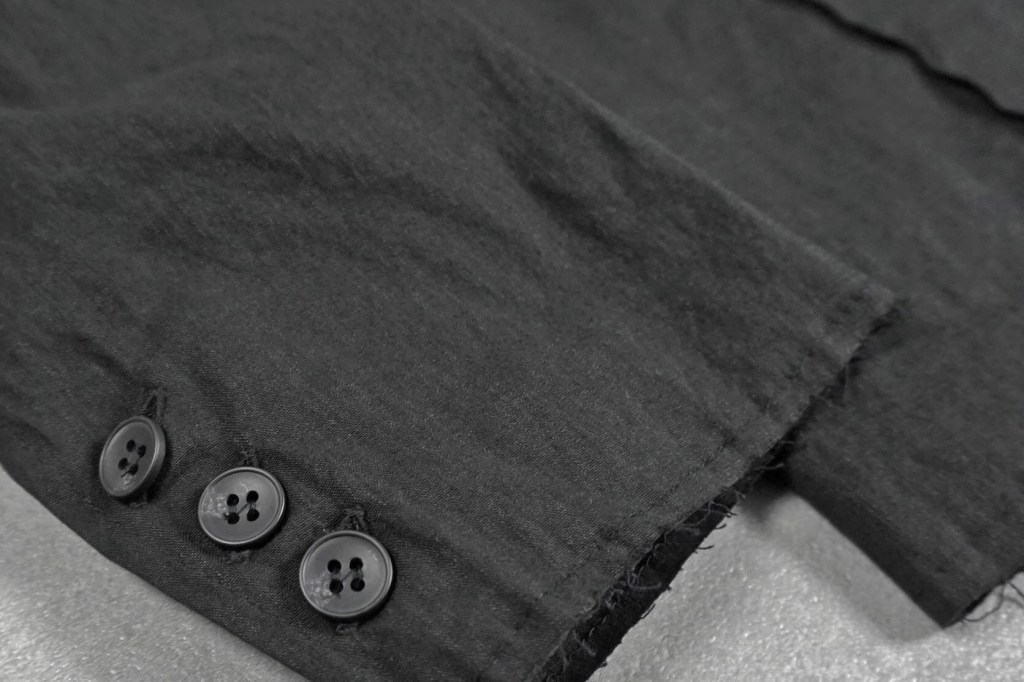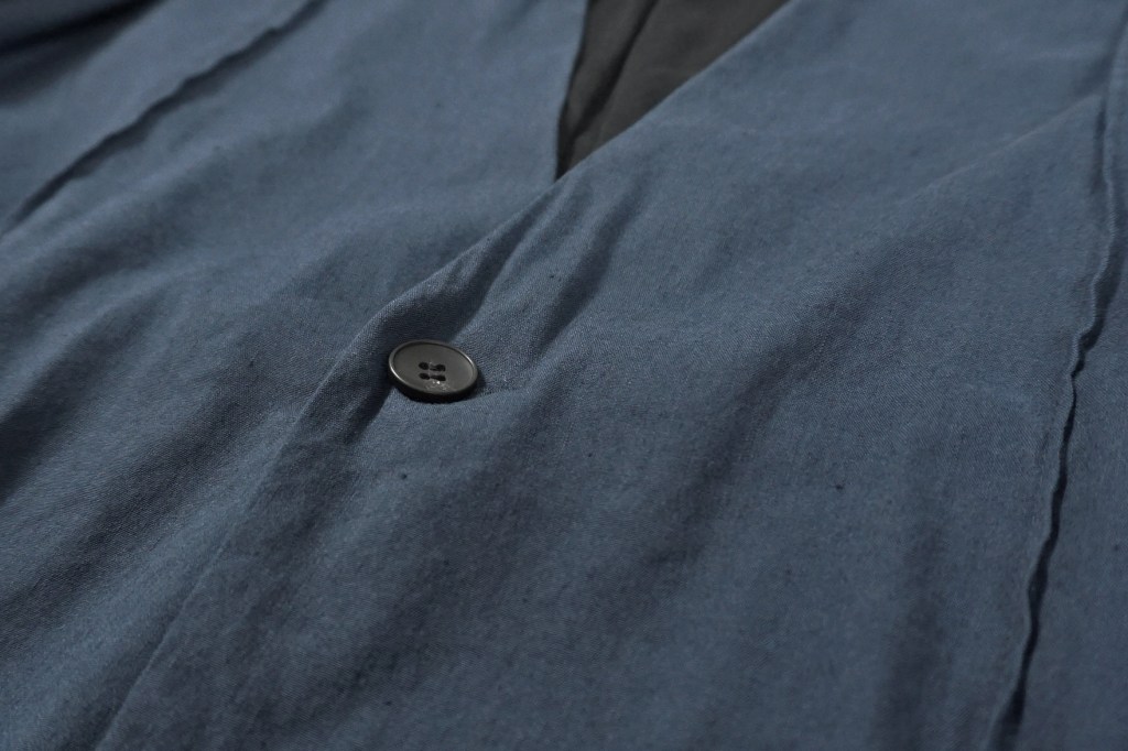 コットンの黒よりも褐色がかっている、これもリネン特有の黒。ちゃんと黒なのですが、着古したようなアンティークブラック感もあります。いわゆる”黒ジャケ”の重たさはありませんし、夏場でもサラッと着ることが出来る軽快な色味になってます。