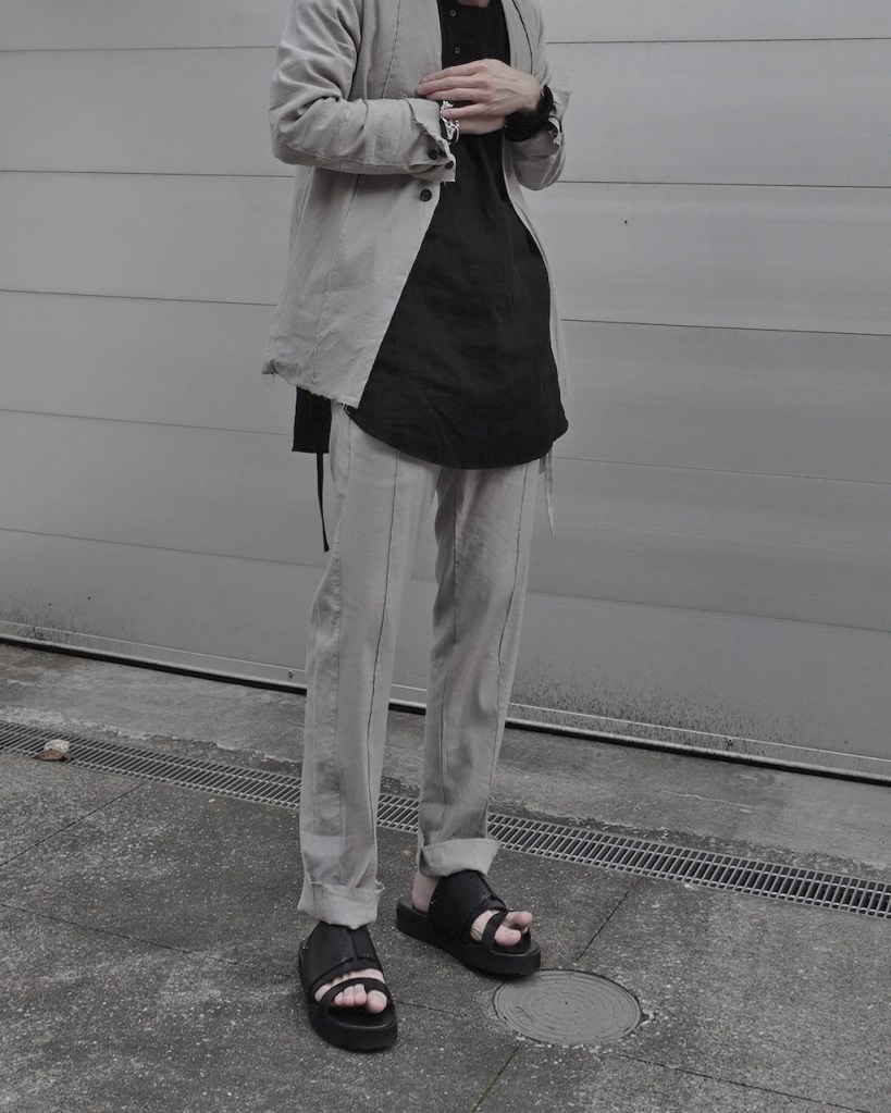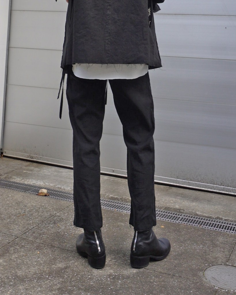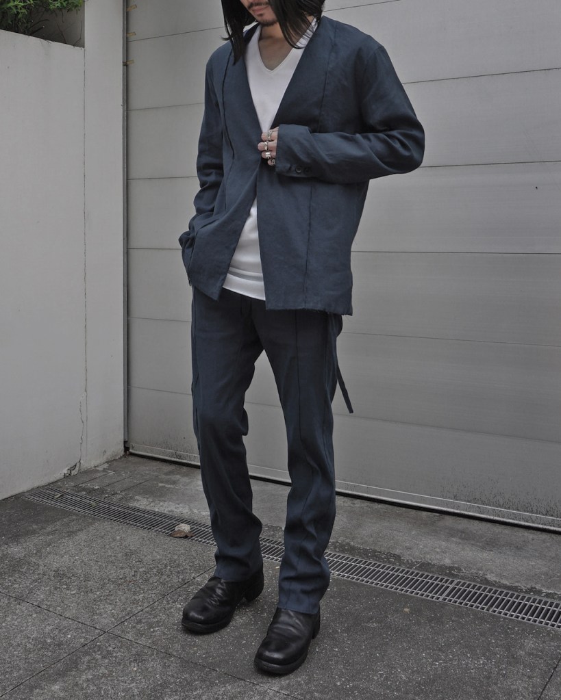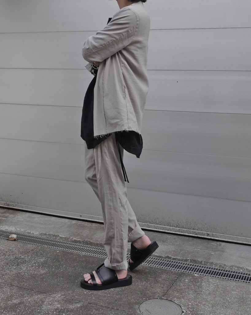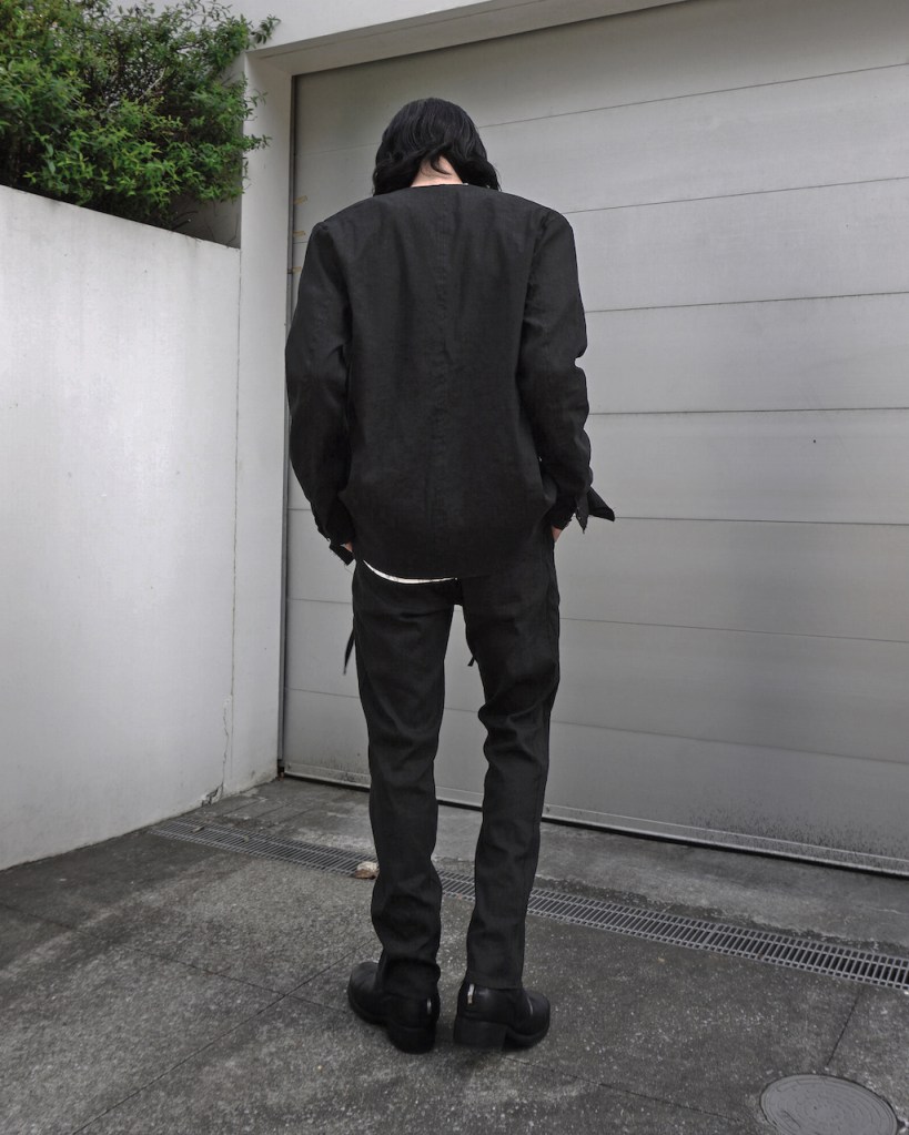 ジャケットのご紹介の時も記載しましたが、黒とはいえリネン特有のヴィンテージ感を兼ね備えた褪せ感。ちゃんと脱力しているあたり夏にふさわしい黒かと思います。(写真素材感つぶれててすみません)