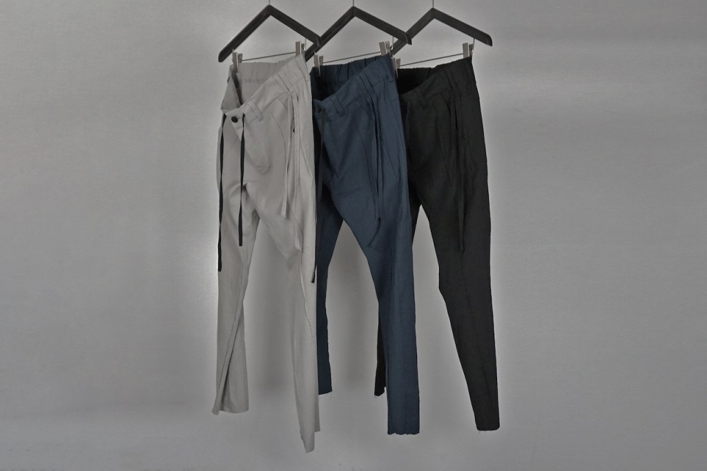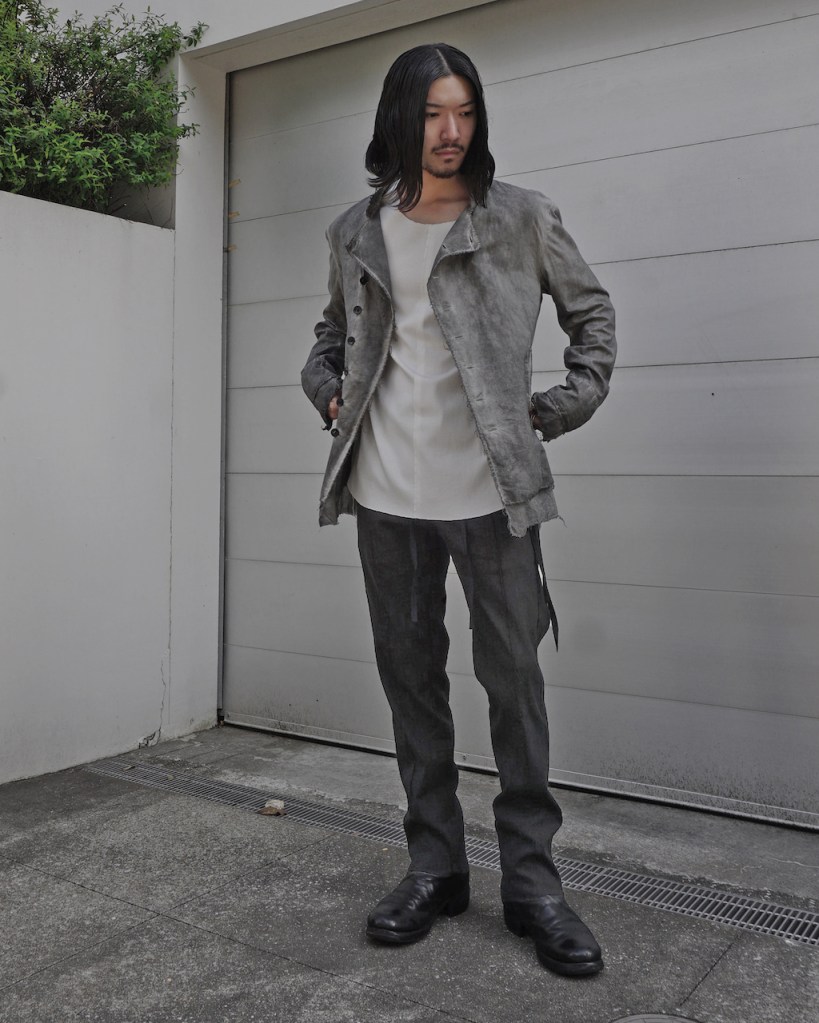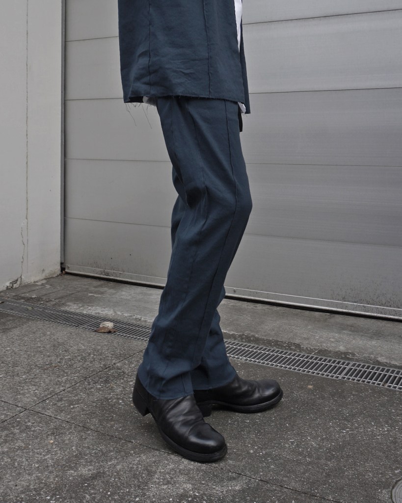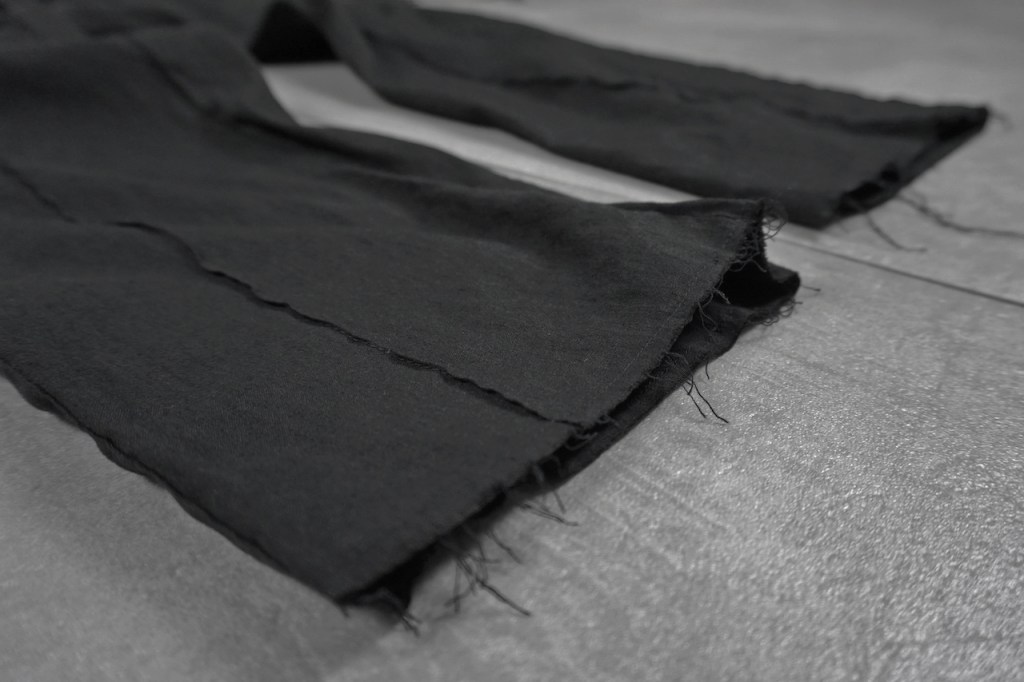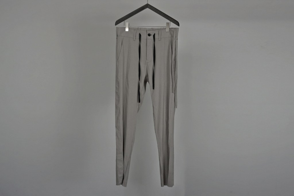 縫製に関して、裁ち切りは裾部分のみになってます。ビジネスにもお使いいただける様に糸の吹き出しが出る様な縫製は極力なくし、裾のほつれのみでグランジ感を与えました。ジャケットと同様です。