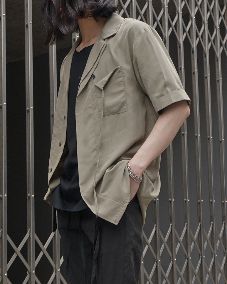 襟があることで本来はかしこまった印象になる開襟シャツも、この素材とデザインで緩和。大きさや開襟時の広がりを計算し癖のない仕上がりにしました。