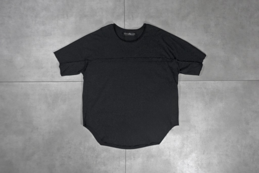 裁ち切りで終わりではなく、伸びを抑制するギミックを施したクルーネック。