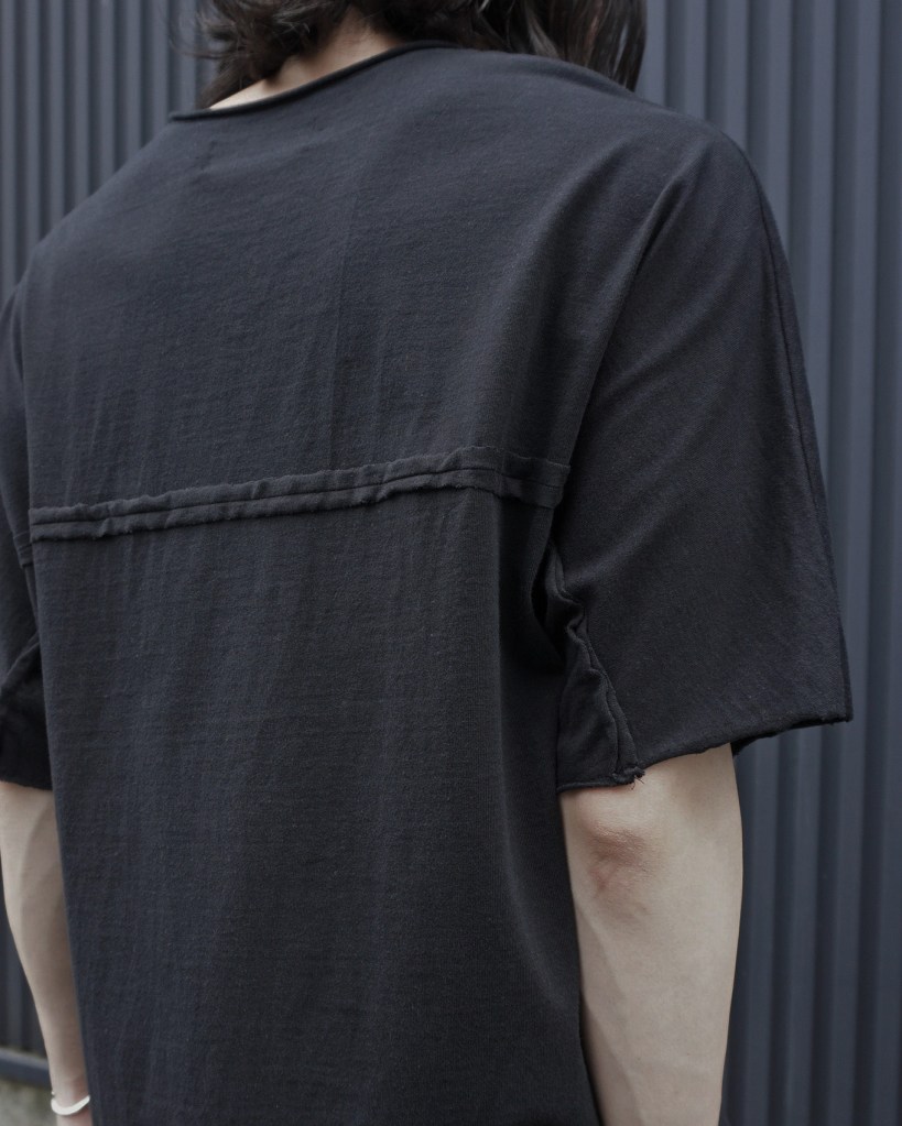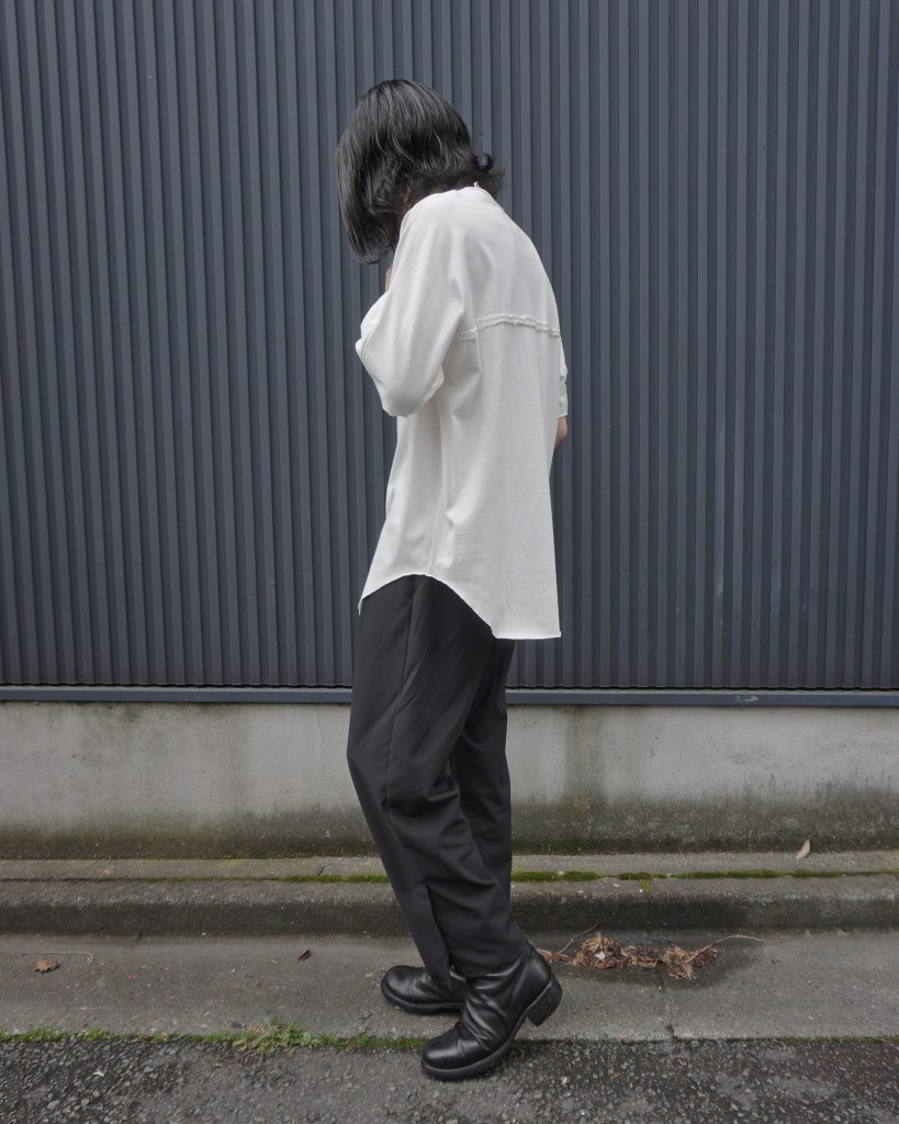 今までの繊細な生地とは逆の方向にベクトルを向けた強いボディを用いて新たなアプローチを試みており、気兼ねなく着用・洗濯頂ける作品。その強度あるボディ故に施された合理的なデザインと共に。