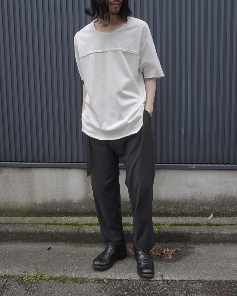 今回のカットソーがワイルドな見た目ですし綺麗なスラックスで上品さを加えると帳尻があって綺麗。