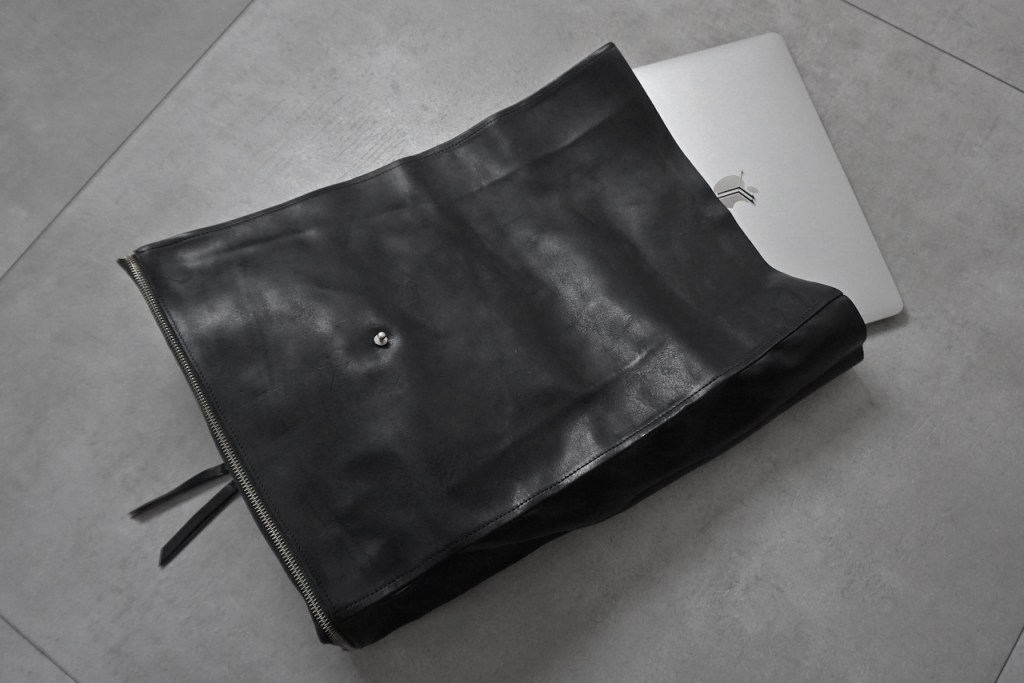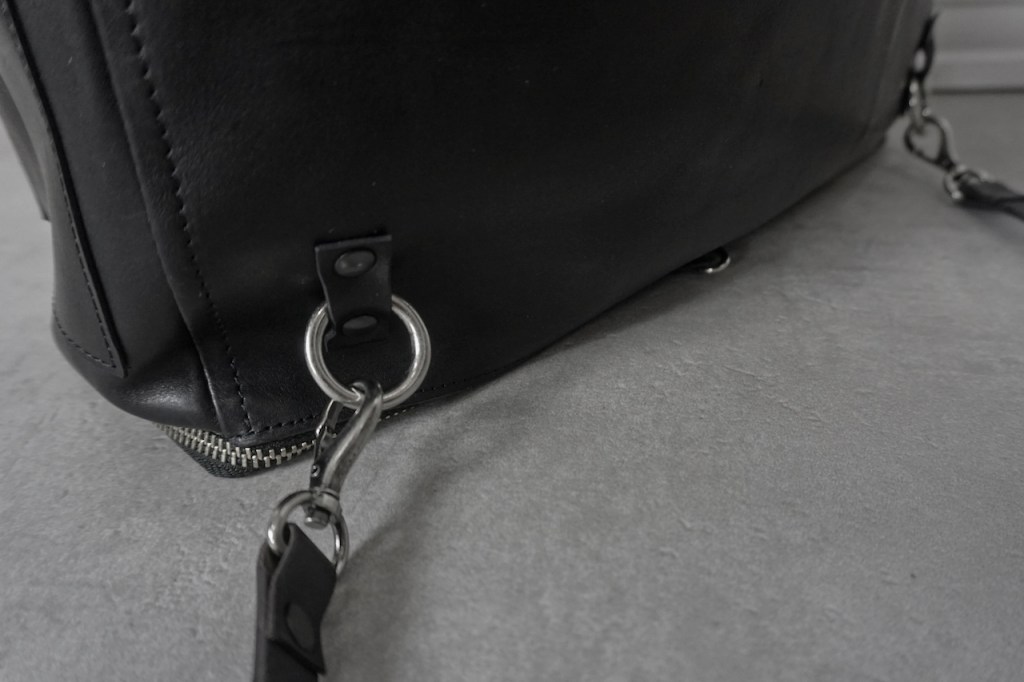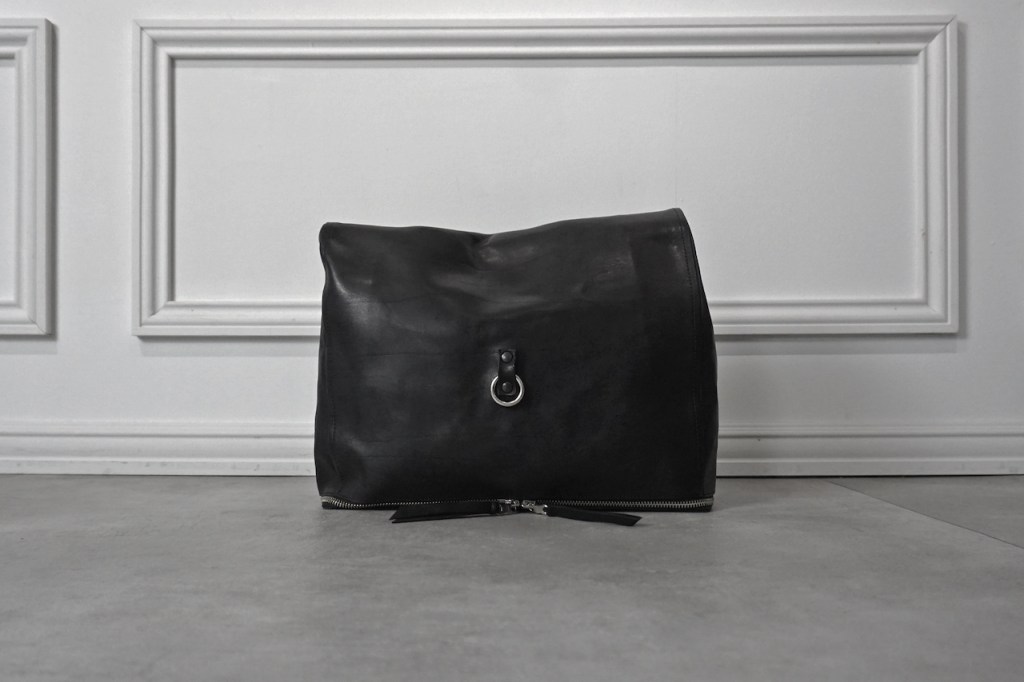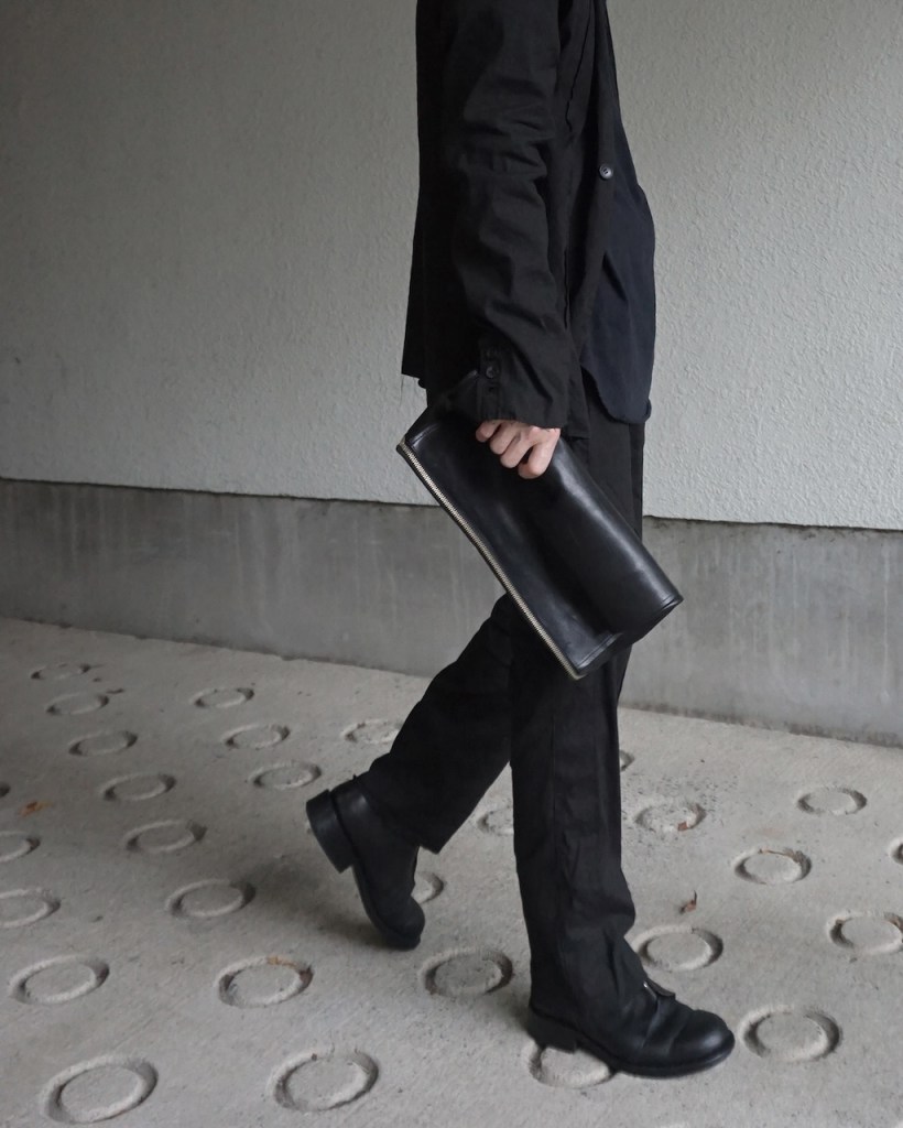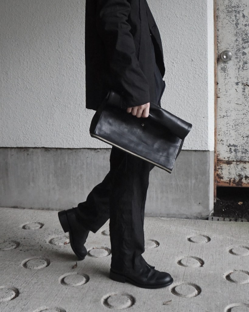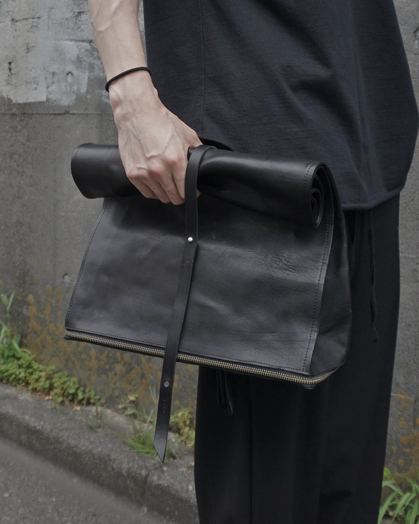 クラッチの状態でもジップや燻しの効いたシルバーパーツの無機質さがブラックに映えているのでただの「革袋」にはなりません。