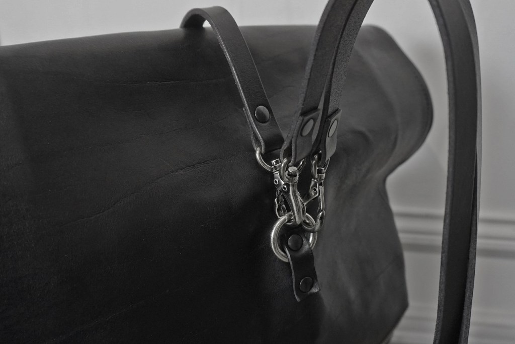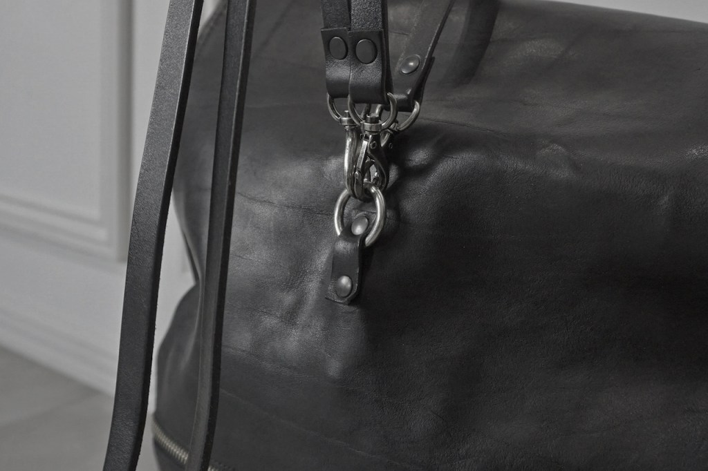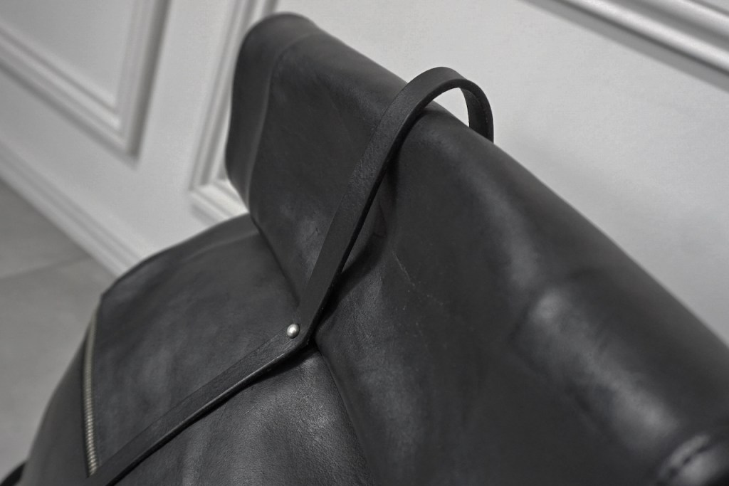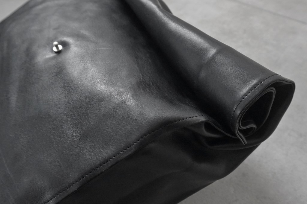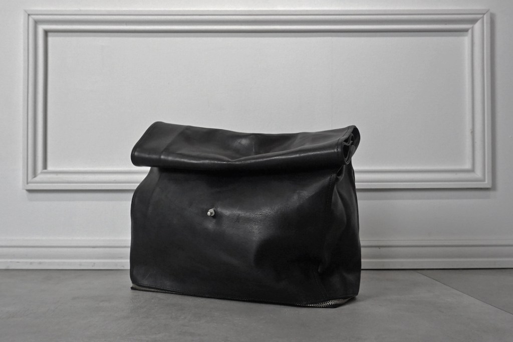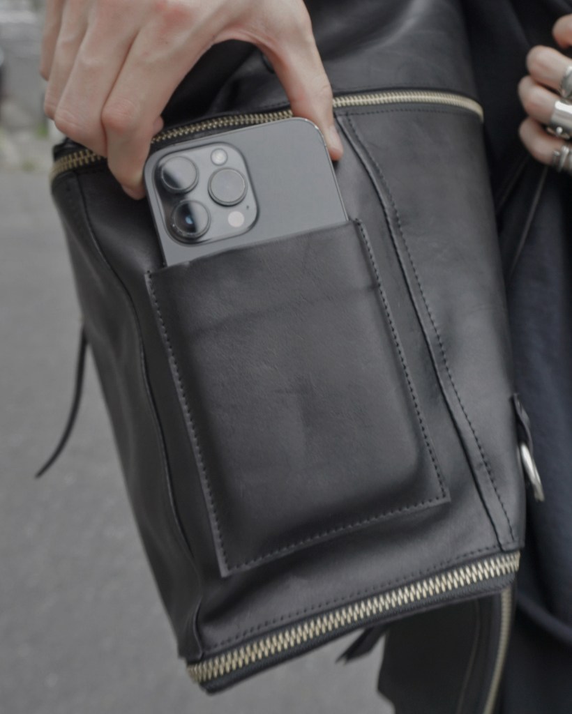 クラッチの状態でもジップや燻しの効いたシルバーパーツの無機質さがブラックに映えているのでただの「革袋」にはなりません。