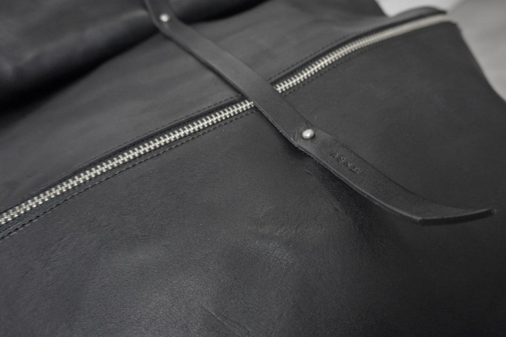 ファスナーはダブルジップ仕様でもあり、さらには「背面側」に引き手を設置してあります。上部のくるくるをしなくても物を出し入れしやすいように工夫しました。真ん中からごっそり物を出し入れ出来るという画期的な仕組み。あるいは底面からもアクセス可能。何より背面側に引き手があることで、例えば混み合った電車、海外のスリ対策などの防犯面も考慮してます。
