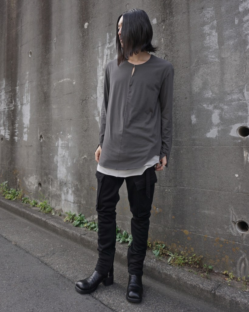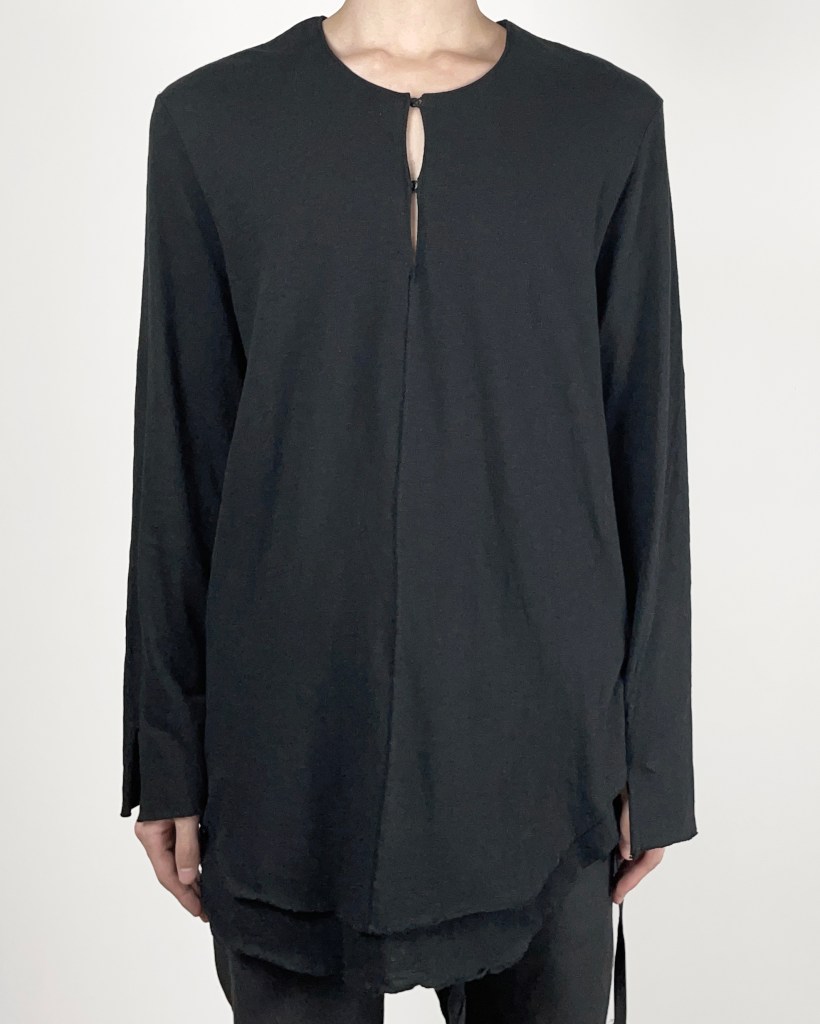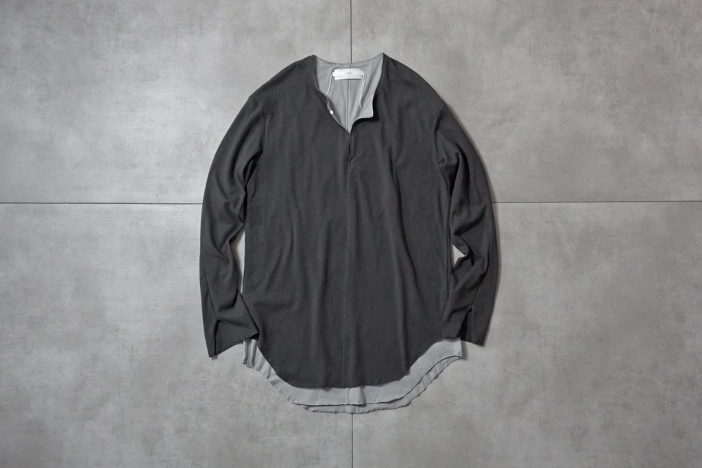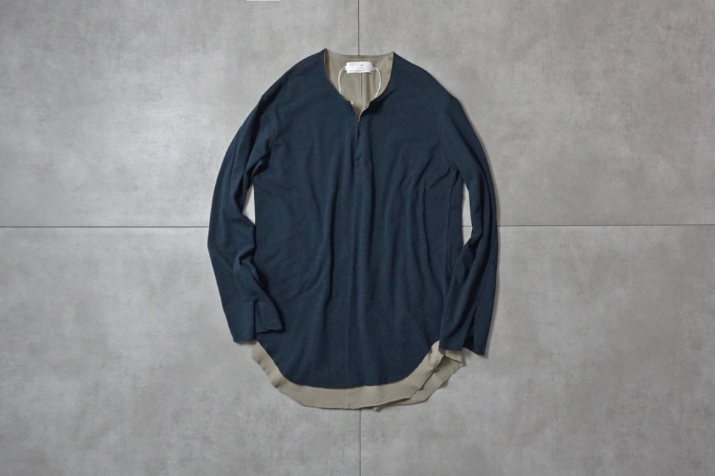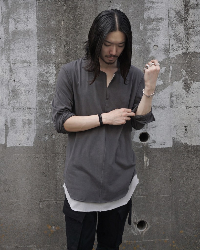 昔からのお客様はご存知かと思いますが、ブランド創設時からリリースをしていたまさに原点ともいえる作品。1枚で透け感を気にせず着用できる合理性、細身のパンツにも相性の良い縦長のフォルム、無駄を削ぎ落としたミニマルな形、レイヤーのギミックがもつ少しのアクセント。チュニックをひたすら作り続けているメンズブランドもそうそうないと思いますが、ASKYYの象徴でありアイデンティティとも言える不屈のアイコンとなります。