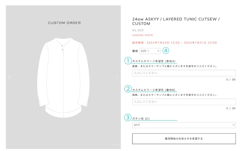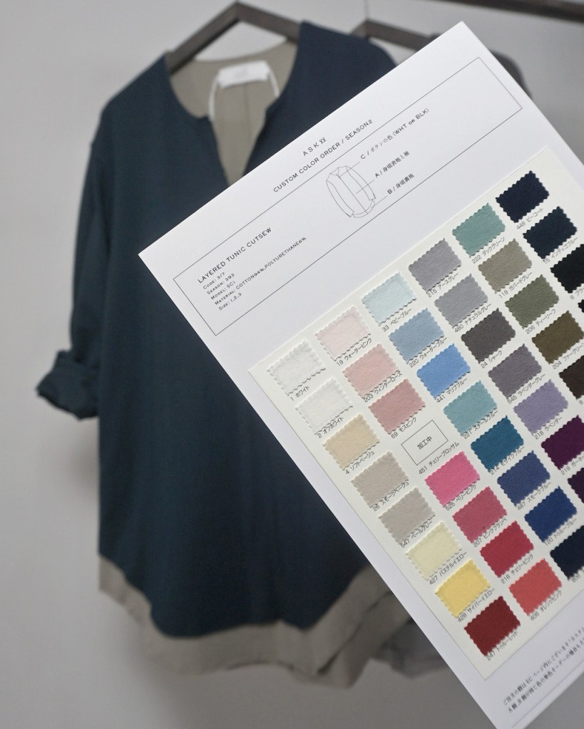 制作は約3ヶ月頂きますが、「レイヤードチュニックとしてのカスタムカラーオーダー」は今後ありませんのでこの先の数年を視野に入れゆっくりお考えくださればと思います。店頭では2色のサンプル、カラーサンプル帳もご準備しておりますのでお気軽にお越しください。