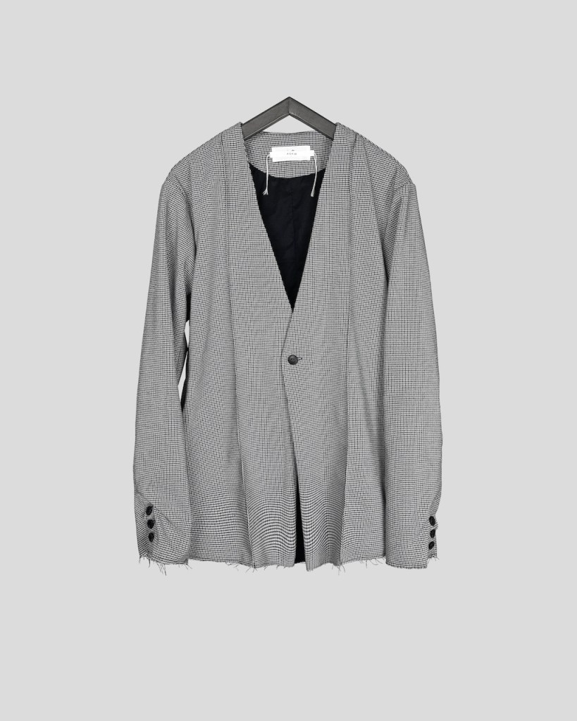 テーラードで見られるノッチドやピークドなどの襟を排除したASKYYらしいミニマルな形。