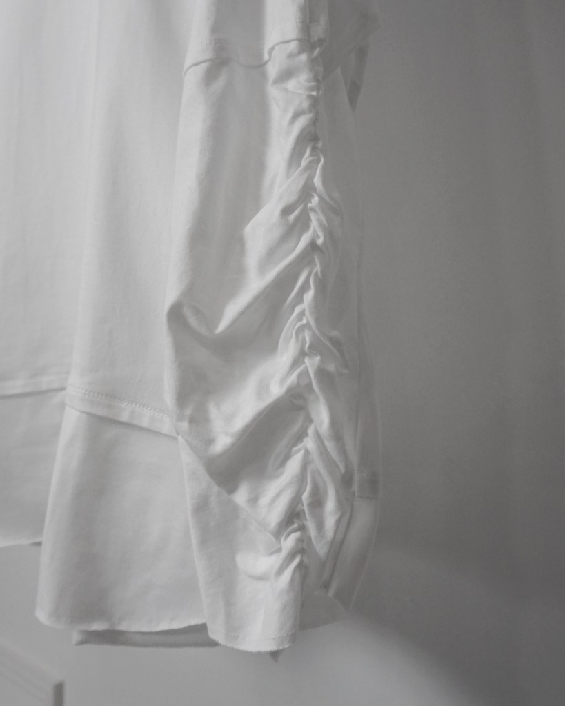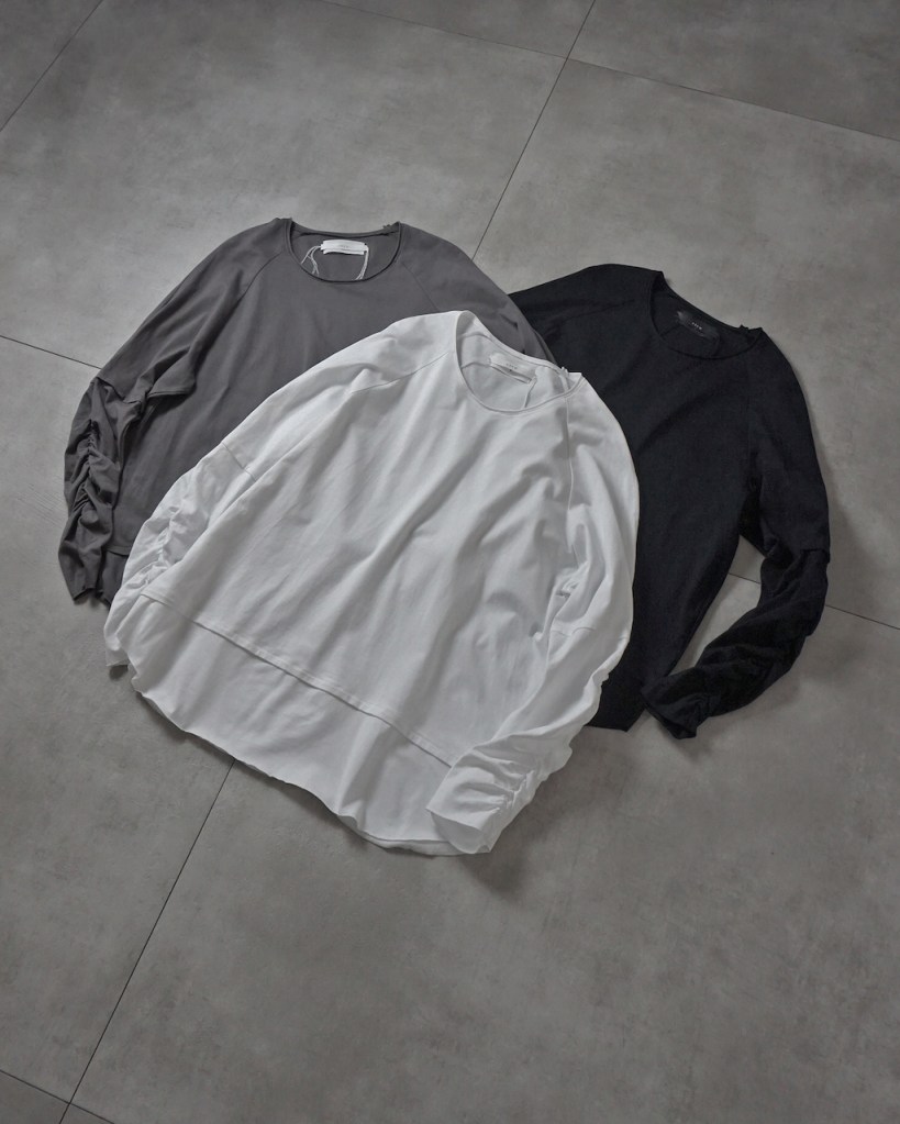 ラグランスリーブのリラックスした印象を引き締める緩急。シワ感と溜まり感こそ今作の持ち味となります。ギャザーを仕込んでいない限り、この独特の立体感は生まれませんよね。