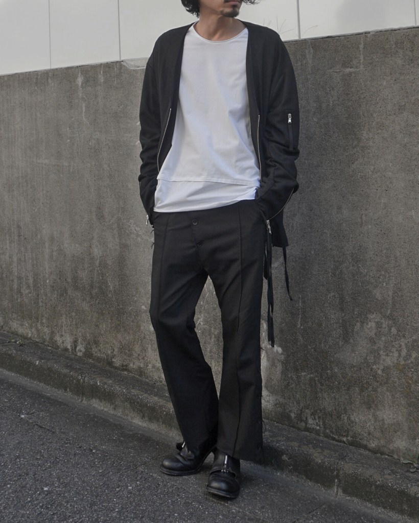 ミリタリーな気配もあるのでカーゴパンツあたりでもいいですし、ゆるめのスラックスで合わせるのも気分です。冬に着用する細身のレザーやコート類も素材が薄い分嵩張らずにいけます。