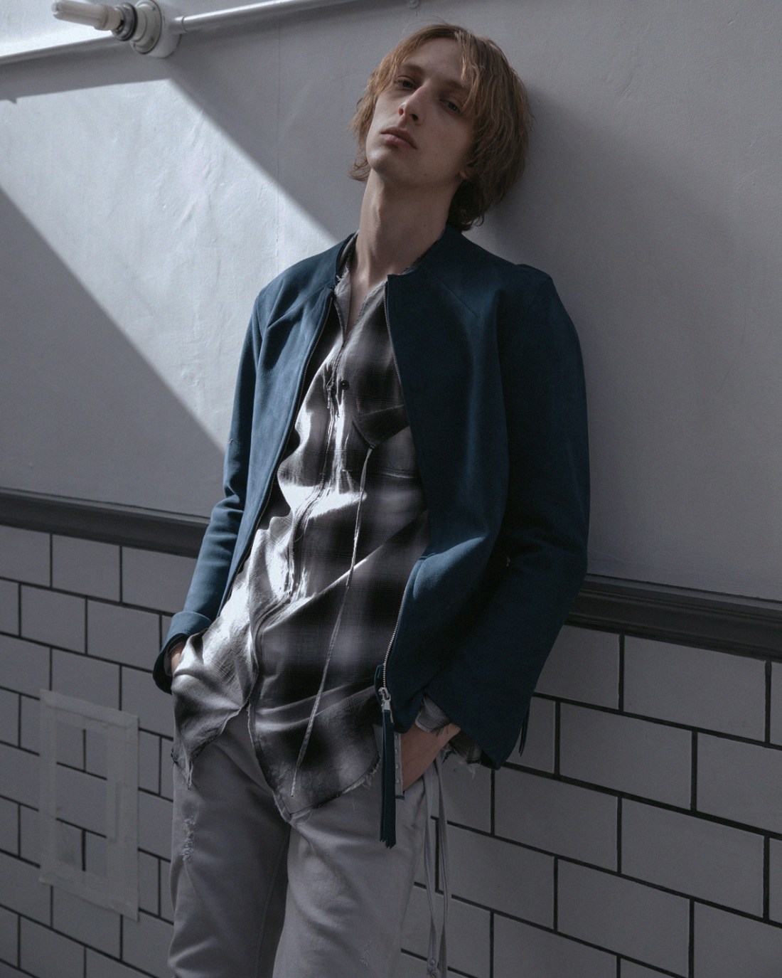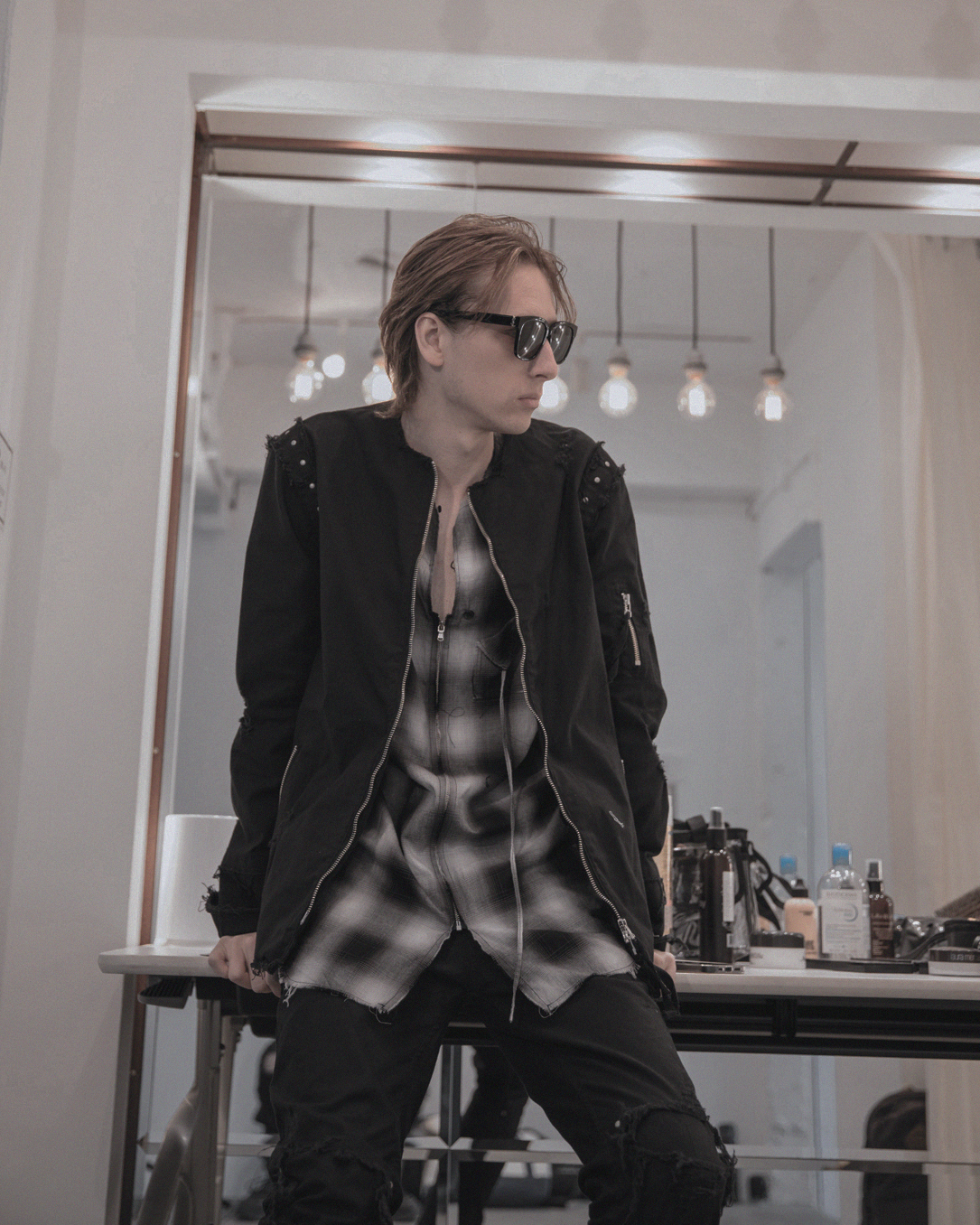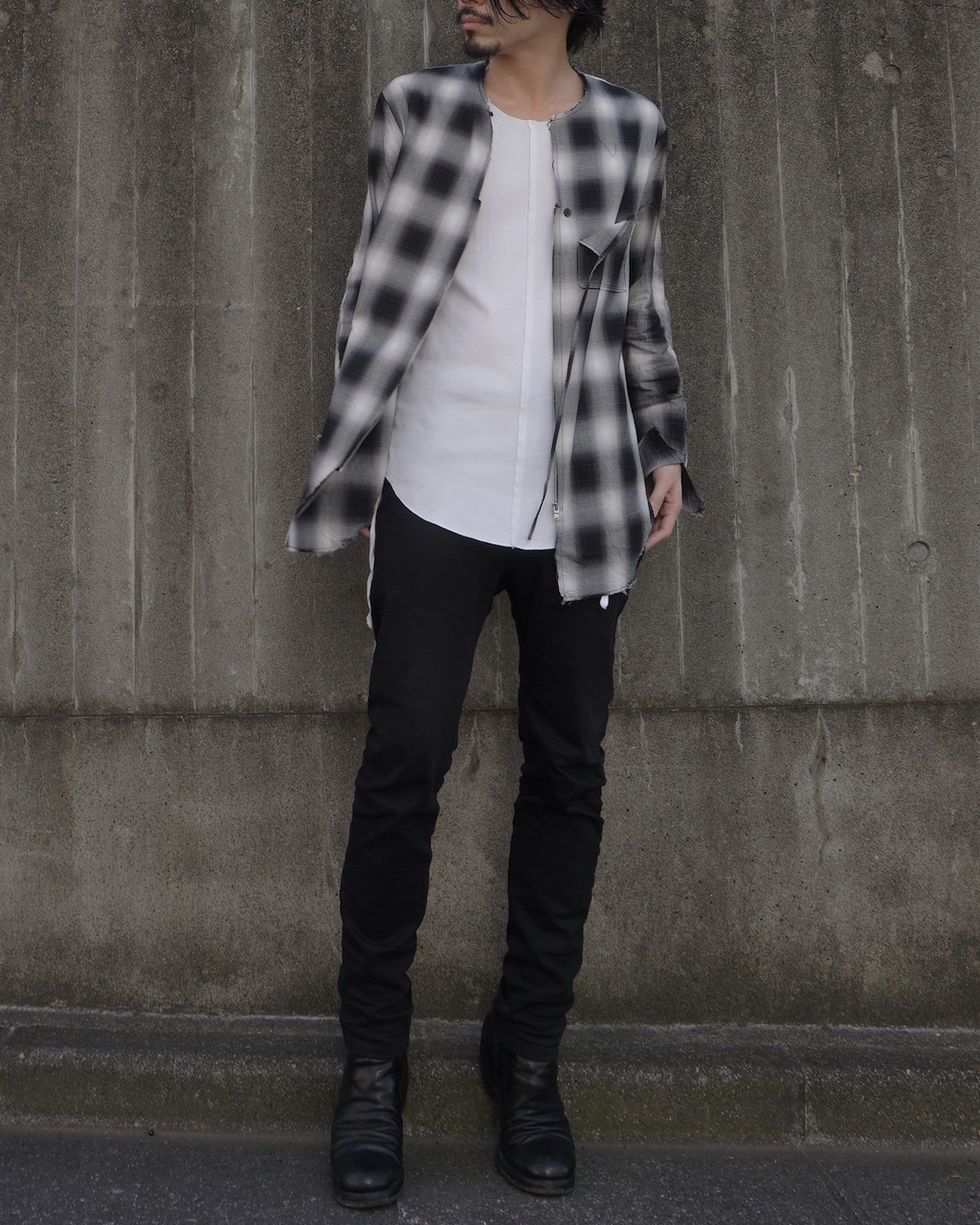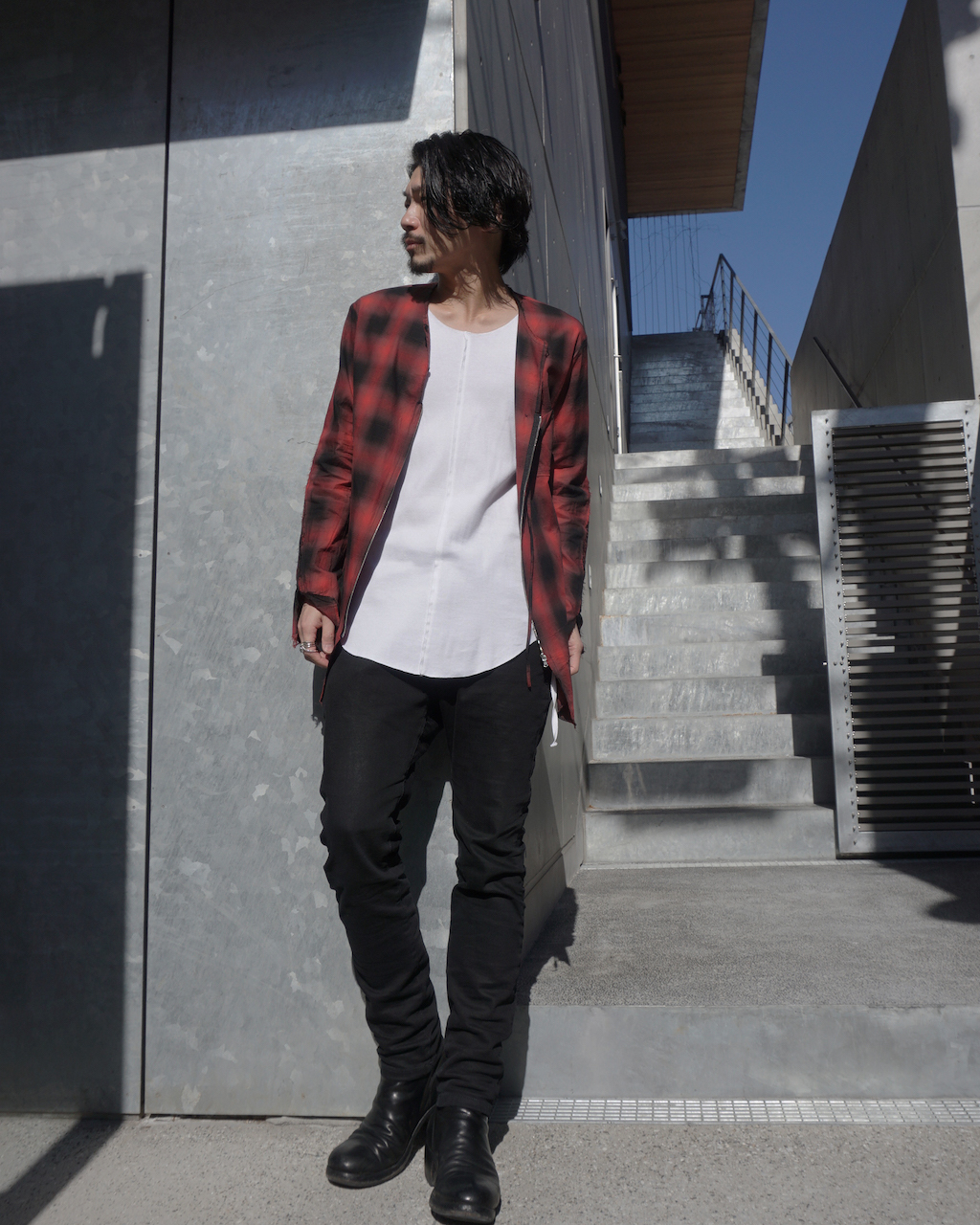 それこそ桜井さんのように秋冬はライダースの下に仕込んでいただいてもアクセントになります。モノトーンベースなのでアウターが色物でも成立。うちのLOOKでは割とロックに寄せたスタイリングを組んでいました。
