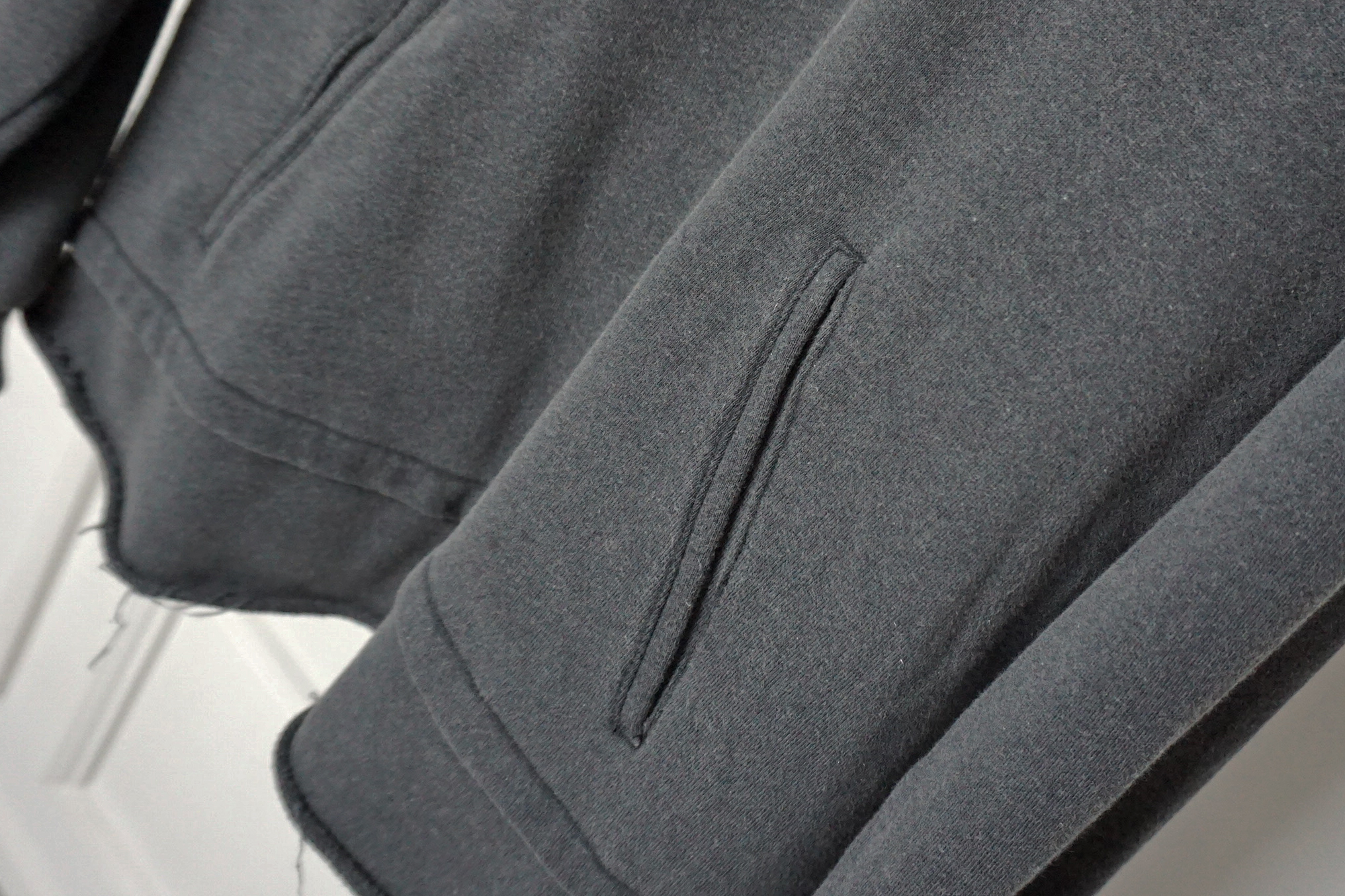 ポケットはカンガルー型でなく玉縁仕様で小綺麗に。