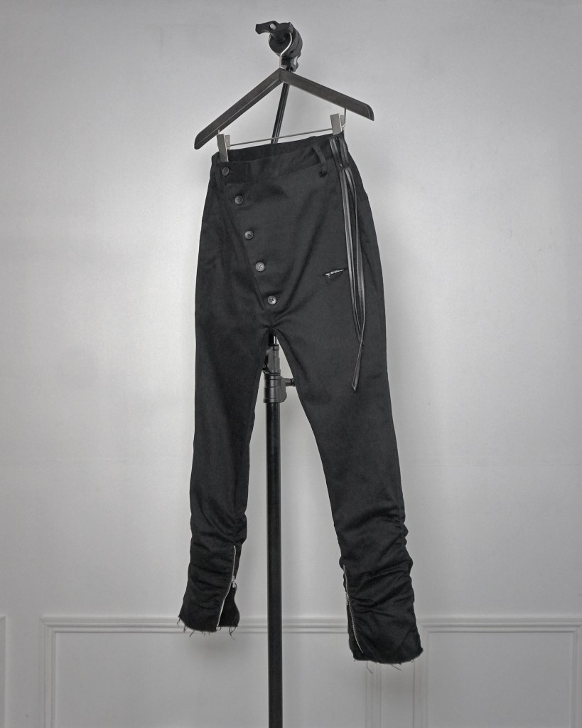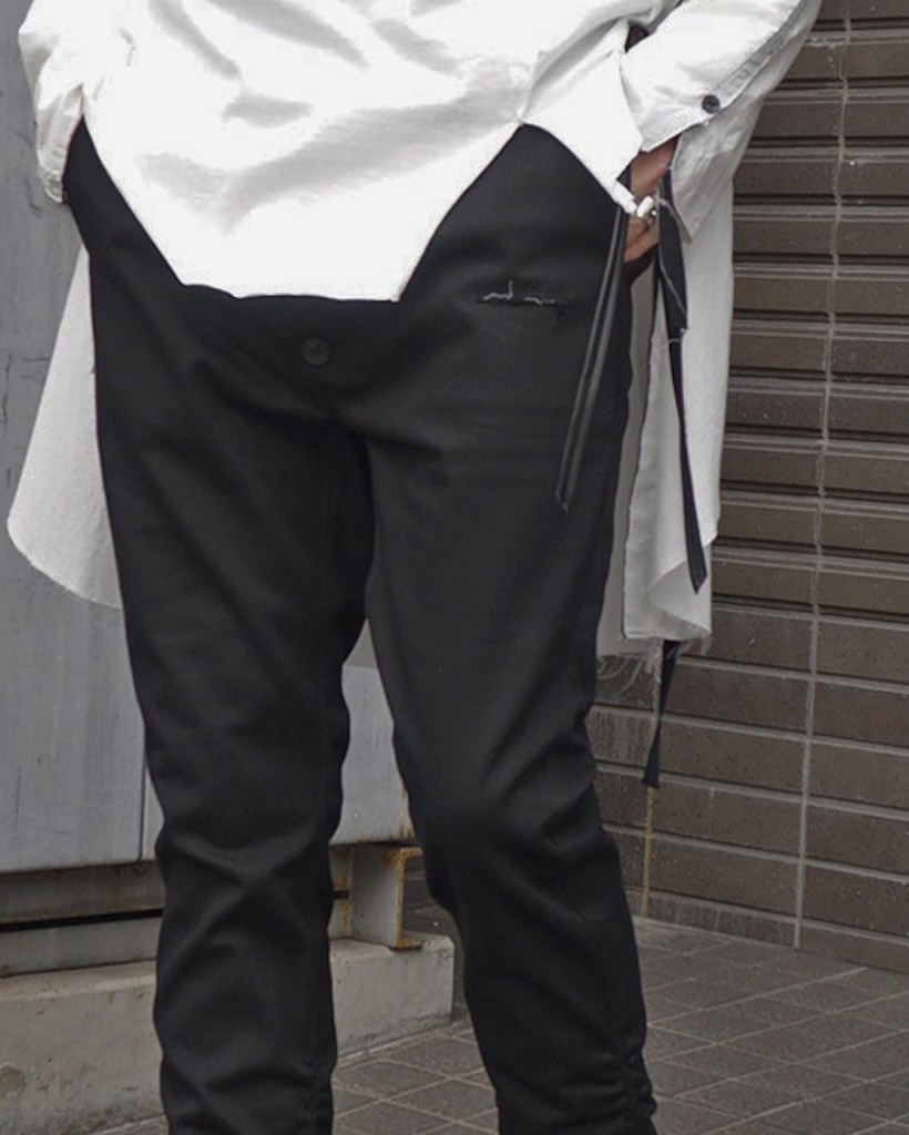 「ナポレオン」という名称たる所以はフロントに整然と並ぶボタンから。斜めになっておりますが、裏面にもパネルを設けておりますので下着が見えたりなど諸々の不安は解消しています。トイレの時は多少お手間ですが、快適求めるならスウェットパンツでいいやってなりますからね。律されるようなおしゃれ心は忘れたくないものです。