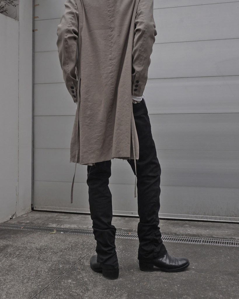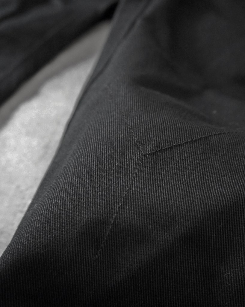 いつものようにそれだけで終わることも出来ました。しかし学びは死ぬまで続けます。設計上だけではなく、縫製の段階でもシワを作って縫い込む。膝から裾にかけてシワの強弱のグラデーションを作る という工場さん泣かせな仕様を実現。そういった見えにくい部分にも注ぎました。