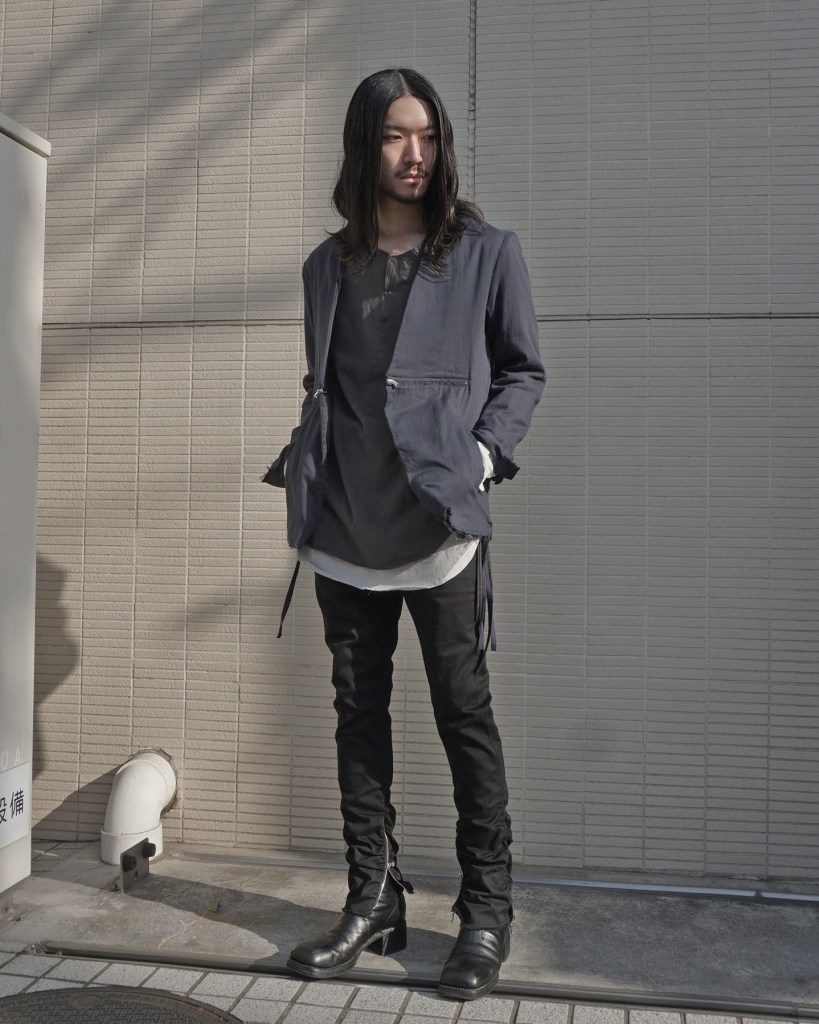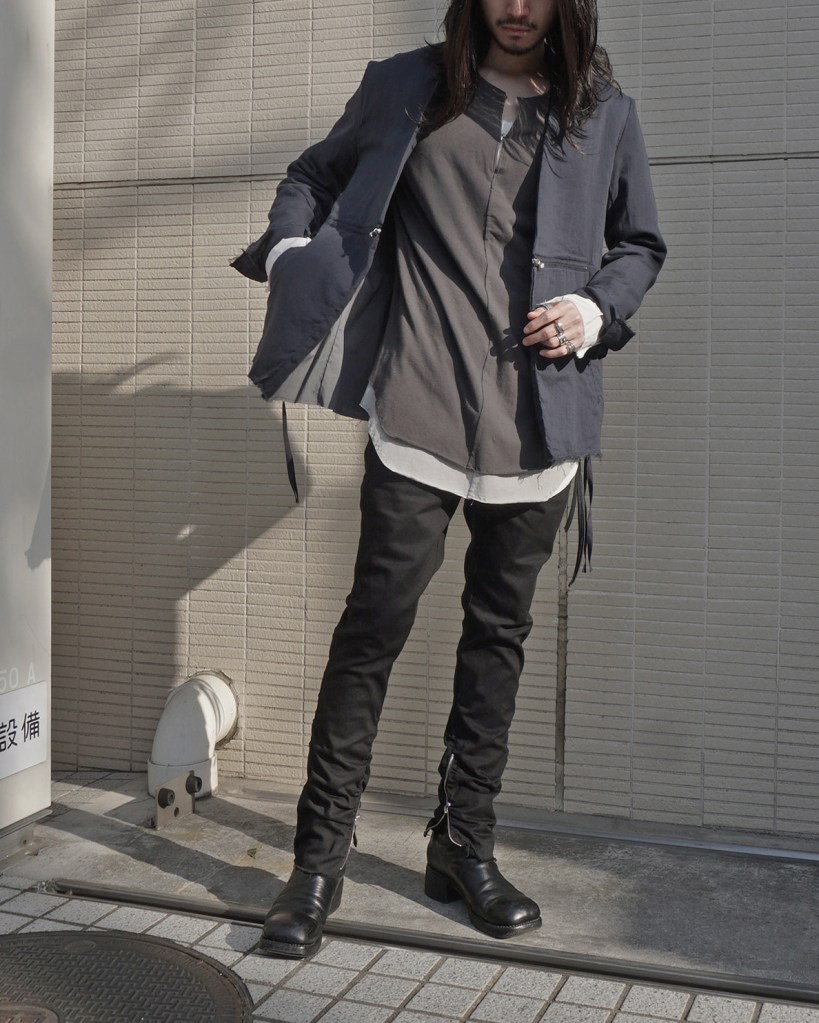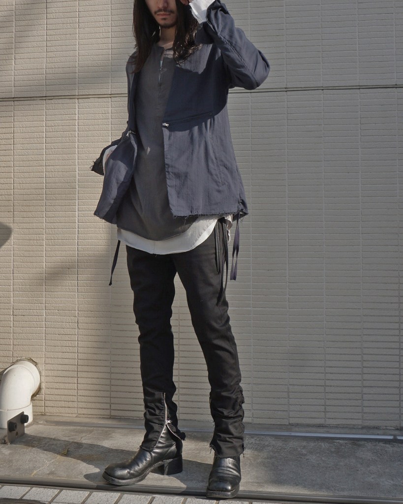 インナー、パンツに明るめの色を合わせるとフロントジップの尖りも和らぎます。