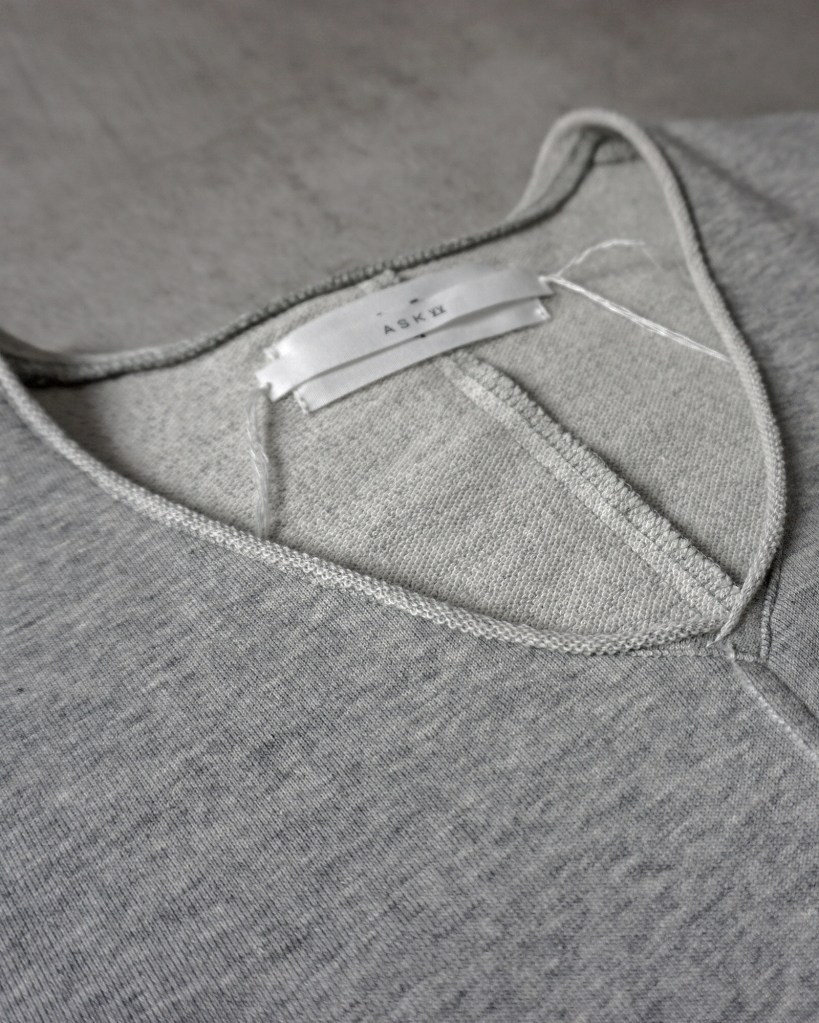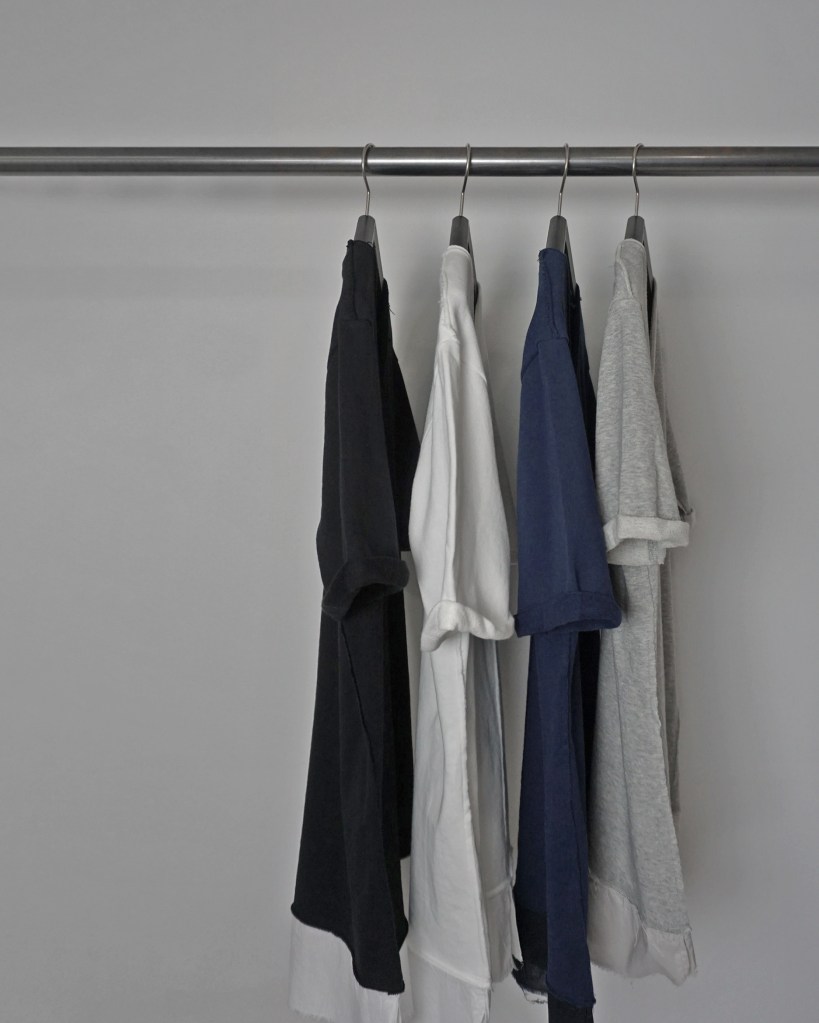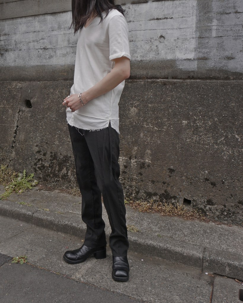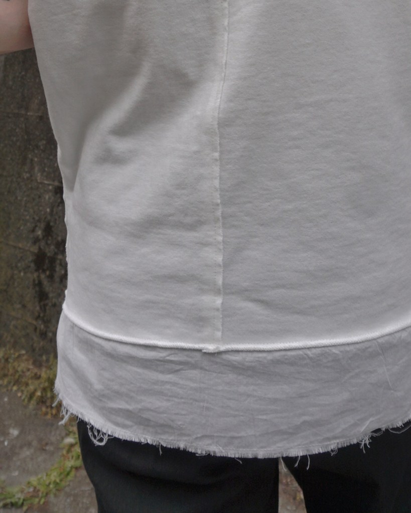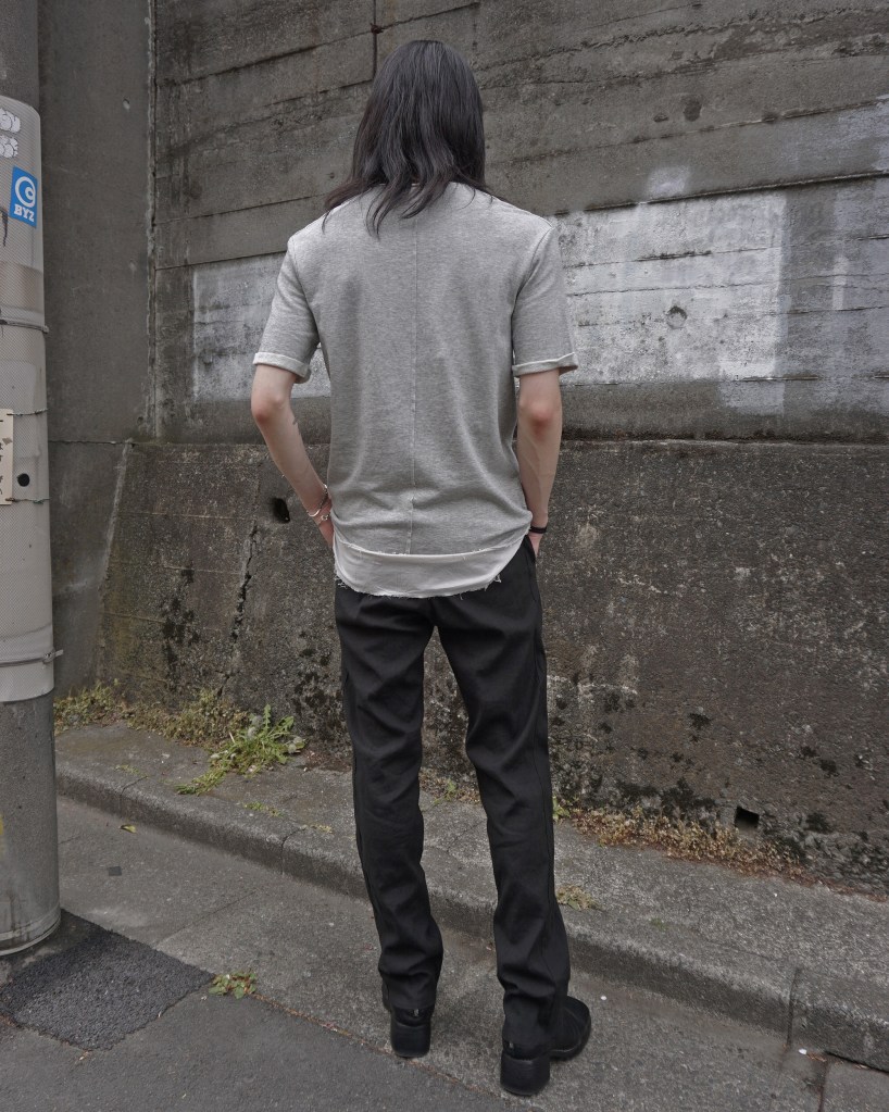 見た目は確かにスウェットなのですが、いい意味でペラペラといいますか。スウェットのいいとこどりしたみたいなやつ。でも透けないいいとこどり。切りっぱなしのギミックもカットソーでは出すことの出来ないグランジ感がいいですよね。