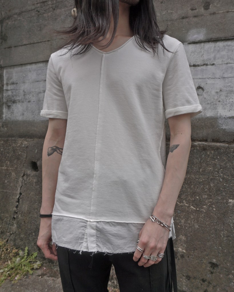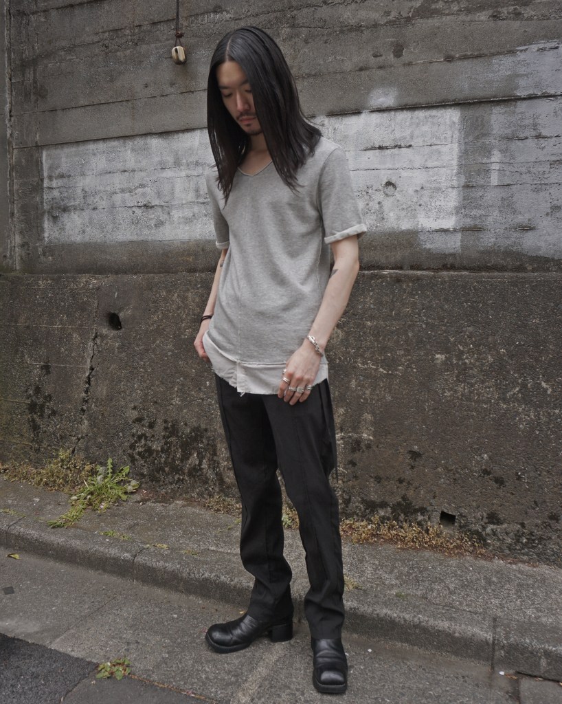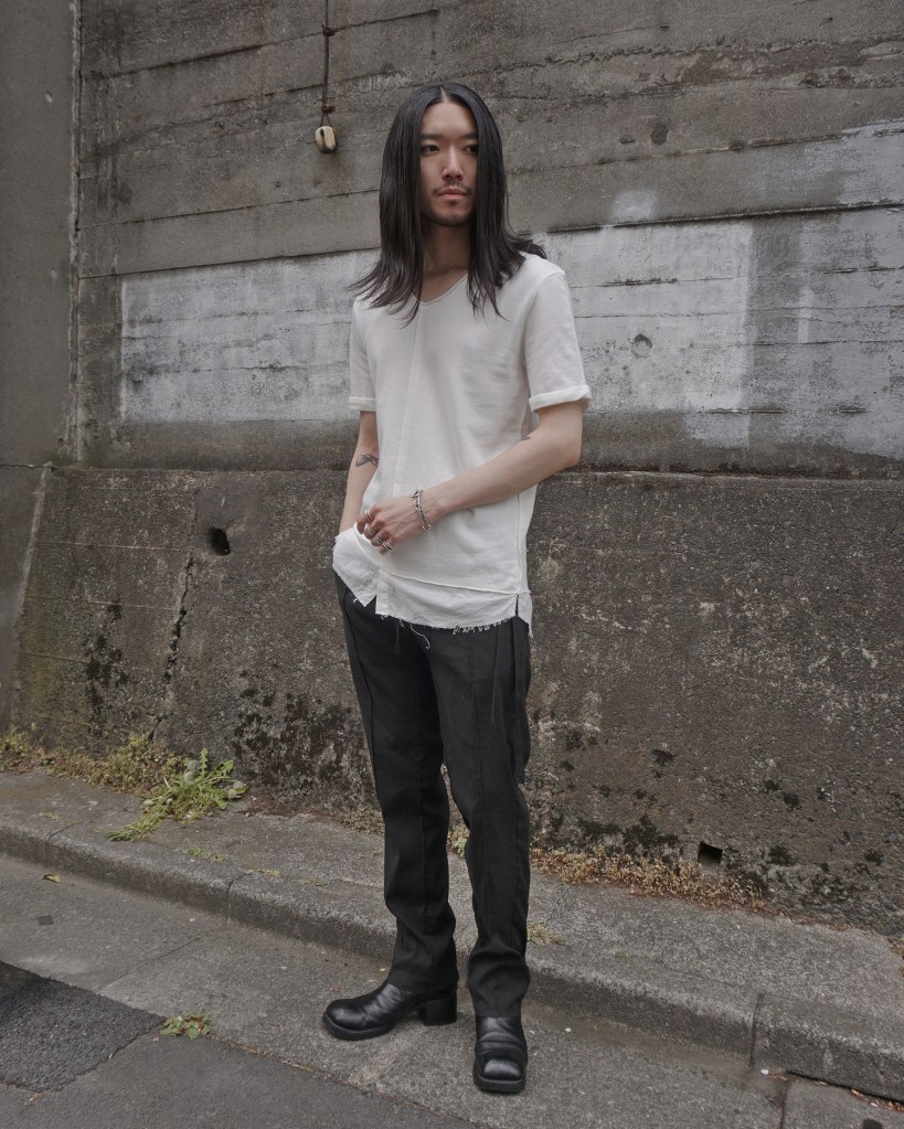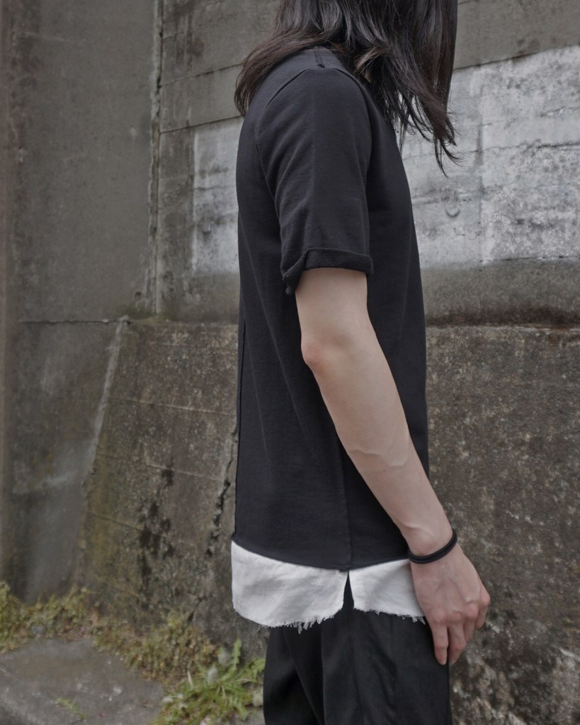 従来の定番レイヤードカットソーとは対極にありつつも、こちらのノーレイヤードカットソーは自由度を高めデザイン性の部分で遊びを加えていくライン。お互いの相互関係があることでそれぞれがなくてはならない両軸になってくれればと思い創りました。月と太陽で例えるならば、従来のものが太陽の光の陽の部分で今作が闇の部分の月でしょうか。