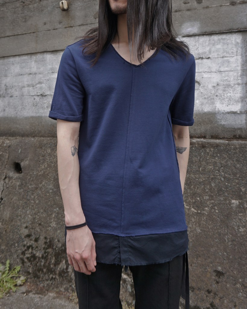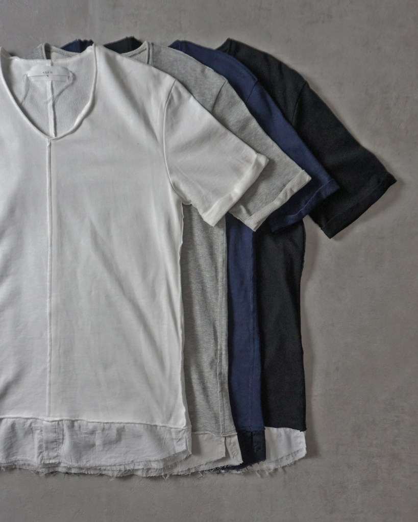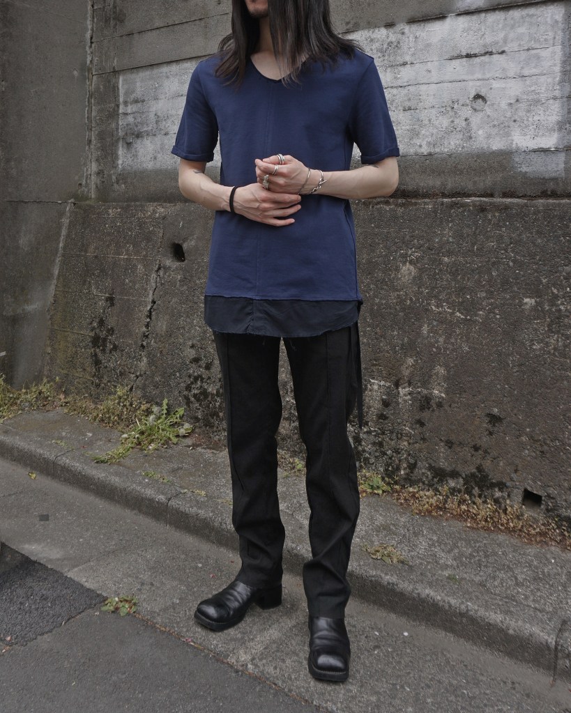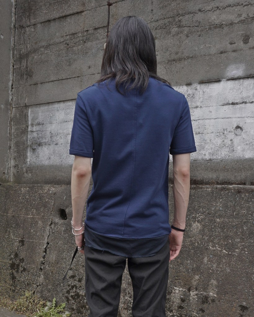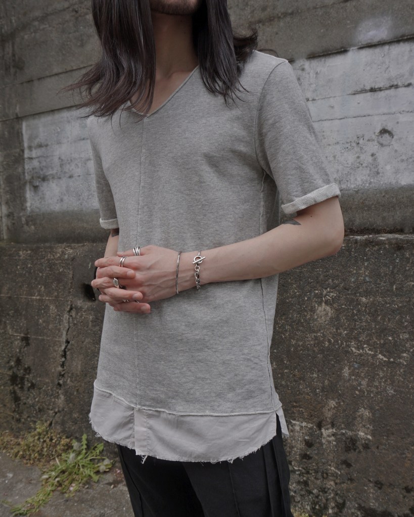 従来の定番レイヤードカットソーとは対極にありつつも、こちらのノーレイヤードカットソーは自由度を高めデザイン性の部分で遊びを加えていくライン。お互いの相互関係があることでそれぞれがなくてはならない両軸になってくれればと思い創りました。月と太陽で例えるならば、従来のものが太陽の光の陽の部分で今作が闇の部分の月でしょうか。