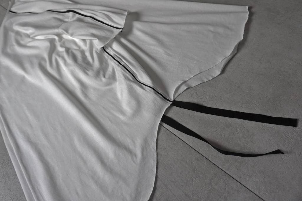 肩から袖にかけてのリボンと脇から裾にかけてのリボン。
