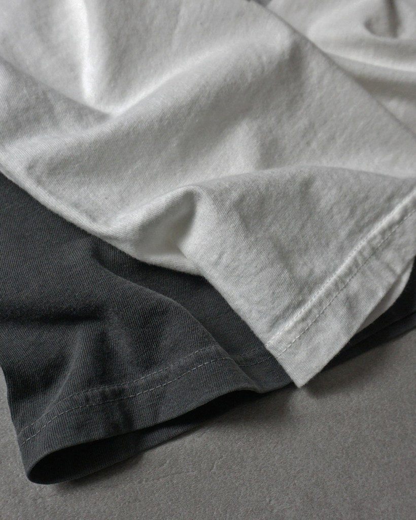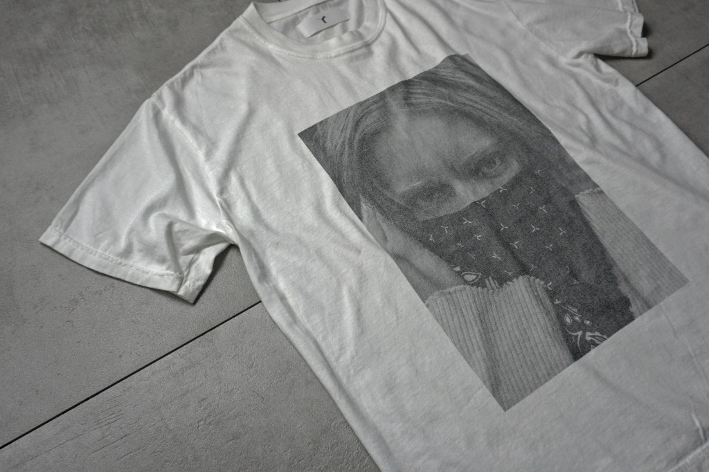 また、色によってプリントの仕様と印刷方法を若干変えてるので白は着古したぐらいまで写真をフェードさせました。これが仮にコントラストきつめのプリントですと印象が強くなってしまいますからね。何回も洗濯されて乾燥機につっこまれたような枯れ具合がいい。